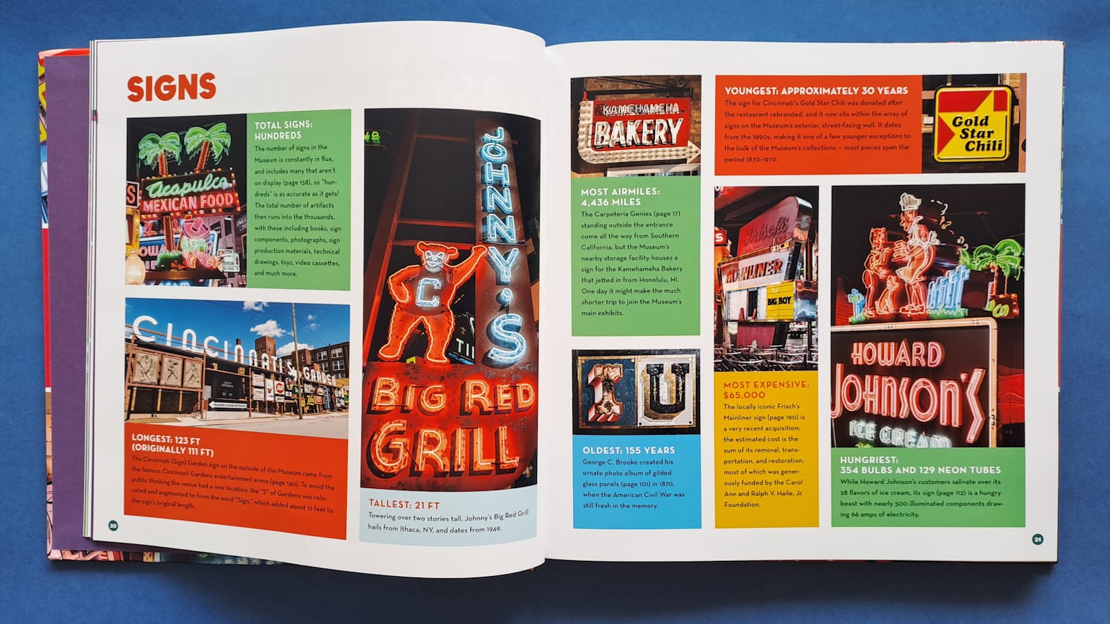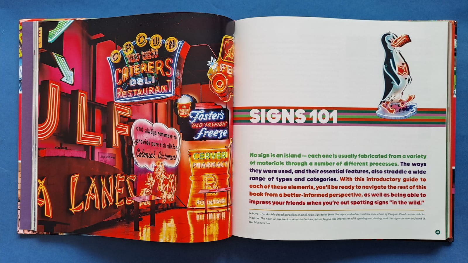 Each of the main sections opens with a double-page spread featuring dazzling snapshots of the riot of signage that visitors experience when they walk through the Museum.