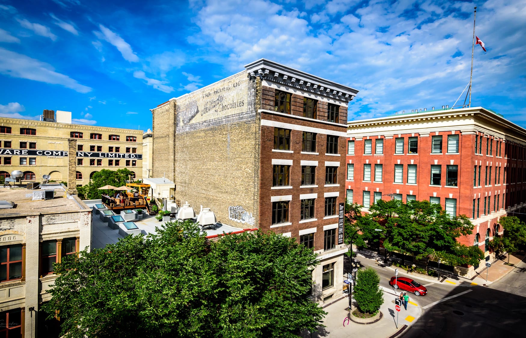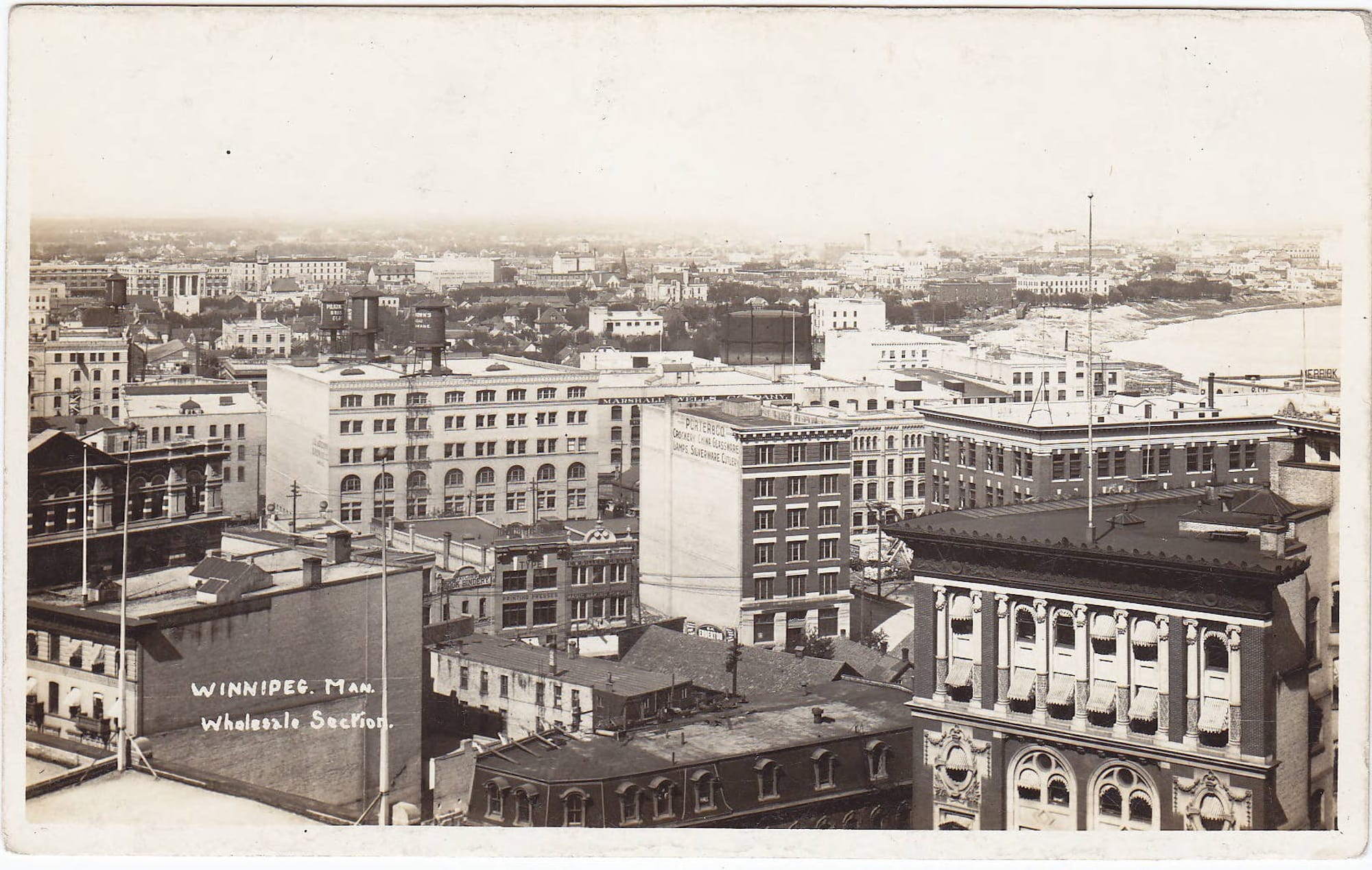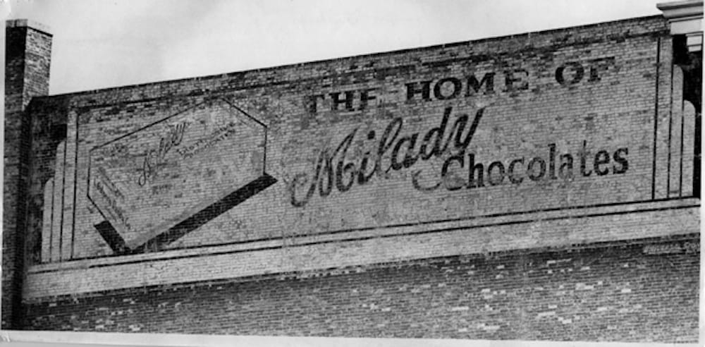Detail from the Lyall Commercial Photo Co. postcard, and an archival photo of the Milady Chocolates layer.