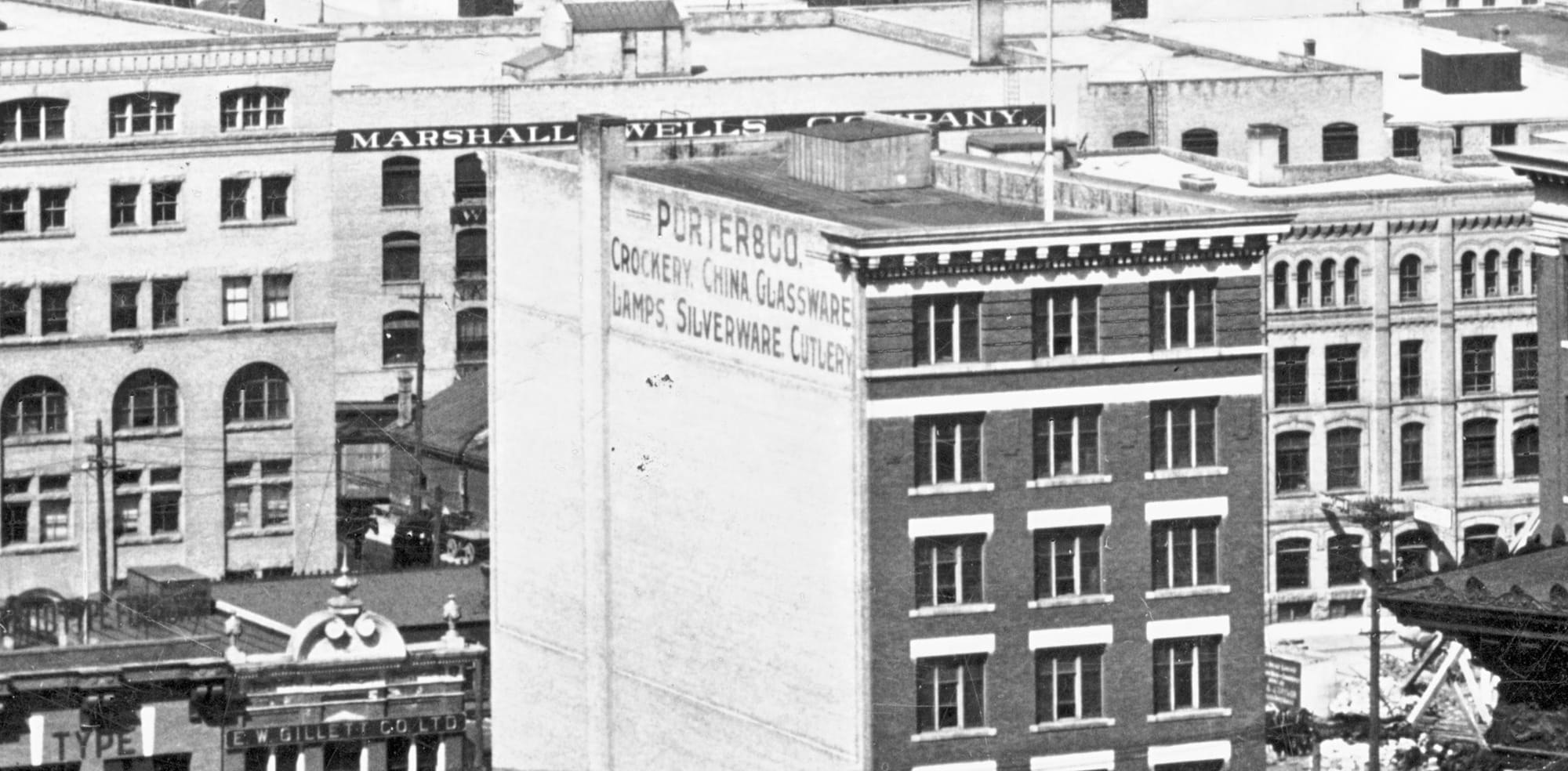 The ghost sign by day, photographed by John Giavedoni, and the view in 1911 from a postcard published by Lyall Commercial Photo Co.