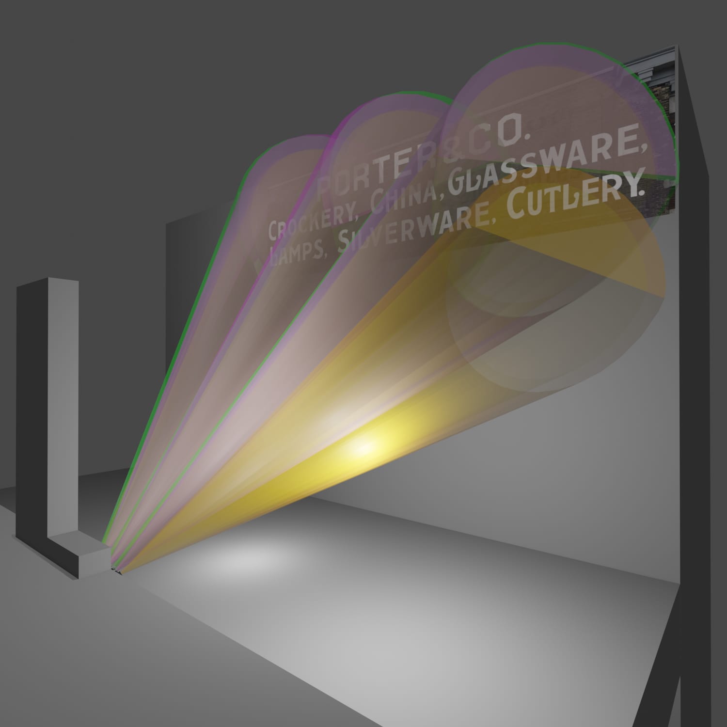 The rig of projectors, and a mock-up of the 'throw' for each one.