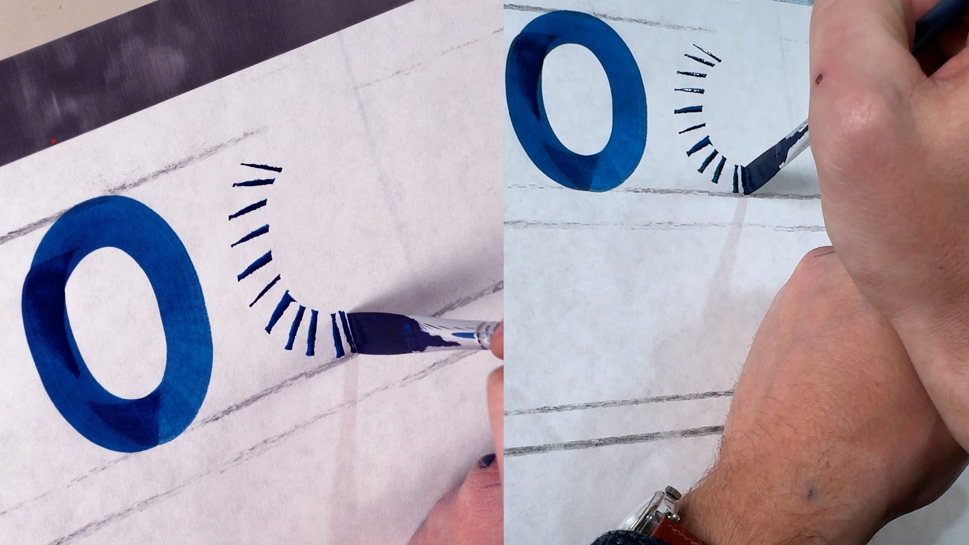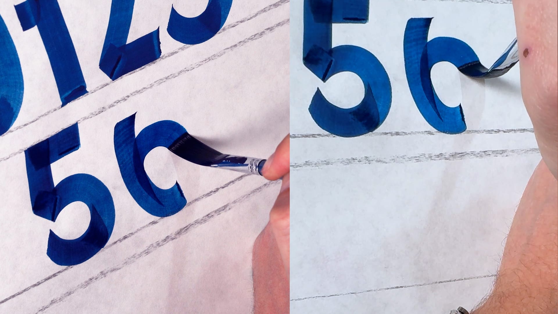 These videos are filmed with a split screen to show the brushwork from different angles. Peter offers tips on how to balance individual letters with stroke length and counterspace (negative space), and also demonstrates numerals and punctuation, a welcome lesson that isn’t always guaranteed in lettering instruction.