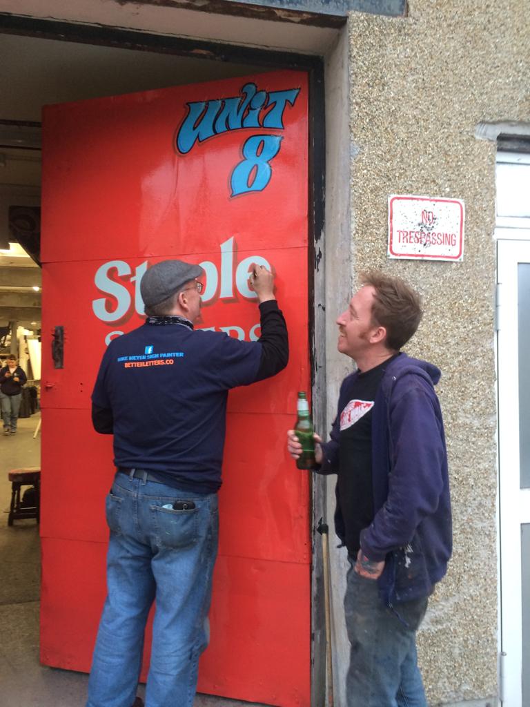 Mike Meyer and Cooper in conversation at the Dapper Signs studio in 2016.