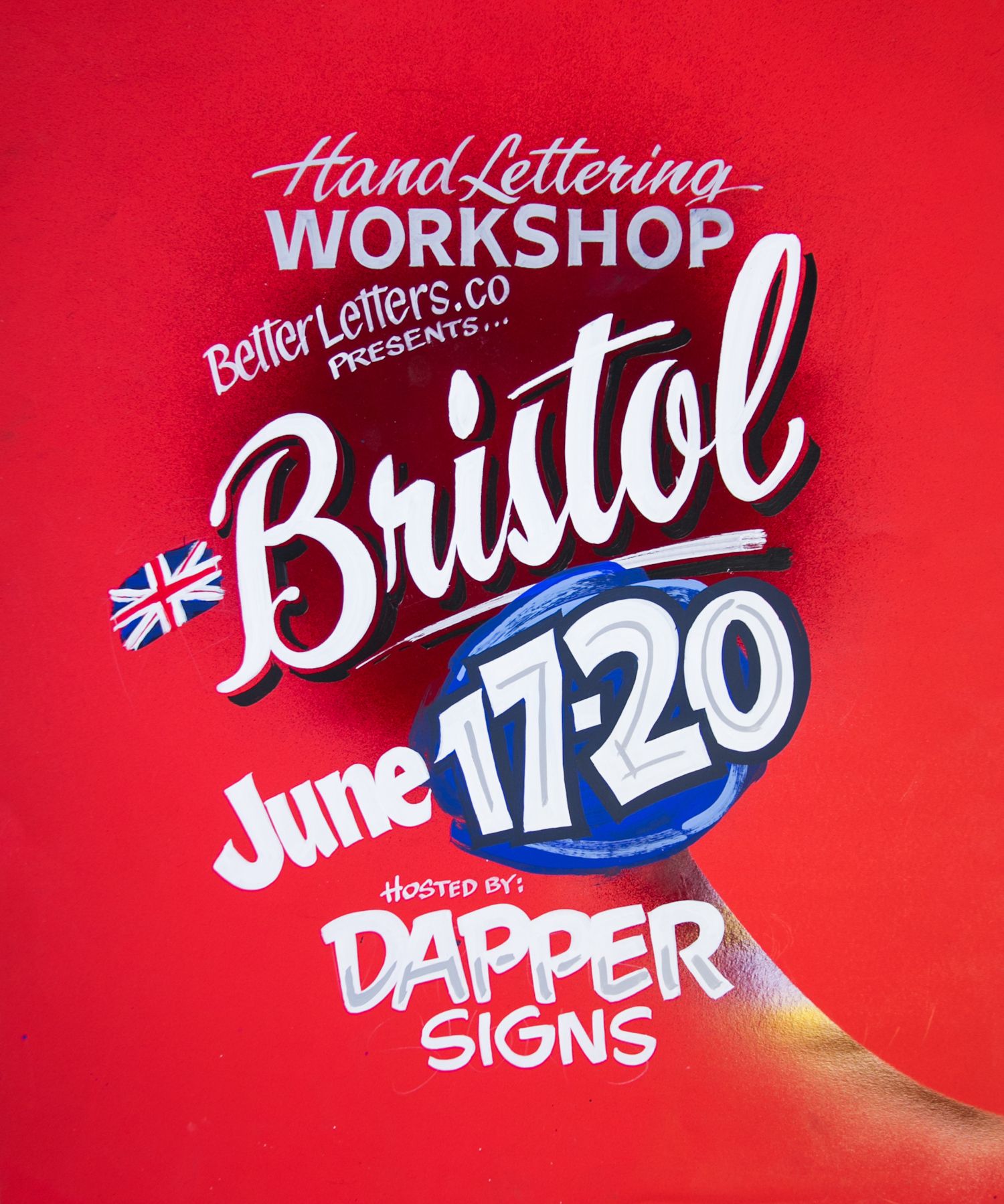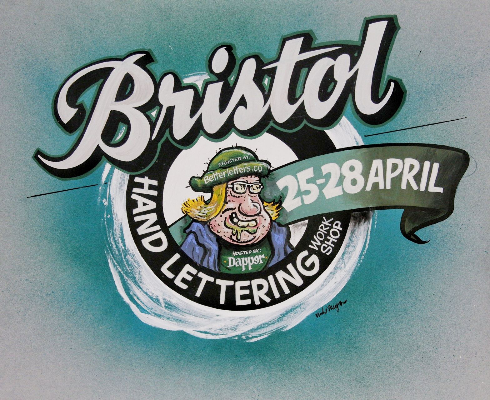 Showcards for Mike Meyer's 2017 and 2019 workshops in Bristol, hosted by Katie and Cooper at Dapper Signs. In The Showcards Book, Mike commented on the portrait of Cooper: "The character is inspired by the British magazine Viz and I knew I could do it because Cooper and Katie don't care about shit like that. Cooper said to me 'Wow, you've nailed it. That's me!'"