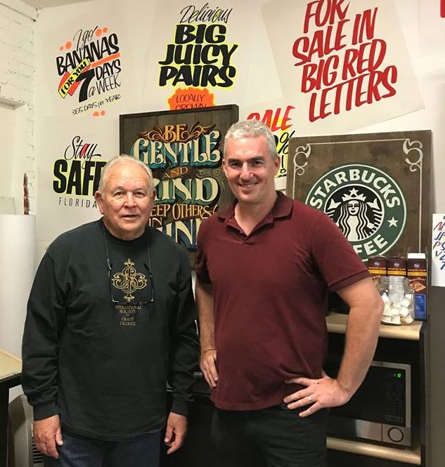 These are just two of Doc’s alumni who can testify to the man’s impact on their lives and work. There are countless others and the outpouring of tributes following his death (see below) made it clear that he was so much more than a teacher to so many. He was a mentor, a father figure, and an inspiration to generations of sign painters who now carry his legacy, and lessons, forward in their own work.