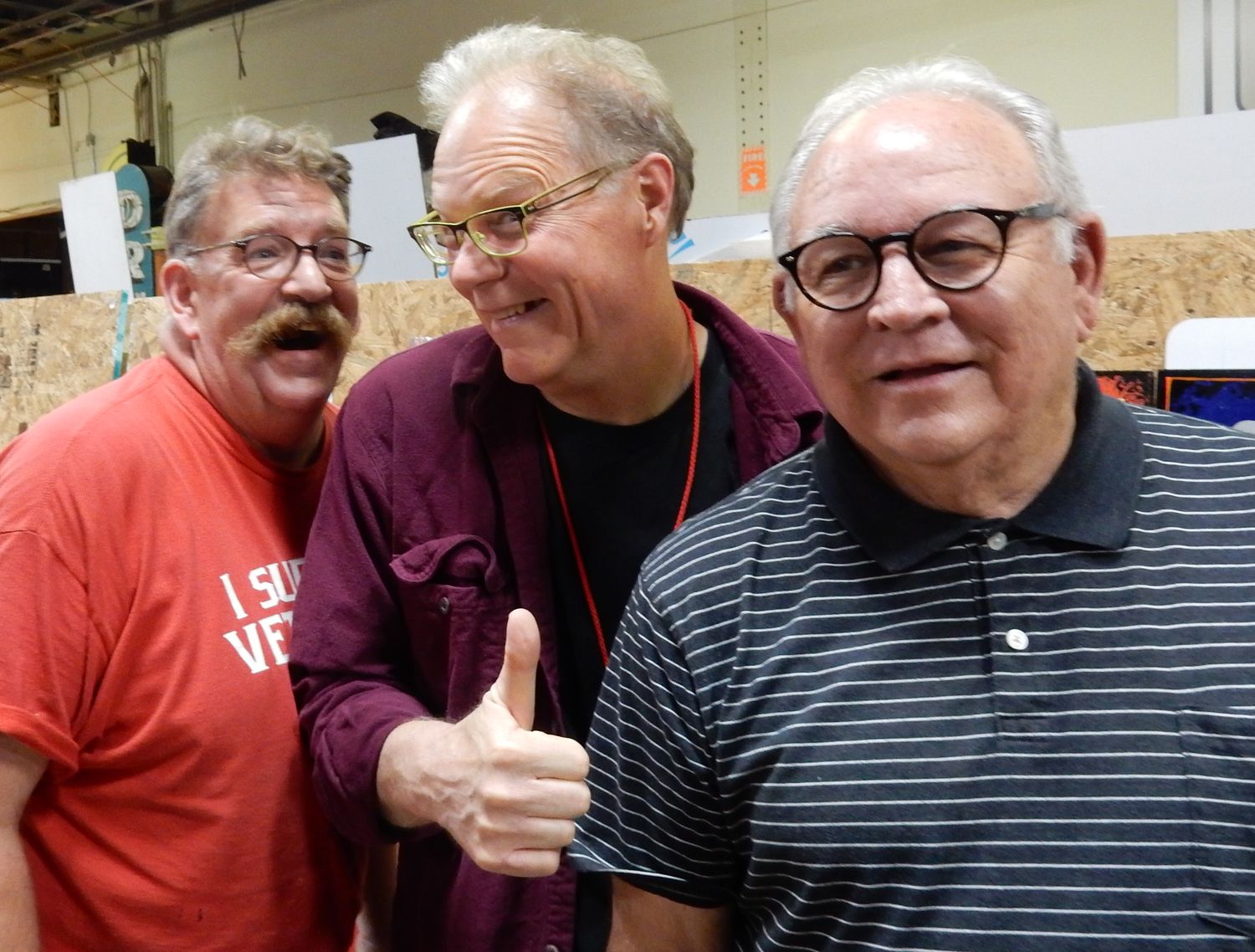 Doc Guthrie with John King in Los Angeles (left) and with Mike Meyer and Jeff Williams at the 40th anniversary Letterheads meet at the American Sign Museum in Cincinnati, 2015.