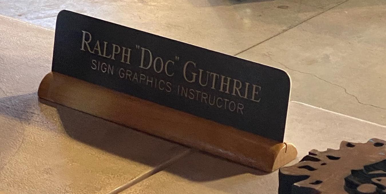 Richard Ernest speaking at the event to celebrate Doc Guthrie's life, and Doc's Sign Graphics Instructor table-top name plate. Photos: Andrea Silver.