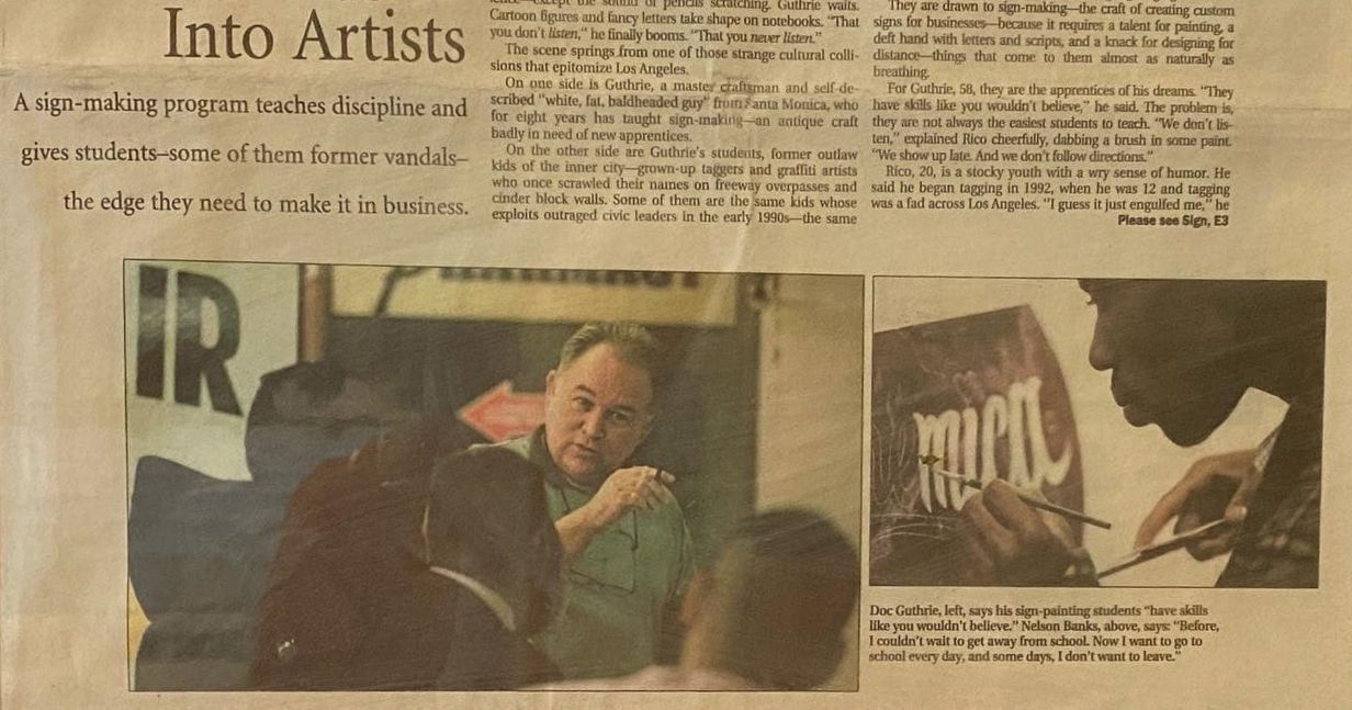 In addition to his sign work, Doc taught reading to adults with an organization called Cal Lit. This experience played a small part in facilitating his transition from sign painter to sign painting instructor, which started with him teaching the night class at LATTC. This was at the suggestion of his former teacher there, Richard 'Ernie' Ernest, and in 1992 Doc took over from him as the lead instructor on the Sign Graphics Program.