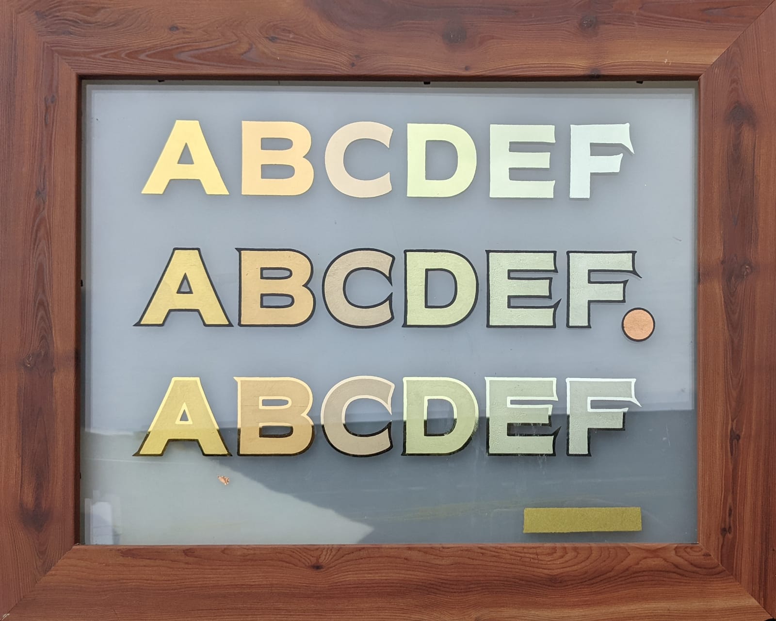 After reading the piece on the gilding samples at the American Sign Museum, Andrew Lawrence of Gentleman Scholar Signs shared this panel. Setting everything on a single piece of glass makes it very portable, and leaving the background clear means he can hold it up on windows to talk with customers about what will work best.