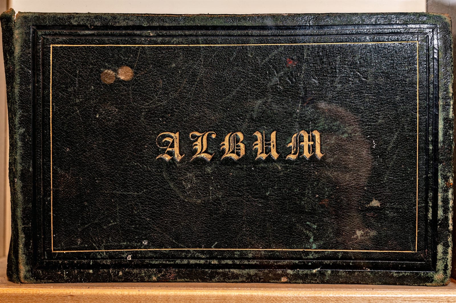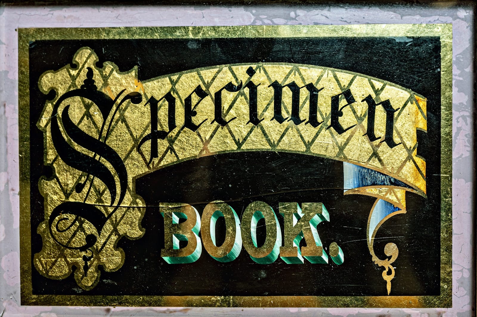 The cover of the photo album that Brooke used to present his set of gilding samples, and the ‘Specimen Book’ panel that named it.