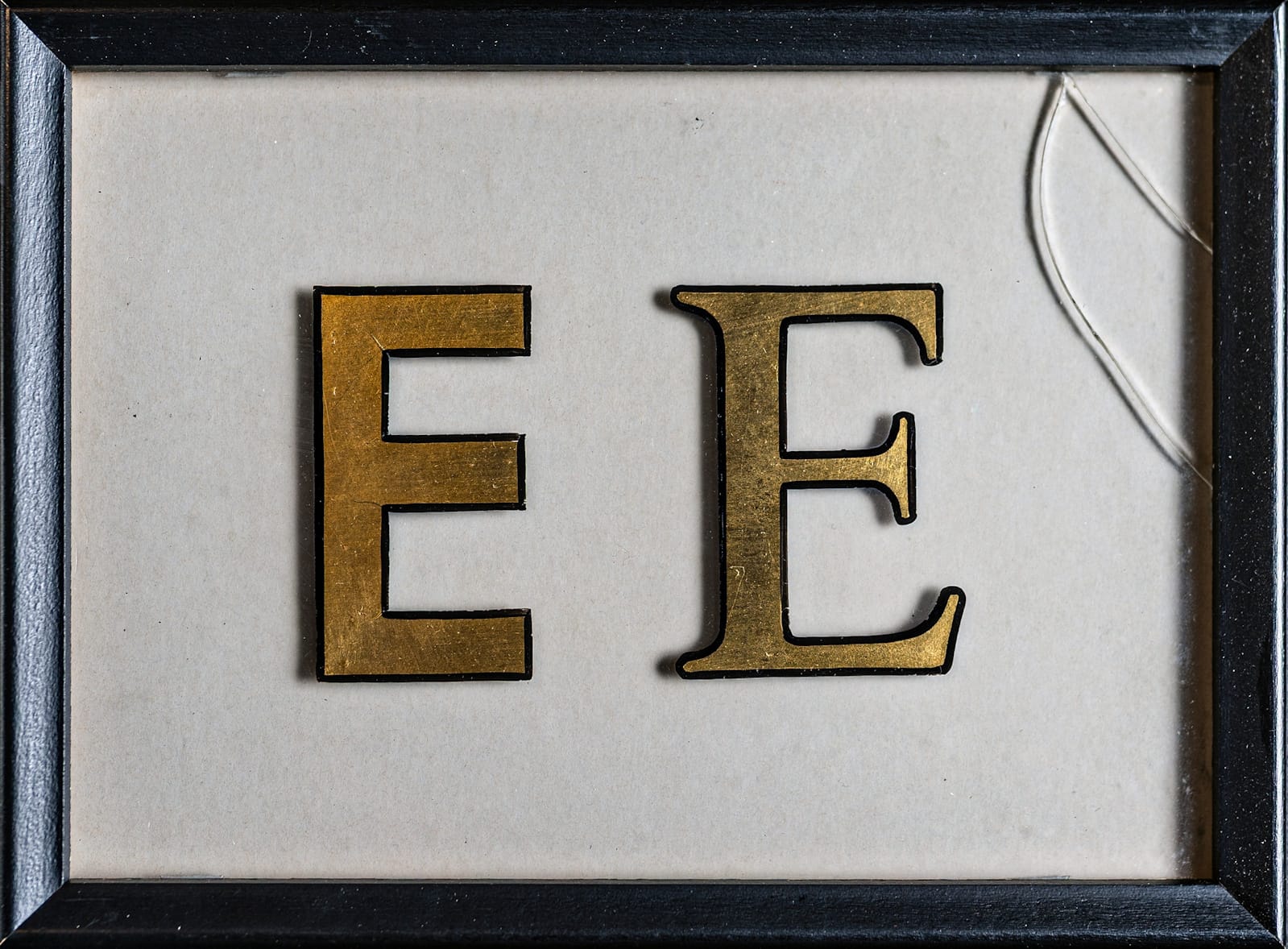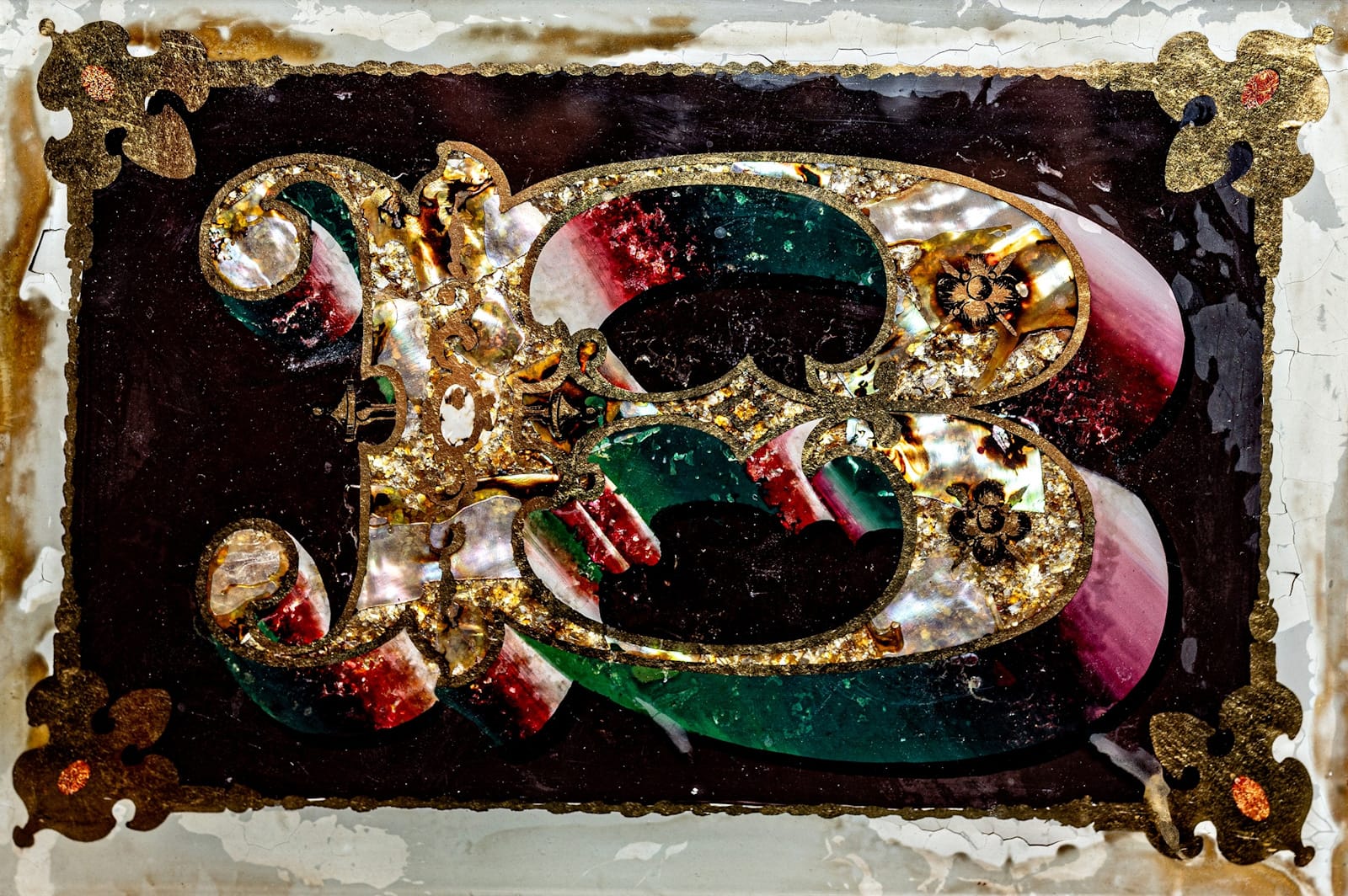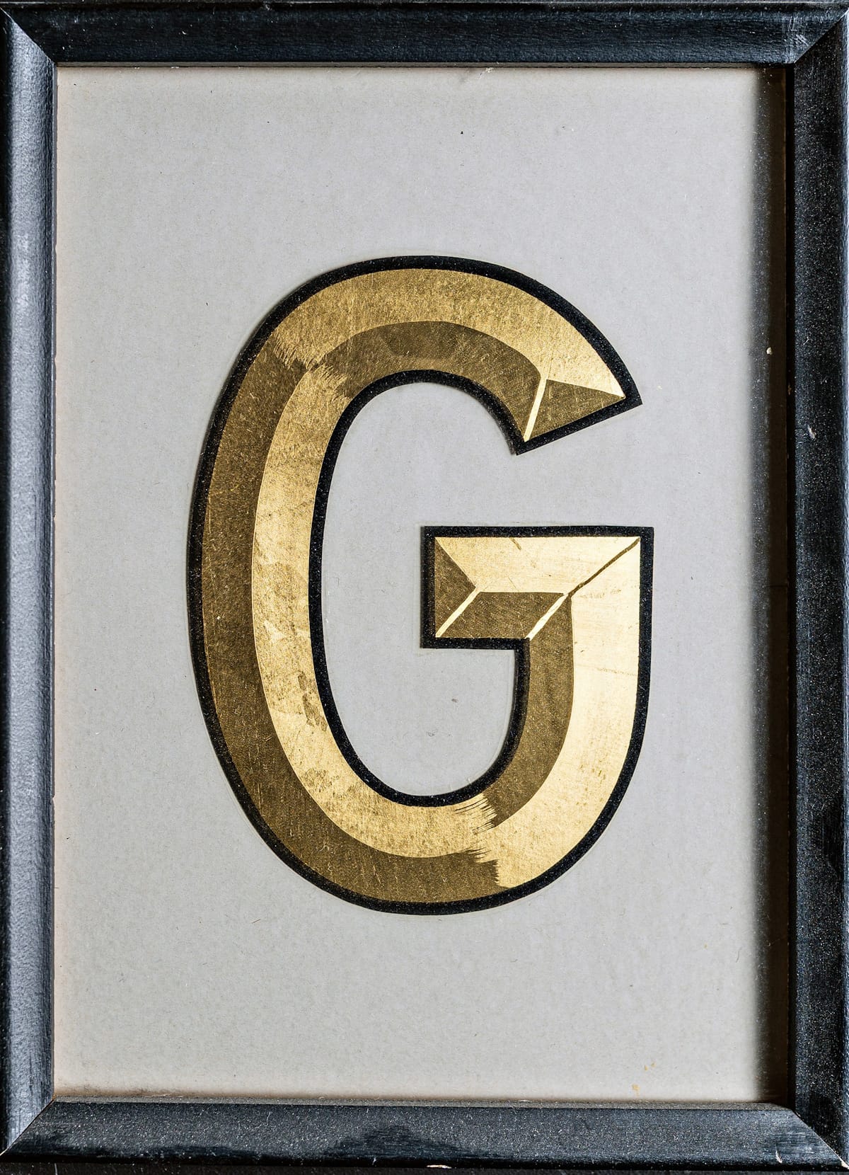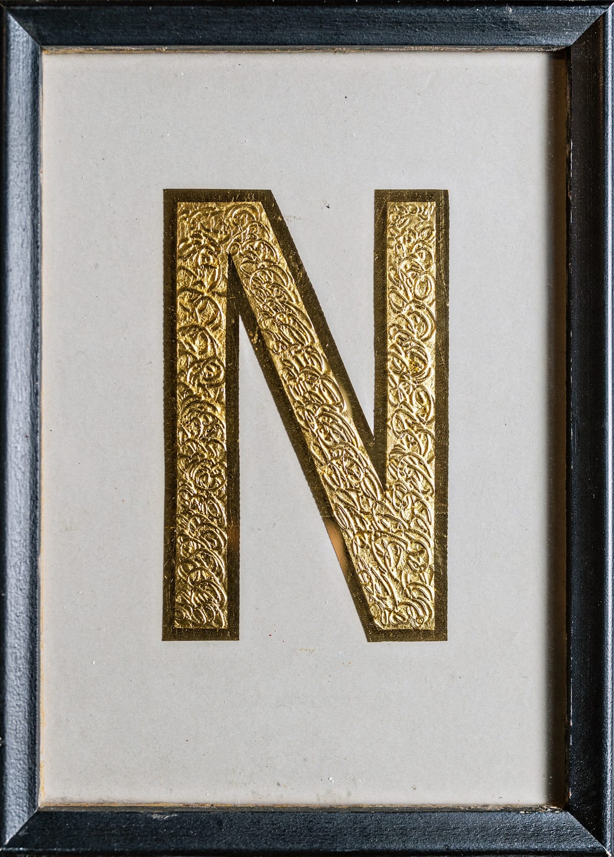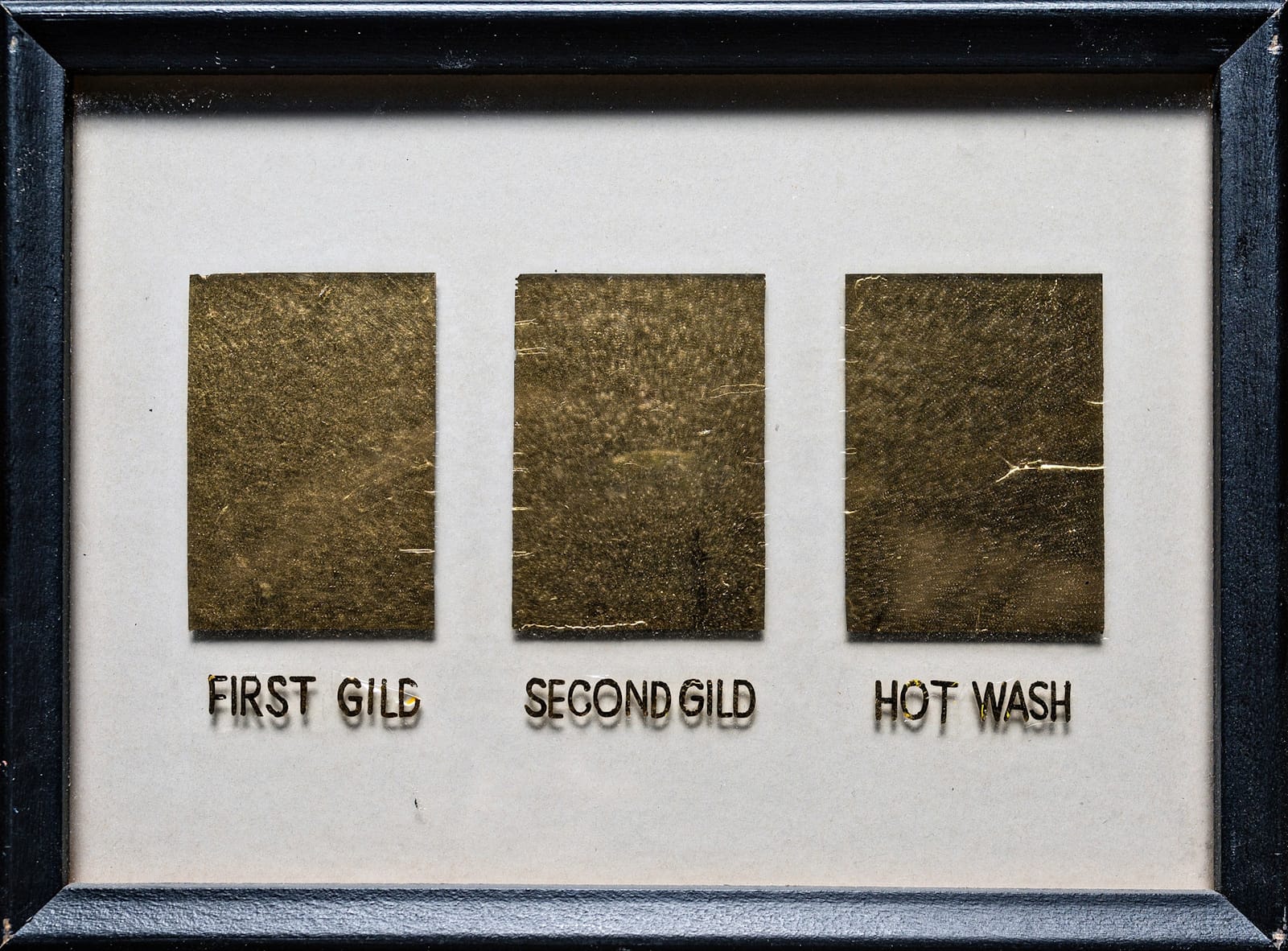 LeBlanc also prepared a panel to show the different stages in his reverse glass gilding process, including the final ‘hot wash’ in which the gelatine solution is applied over the second gild to increase the lustre of the gold and solidify the previous application of gelatine. LeBlanc discusses this process in his Gold Leaf Techniques book. For this N, he used yellow backup paint which further enhances the gilding on the front side.