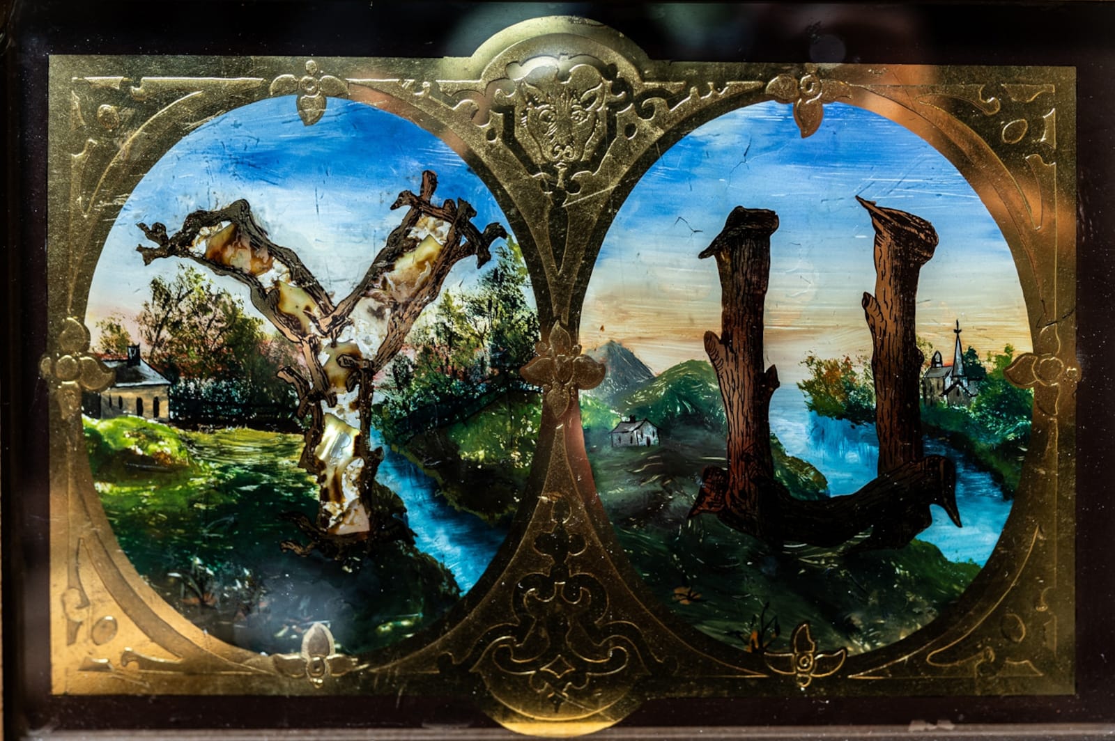 “This series of gilded glass panels were originally glued to the blank pages of a photo album and used by George C. Brooke as a ‘Specimen Book Critique’, or what we’d call a portfolio today. The class of work in this case is at the very top end of what’s possible with the medium, showcasing myriad ornate effects that have been executed at a minute scale.”