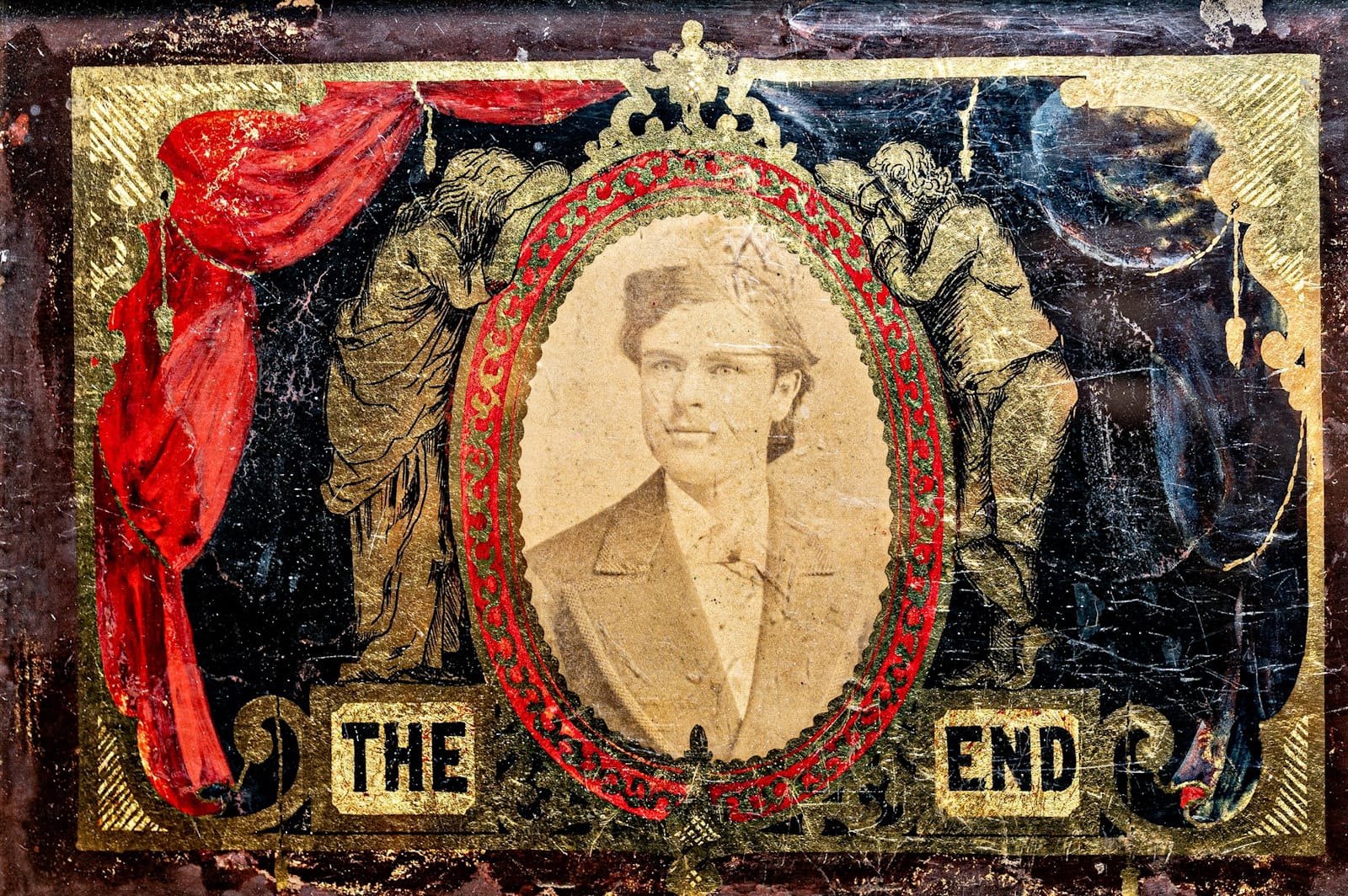 “One panel stands apart from the various letter samples: a photo of a man, framed with pictorial and other decorative elements, and captioned ‘The End’. This is not a portrait of Brooke, but rather a soldier that lost his life in the (then) relatively recent American Civil War. The intention was to sell similar memorials that families could hang or mount in a photo stand.”