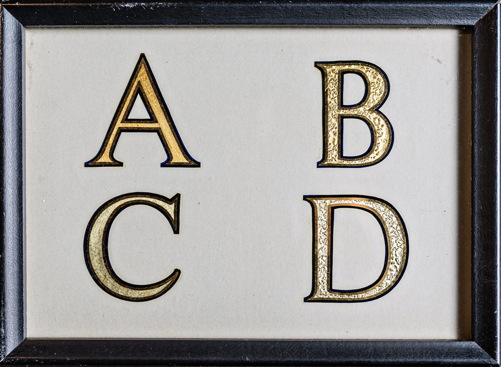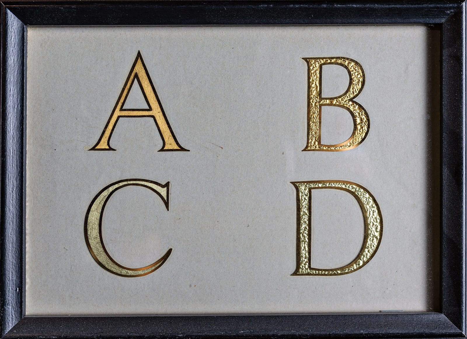 This was the opening line of the BLAG 05 piece featuring a case of gilding samples produced by Mark Oatis in 1990. He was following in a long tradition of sign folk creating samples, often single letter panels, to showcase the variety of effects and embellishments that can be achieved with the medium of gold (and paint) on glass.