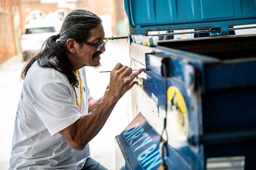 The Museum's waste management firm has carried out repairs on the dumpster that was decorated during Letterheads 40, rather than disposing of it. Now they'll have to decide if they prefer that one or the freshly painted Letterheads 50 edition.