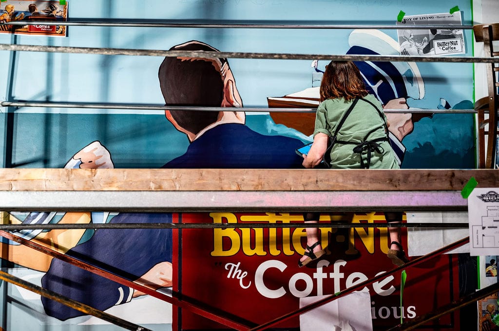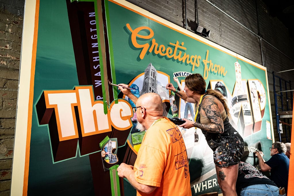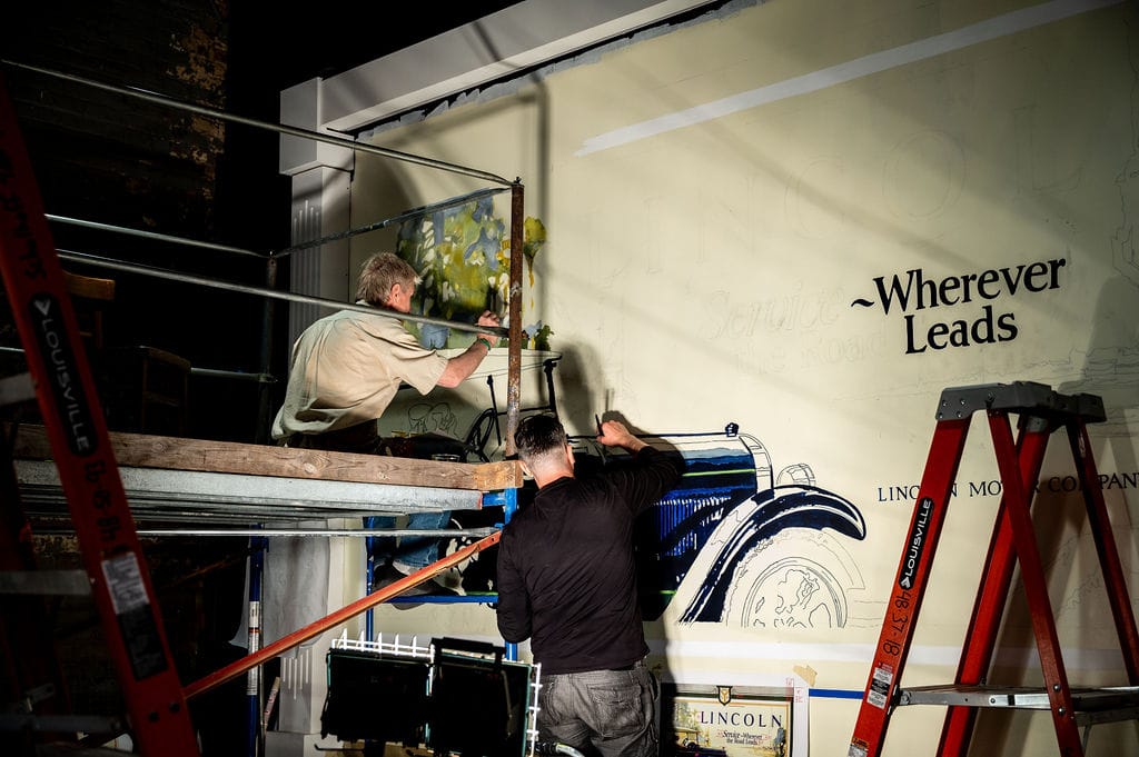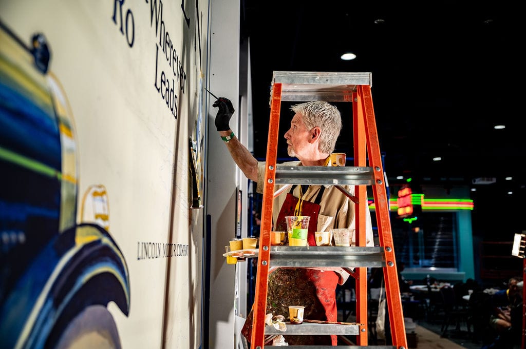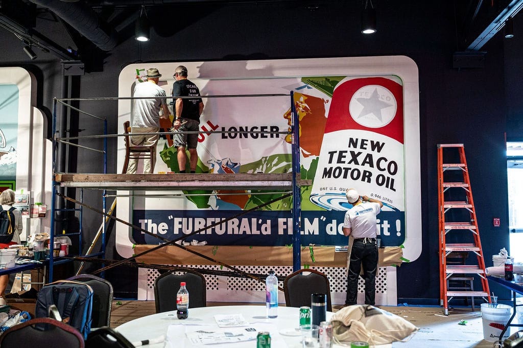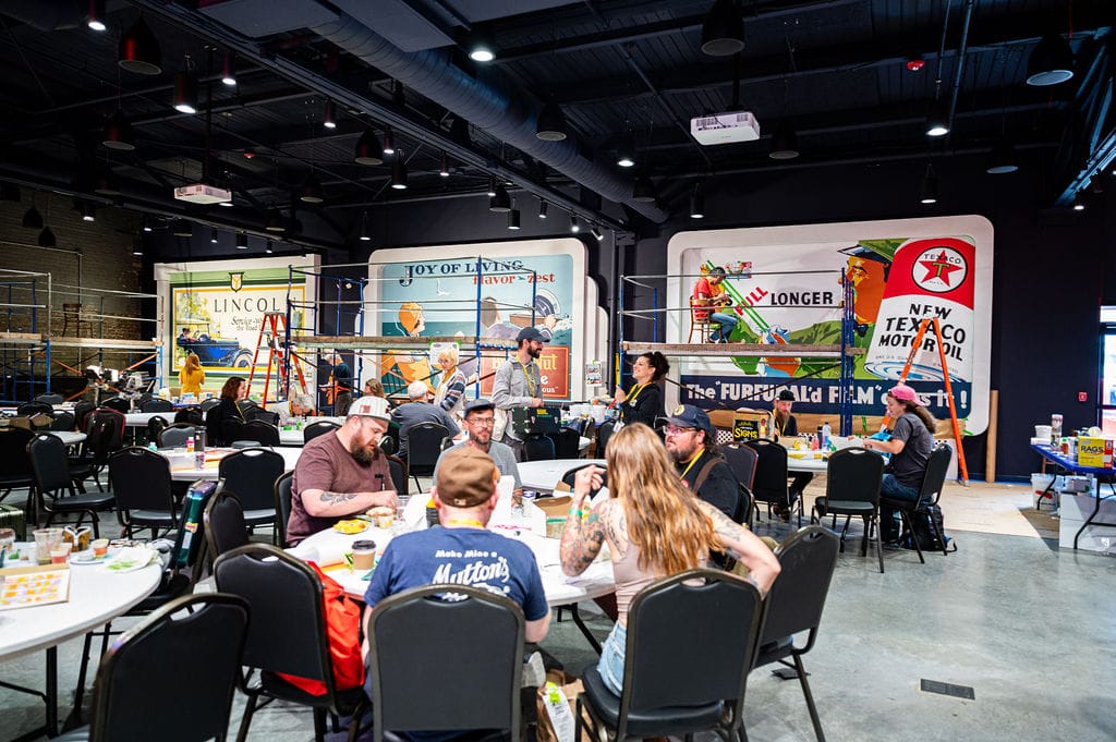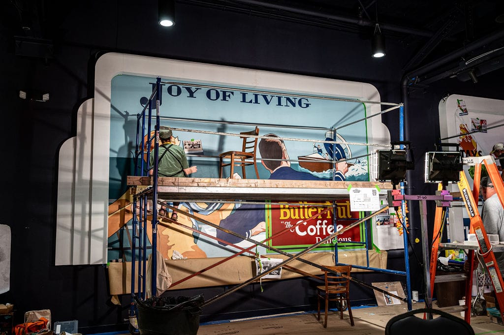 Meanwhile, on the other side of the room, teams were hard at work painting four murals. Three of these were for permanent display inside the Museum, with the designs adapted from vintage advertisements from the 1910s to the 1950s.