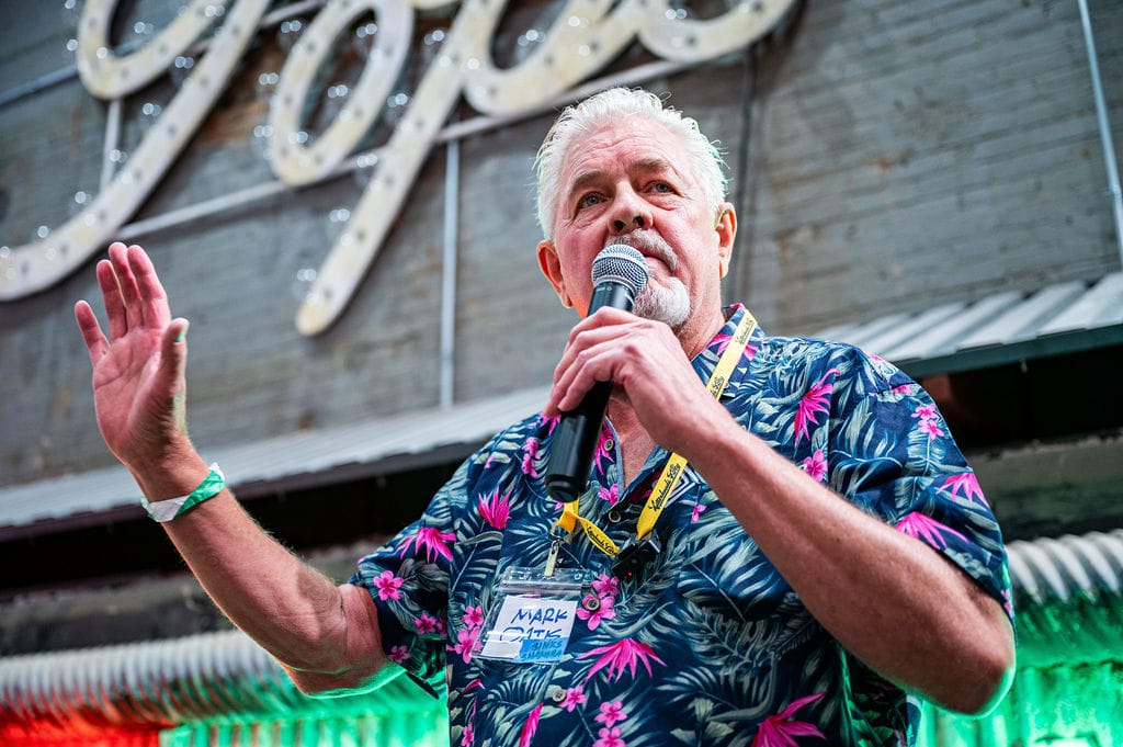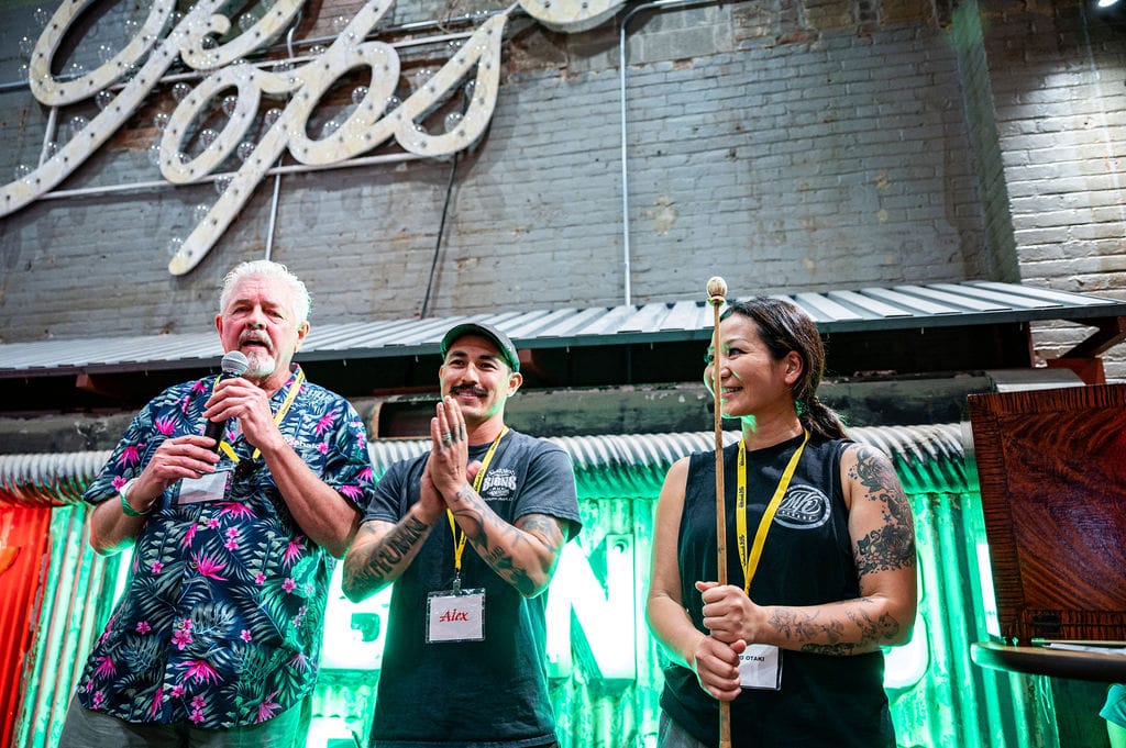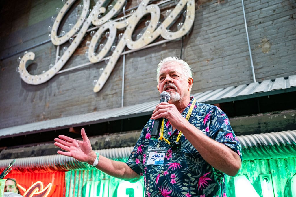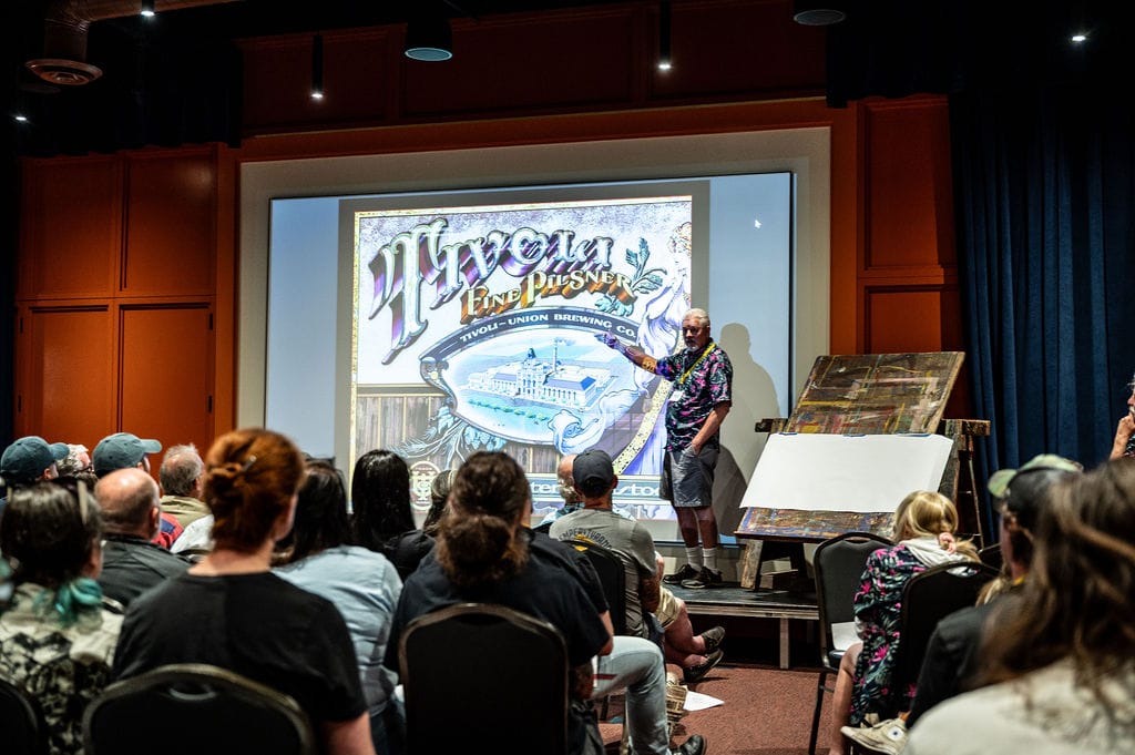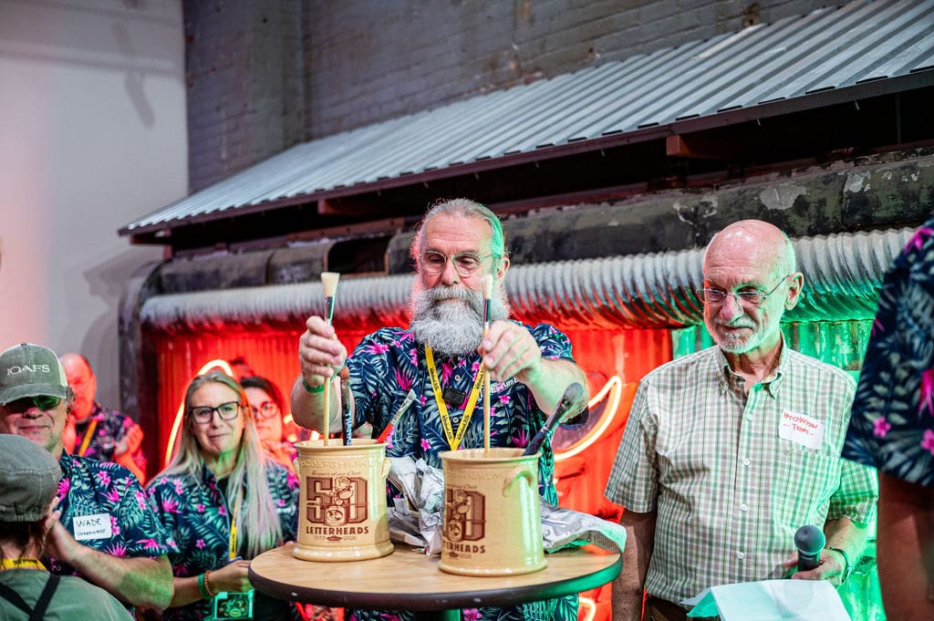 Mark Oatis and Noel B. Weber on stage at the American Sign Museum. Each was presented with an extra-large ceremic tankard into which Letterheads placed sourvenir brushes. Pictured here is Tod Swormstedt, the American Sign Museum founder and event host, adding his contributions.