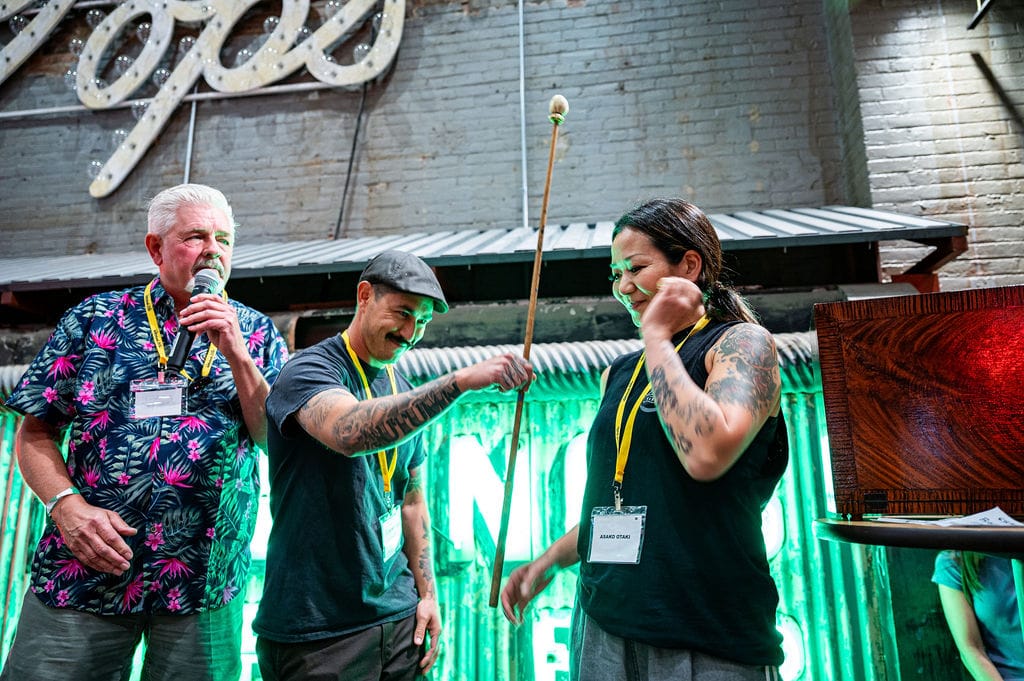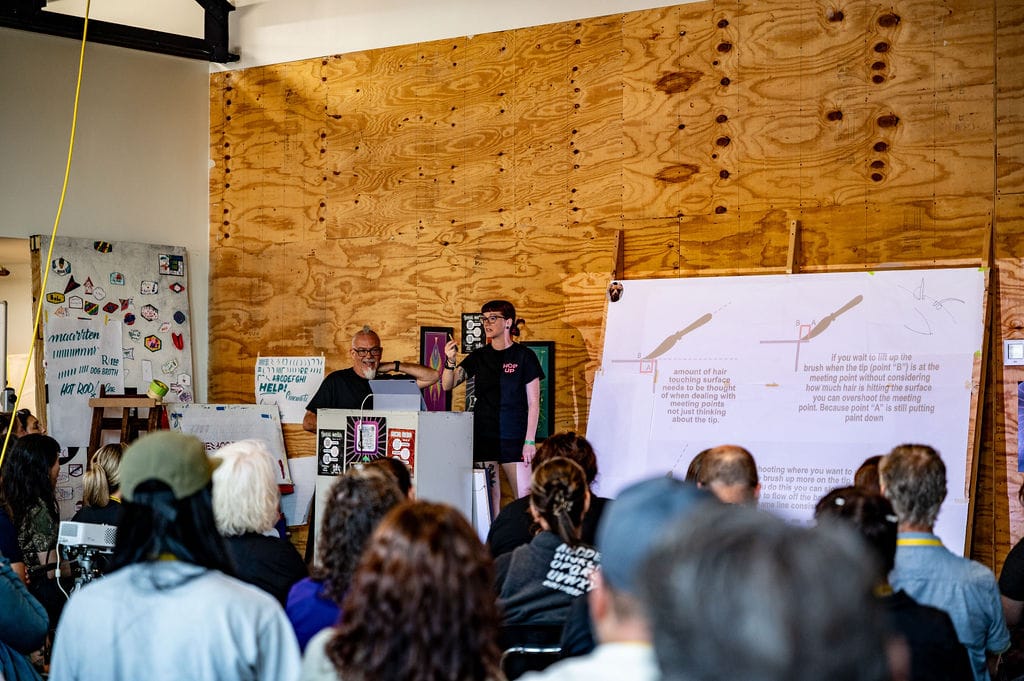 Following 'The Oath' delivered by Mark Oatis, there was a ceremonial passing of the mahl stick from Alex Kurakake, its recipient at Letterheads 40, to Asako Otaki. (There's a bit more on the mahl stick itself, and the symbolism of its passing, in the 'Tools of the Trade' section inside the Letterheads special issue of BLAG.)