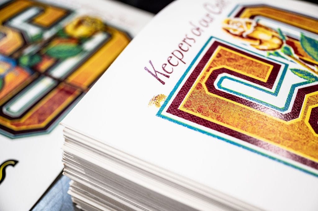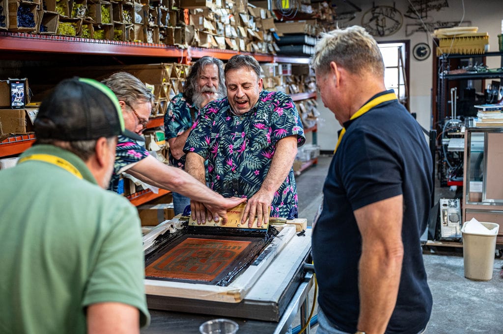Back inside, and tucked away in the Museum's repair room, was a hive of activity to produce a limited edition series of commemorative prints with the official event artwork by David Butler. This had been refined in collaboration with David Adrian Smith, and a team of screenprinters then worked overtime to pull the six colours and have them dried in time for signing.
