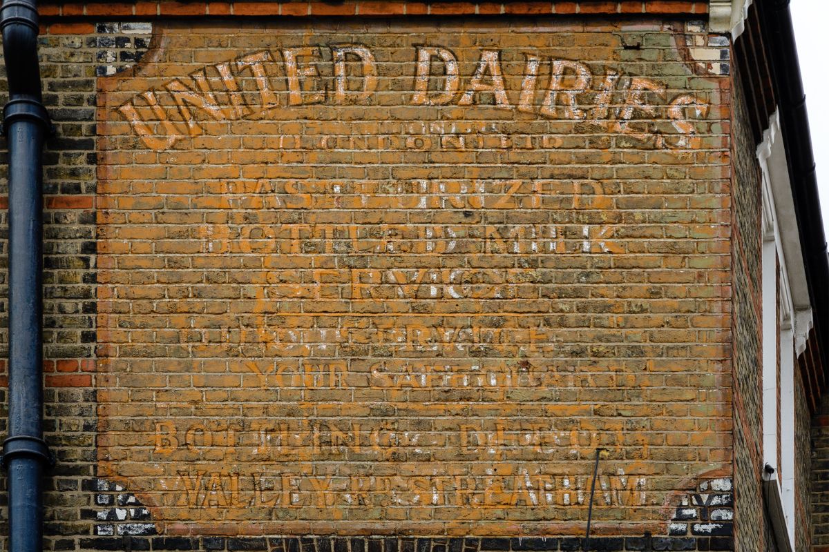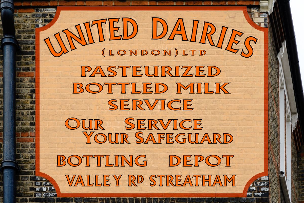 The ghost sign, and a reconstruction of the most prominent layer. United Dairies, Hubert Grove (corner of Landor Road) SW9. Photo/Reconstruction: Roy Reed.