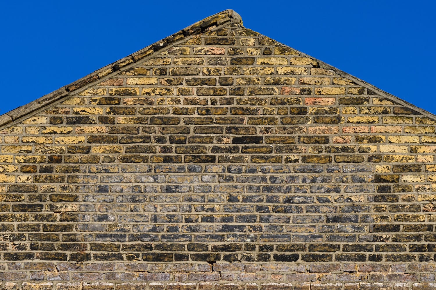 The sign dates to 1955, or soon after, when Courage took over the brewery from Barclay Perkins & Co. It was painted using the brick and mortar lines to set the letter heights, each nine bricks high, with the serifs weighted at one brick high. However, the horizontal spacing is less precise. After painting the constraining border and the first word, the signwriter realised they were going to run out of space and responded by narrowing a number of letters in the second word to make it fit.