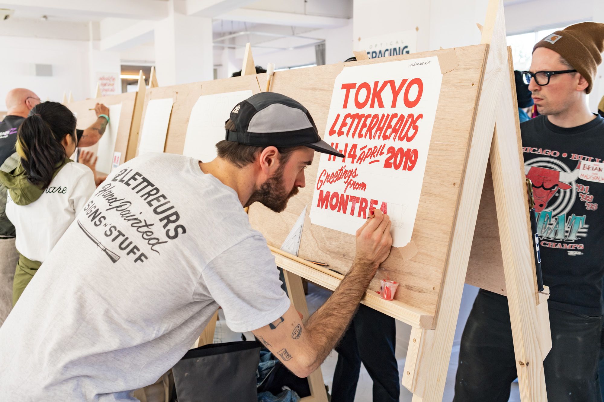 “Through practise might mastery each student gain. Every master through life will a student remain.” — Mark OatisFollowing its debut at the 2017 London Design Festival, the Better Letters Glowing Alphabet Peep Show was another feature of the public welcome area to the meet.M.A.R.S Print Studio were on site with live, hands-on screen printing, using the event artwork developed by Ged Palmer on G . F Smith paper. On the Saturday visitors could also visit the pop-up Type Tasting laboratory.Co-organisers A.S. Handover ran the shop in the welcome area and were much busier than Charlotte suggests here!Some of the demonstrations took place outside, including this Christmas window techniques session with Paul Myerscough from Bespoke Signs.An agricultural cart was coach lined and lettered, with the team led by Peter Anthony from Freestyle Sign Studio.Heading upstairs to the first floor, visitors made their way to the centre-piece of the public-facing parts of the meet. The Grand Exhibition of the Pre-Vinylite Society brought together a stunning array of talent to reinterpret the catalogue from the 18th Century Grand Exhibition of the Society of Sign Painters.Each day, exhibition curator Meredith Kasabian (Pre-Vinylite Society and Best Dressed Signs) gave a free talk discussing the historical context for the exhibition, and the work contained within it.This collaboration between Anna Frederick (xheart) and Craig Winslow was an animated, illuminated graphic installation within the exhibition.Members of the public could only go further into the meet by taking a guided tour with one of our volunteer team. Letterheads had coloured access-all-areas wristbands, which many chose to collect over the four days.Many letterheads brought along pre-prepared artwork which turned every available ledge into an exhibition piece.The Bargehouse is difficult to navigate at first, so we provided directional signage painted by James Cooper (Dapper Signs) and Jakob Engberg (Copenhagen Signs) on G . F Smith Colorplan.At the heart of the meet were the three panel jam areas. These simply consisted of easels, panels and paint for letterheads to get creative and jam together.Panel jamming.Zara Gaze created these two contemporary-politics-inspired dart boards which her son made good use of!Simon Travis (Brush & Leaf) working on a panel swap for Copenhagen Signs.At its heart the Letterheads movement is about supporting and nurturing the next generation of sign painters and lettering professionals. Mike Meyer set a project for the ‘newbies’ in the 1 Shot Novice Room, with the support of a team of eight experienced hands across the four days.The paint station in the 1 Shot Novice Room.The W&B Gold Leaf Gilding Zone allowed letterheads to try their hand at reverse-glass gilding under the guidance of Chris Surdivant (Debonair Sign Man) and Ash Bishop (Brilliant Sign Company), along with guest appearance from many others including Noel Weber and Eddy Artist. Here’s Hanif Kureshi working on the back of his glass piece.Glass pieces drying in the breeze before work resumes.A completed piece created from the design by The Debonair Sign Man.The next of our specialist zones was dedicated to pinstriping, and was facilitated by Jane Lind Walker and Richie Chlaszczak (Signwriting & Pinstriping Services)On the next floor up there was a cafe and bar run by Laithwaite’s Wine with blackboards from Michael Tilley (The Blackboard Artist) and Kerem Shefik (Karumba)The bar area also hosted a series of demonstrations, seminars and short workshops. Here Nathan Collis (Mucha Muckle) puts the finishing touches to a large blackboard following his session.Lots of the workshops continued beyond their allocated slot, including Gustavo Ferrari (Ferrari Fileteado) and his Fileteado Porteño session. His piece in progress is shown here while Jane Lind Walker continues her work on a red panel.In addition to a rolling programme of talks, seminars and masterclasses, the top floor hosted the calligraphy zone, curated by Alice Mazzilli (Ampersand Alice) and with a host of drop-in sessions available every day.We were lucky to have Painter Kafeel over from India for the meet and he produced the the pieces that fetched top dollar in the charity auction on the final day. Here’s the thank you panel that he painted for Ged Palmer.Saturday night provided the opportunity for everyone to let their hair down, enjoy a bottle courtesy of Budweiser Budvar, and dance to the brilliant Nut Jumpers.Cheers to our supporters at Budweiser Budvar!Party on!Cheese! Group photo outside our wonderful venue at the Bargehouse, OXO Tower Wharf.