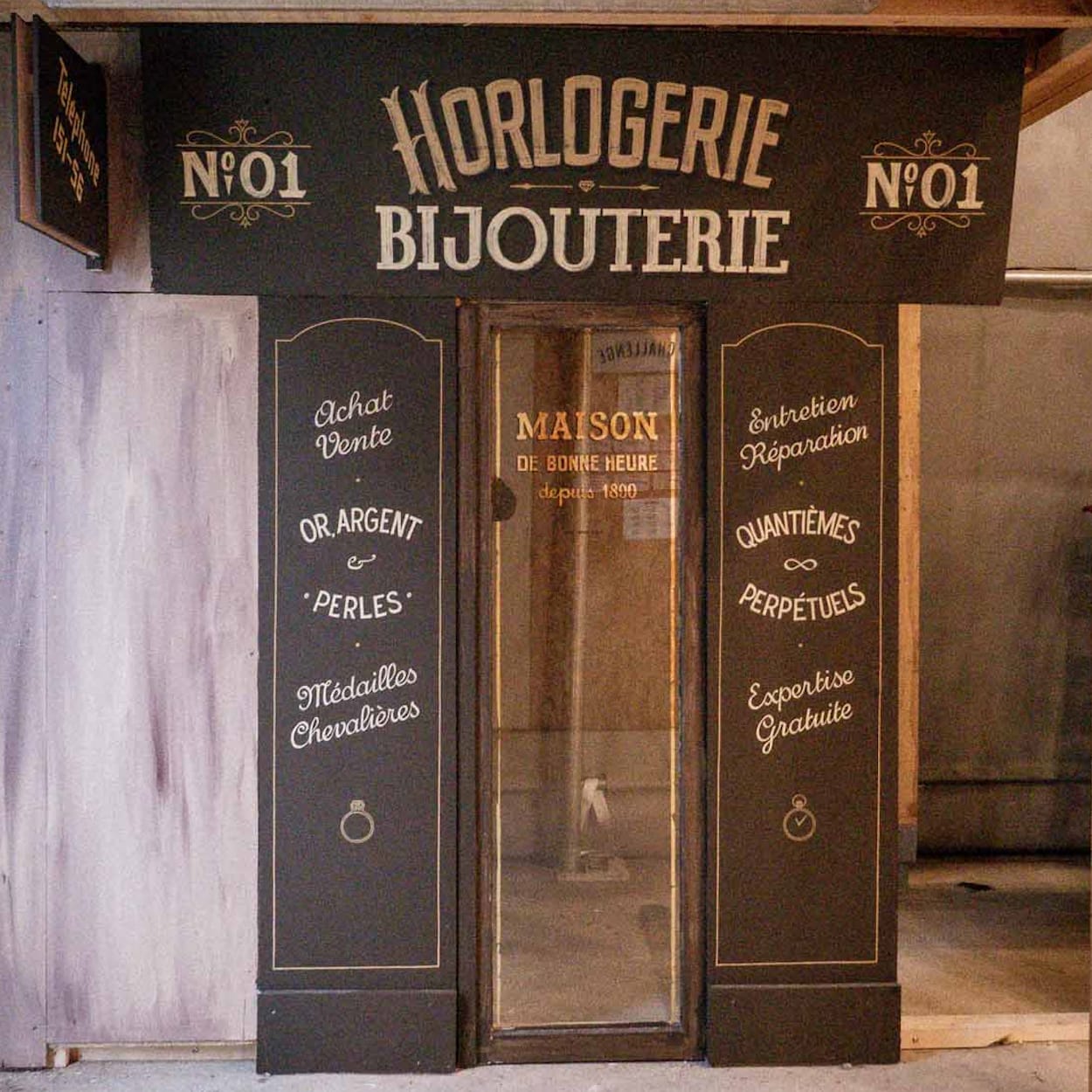 The briefs included the shop type—bakery, pharmacy, cheesemonger, etc—and the era in which it was to be styled. In addition to the façade, other signage elements were required, including work on the glass panel in the door, and a blade sign or A-board to be displayed outside.
