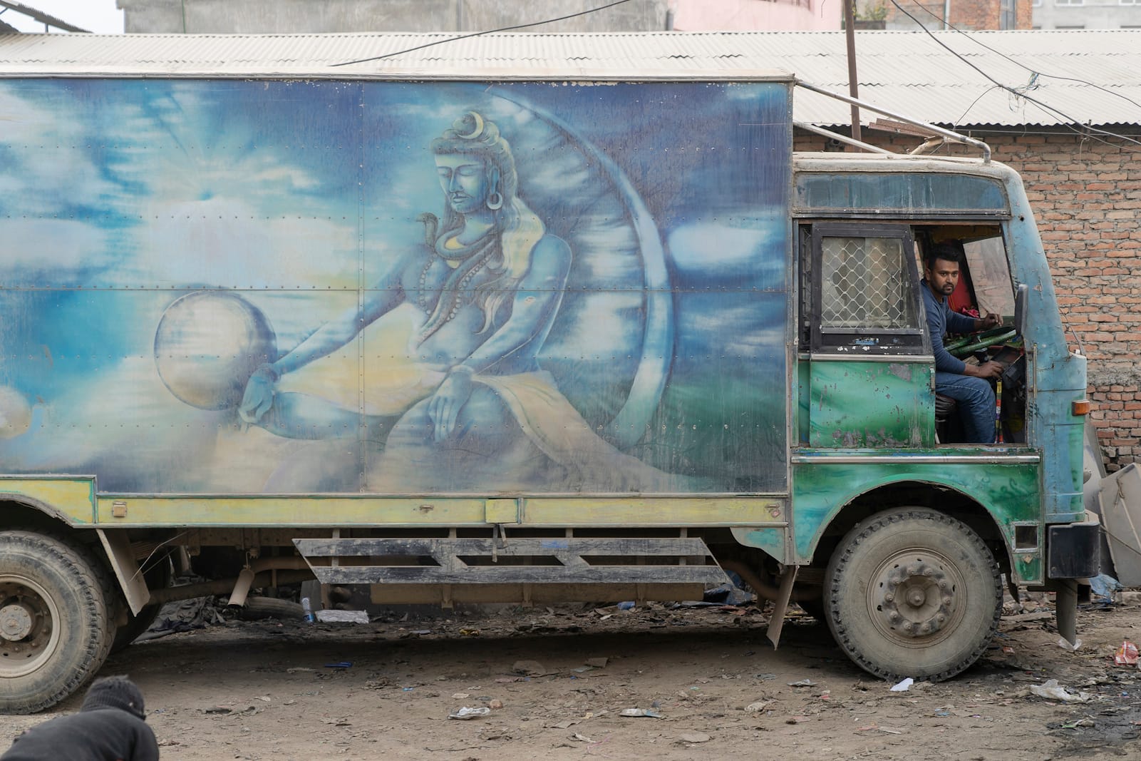 People also feature prominently, with those driving and working the vehicles joined by the wider public that they pass each day. We see inside the customised cabins of the long-distance truckers, while they also peer out at us, framed by their painted places of work.