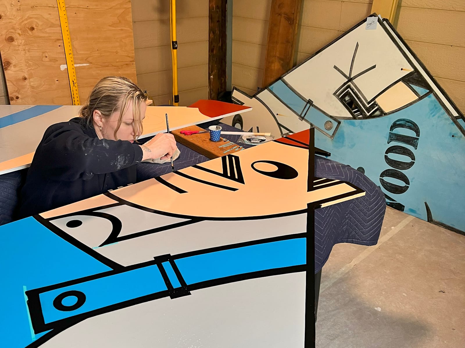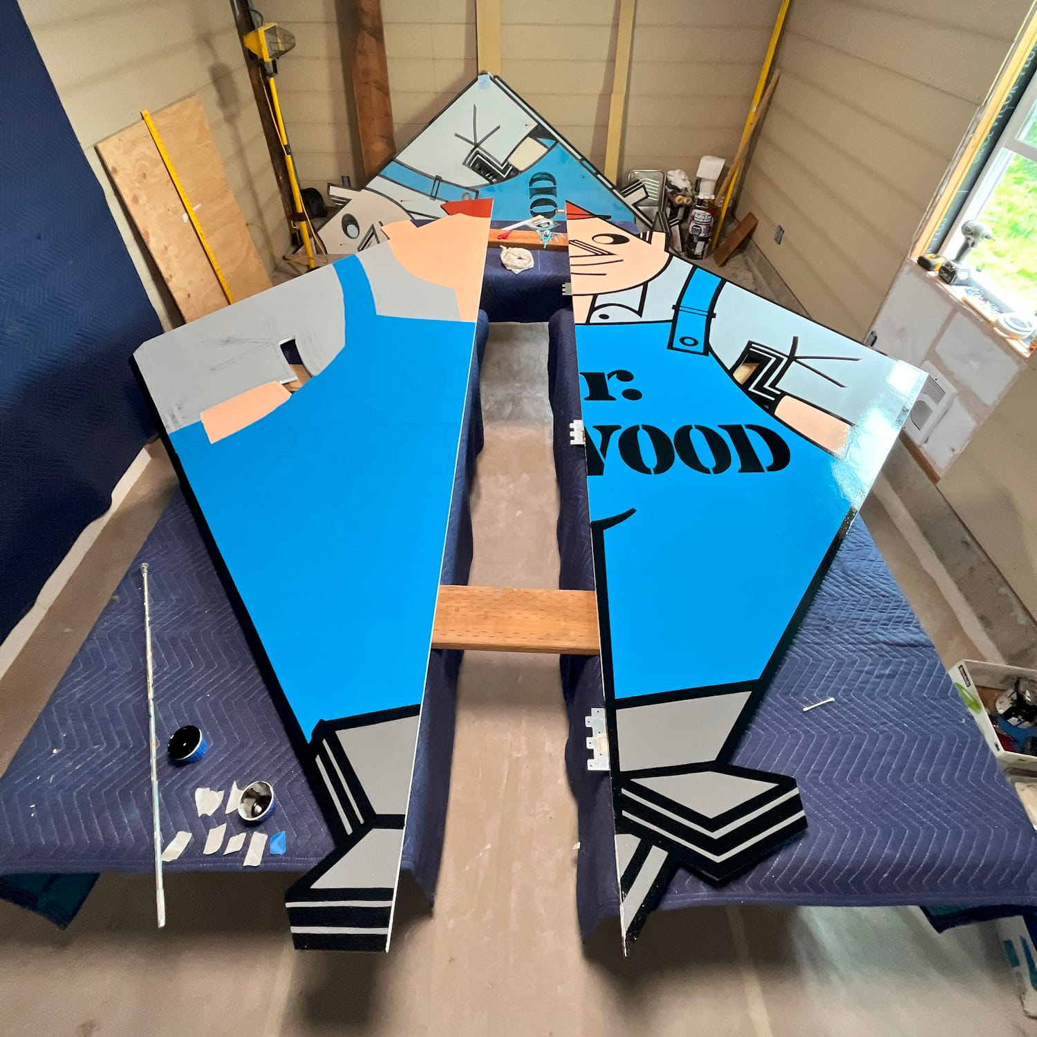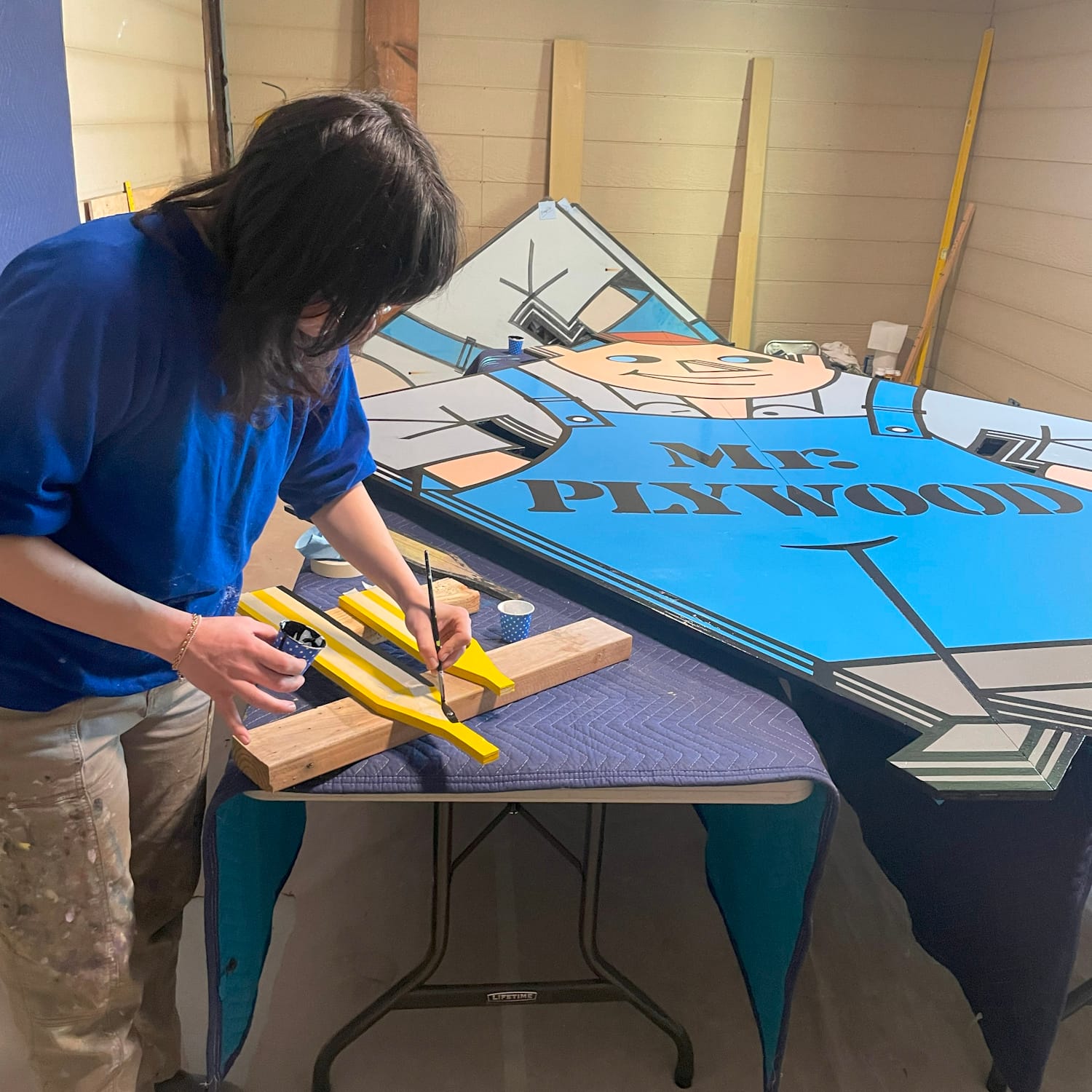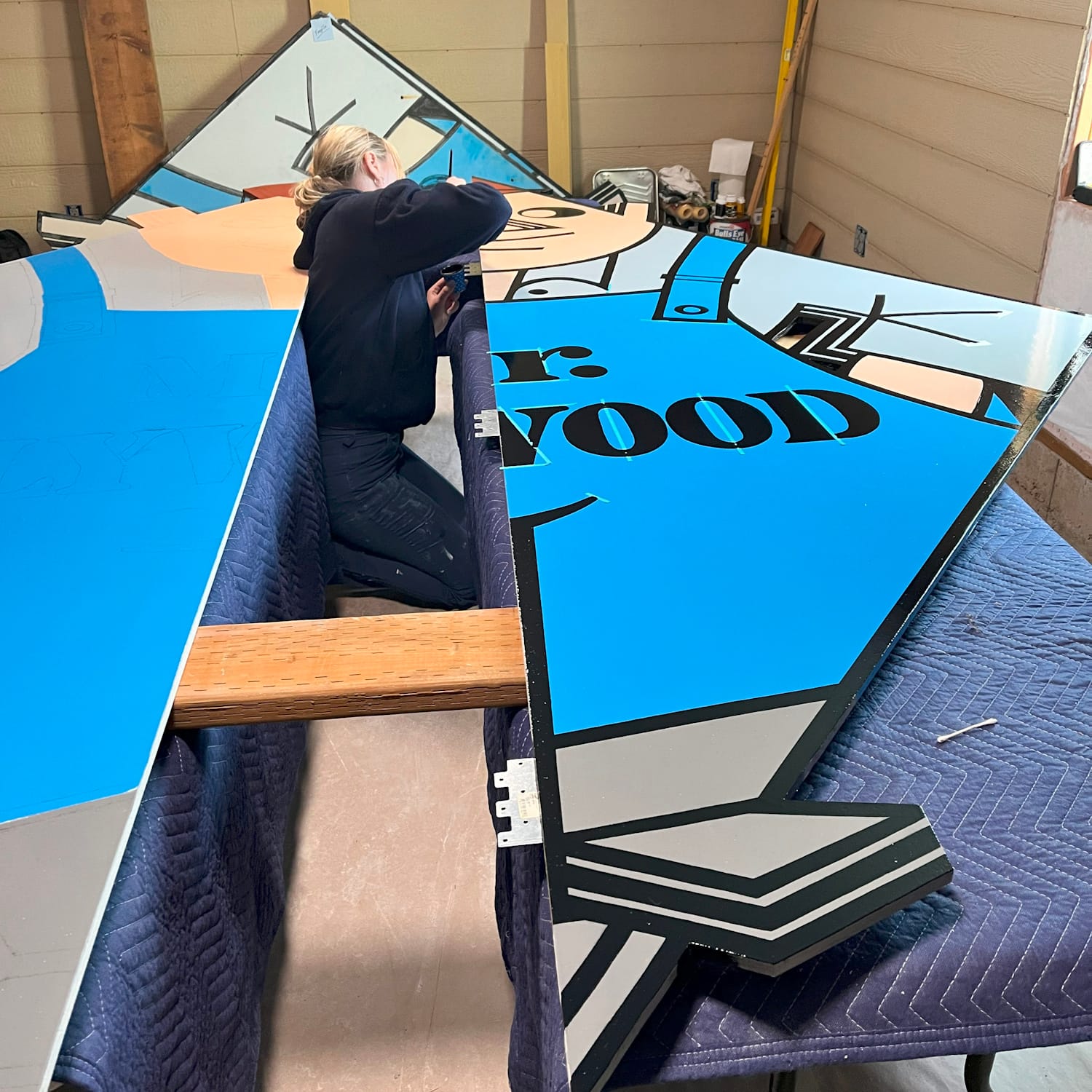 We worked closely with Tom, who provided the cut and primed MDO plywood as well as a space to paint at his warehouse. We traced the original design and made paper patterns. We then brought Mr. Plywood back to life by hand-painting with enamel paints and painstakingly colour matching the original hues — a difficult task, seeing as the old sign was so faded in areas!