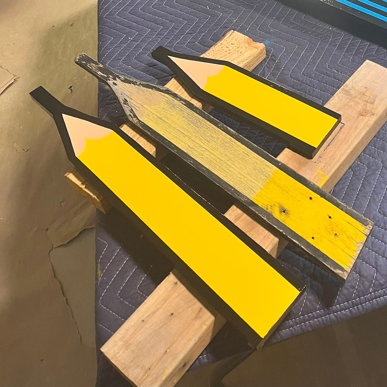 "Where's my pencil?" asks Mr. Plywood, to which Kirsten Bauer replies, "Hold tight, it'll be back behind your ear as soon as this paint has cured".