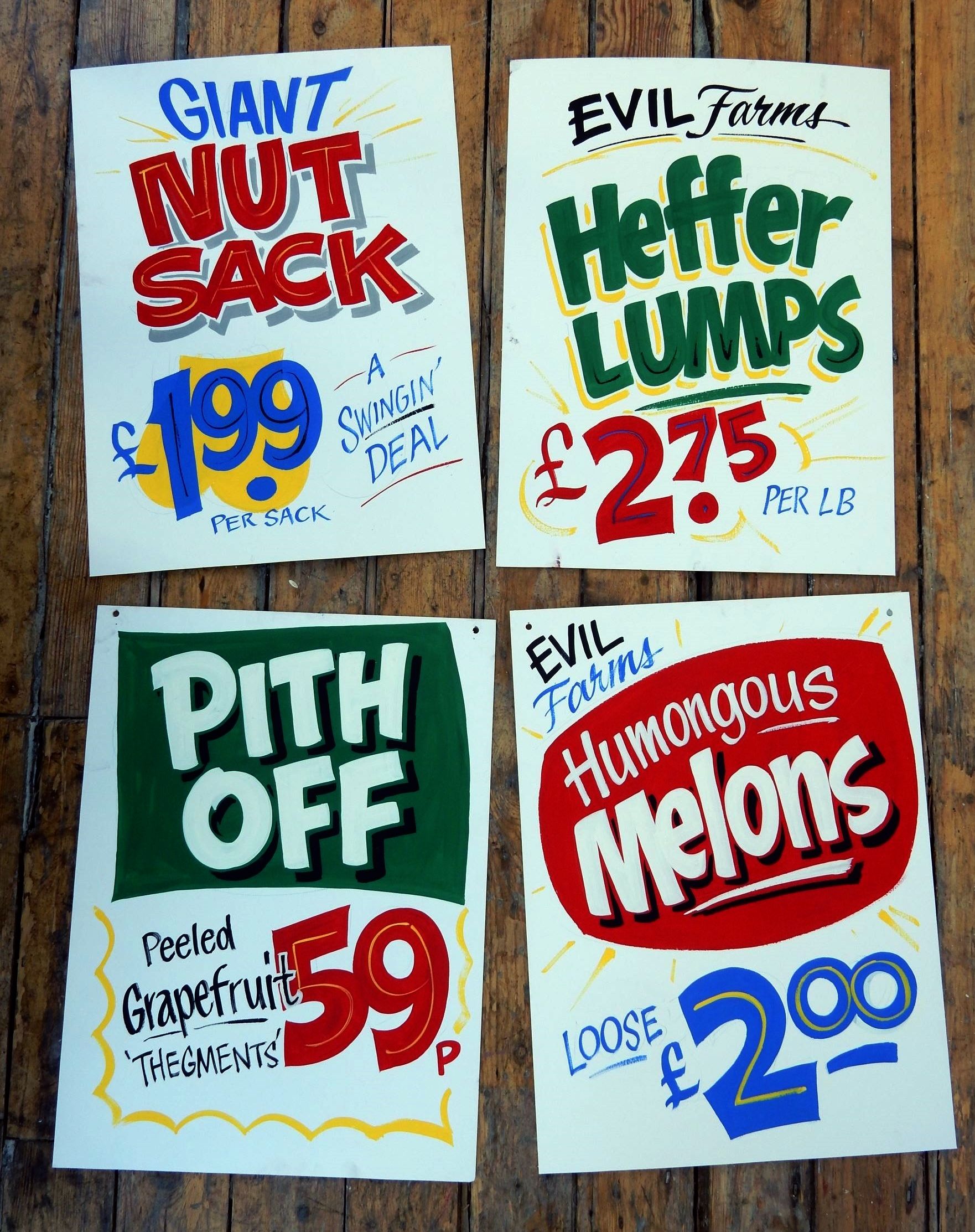 We were invited along to one of the photo shoots to create a series of showcards for Evil Farms’ new supermarket, promoting everything from humongous melons to popped cherries. Mike Meyer took the brief and ran with it across a fun-packed day in the studio. Thank you to Coy! for getting us involved!