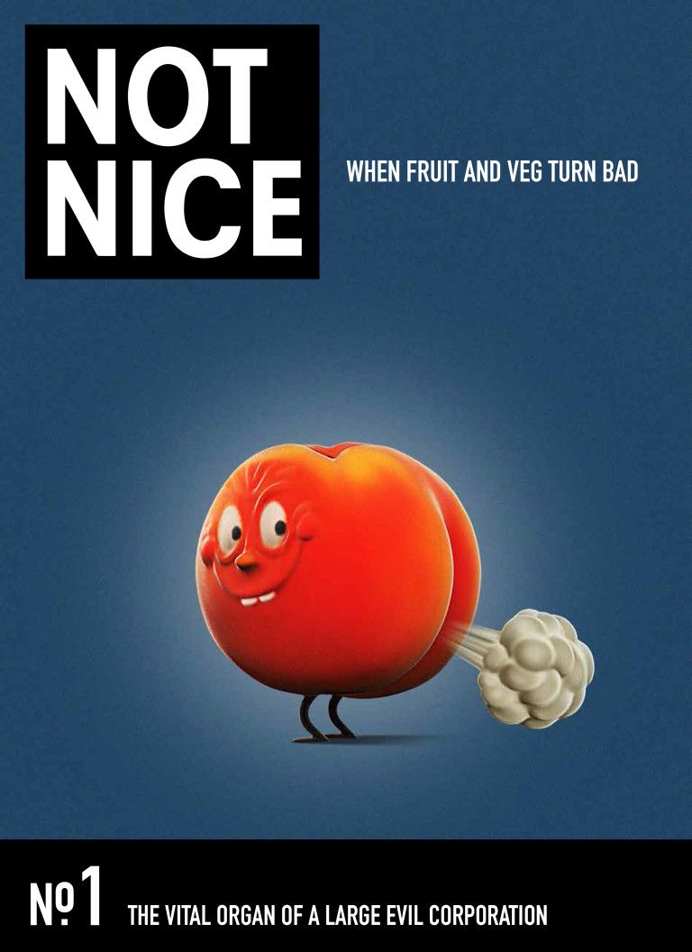 Not Nice is the first promotional magazine produced by Coy! Communications for the (real) animation company A Large Evil Corporation, and their (fictitious) subsidiary, Evil Farms. It features a stack of tongue-in-cheek and innuendo-filled pages which were launched alongside an exhibition of photography and prints, all directed by Coy’s Mark Denton Esq.