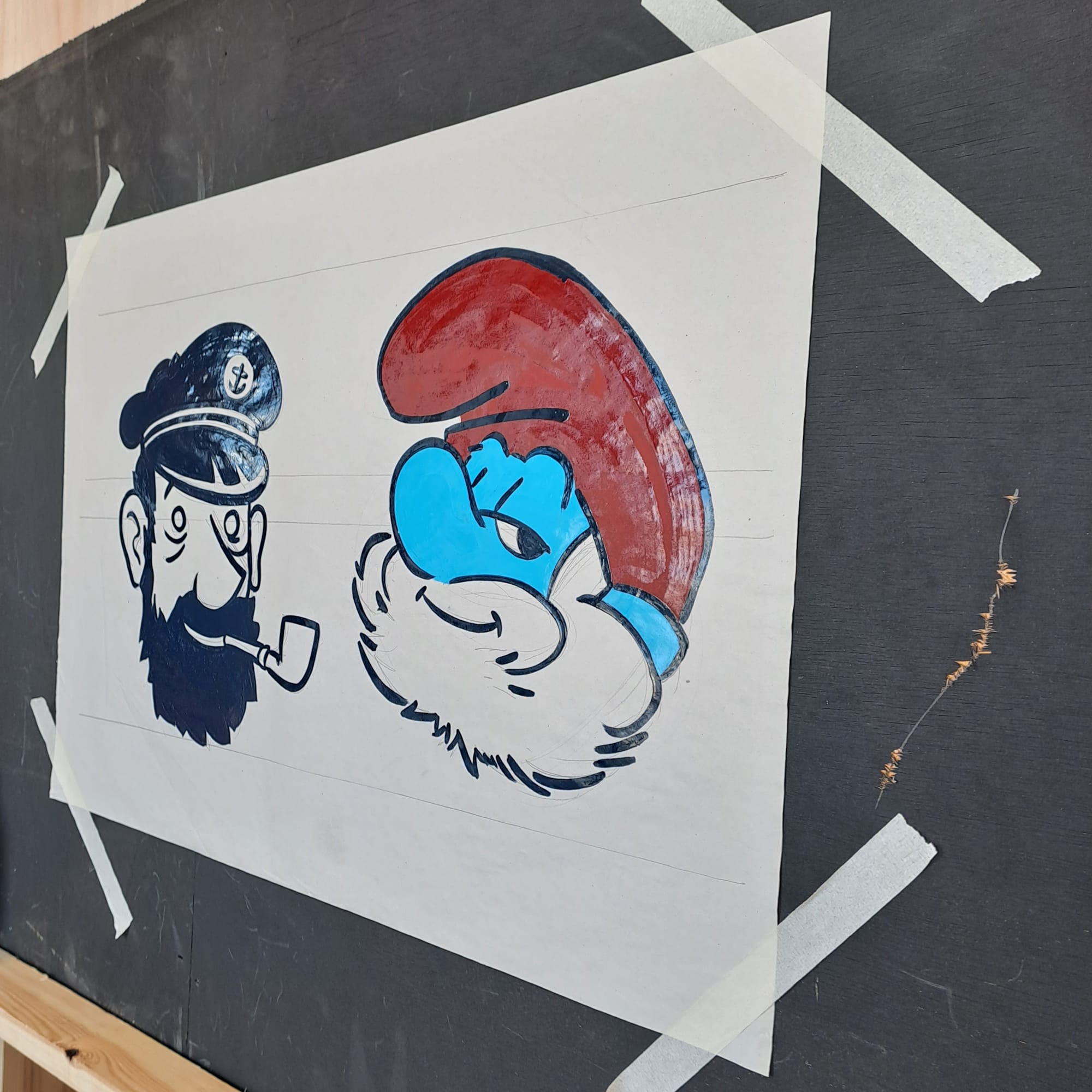 Work-in-progress on Sebastian Karbowiak's mural, with Camille Vinck (@lettrages_camillevinck) and Cédric Van Herck (@buenaondacreations) joining the team.