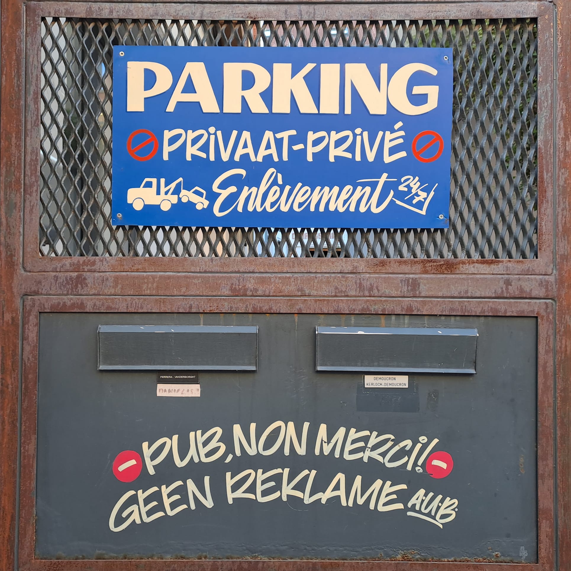 Some of the signs of all kinds spotted in Brussels, including the private parking and no publicity signs from host Francois Tusseki (@francoistusseki), found on the entrance to our accommodation.