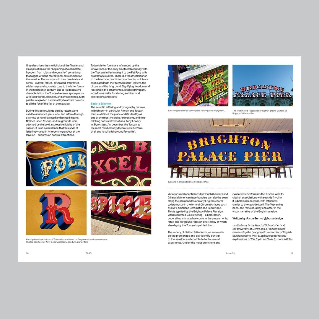 English seaside resorts have a rich and diverse heritage when it comes to lettering and typography. In Issue 03 of BLAG (Better Letters Magazine), designer and researcher Justin Burns (@jburnsdesign) explores one noteworthy aspect of this: the Tuscan letter.