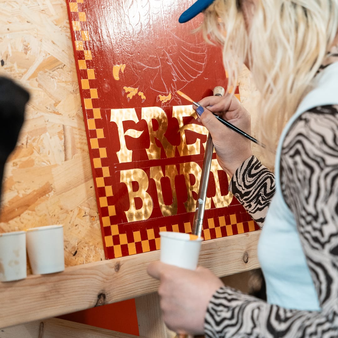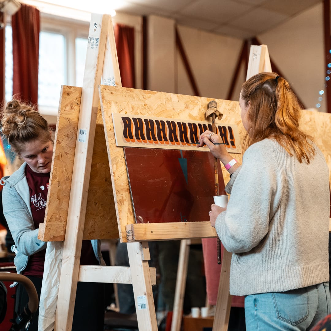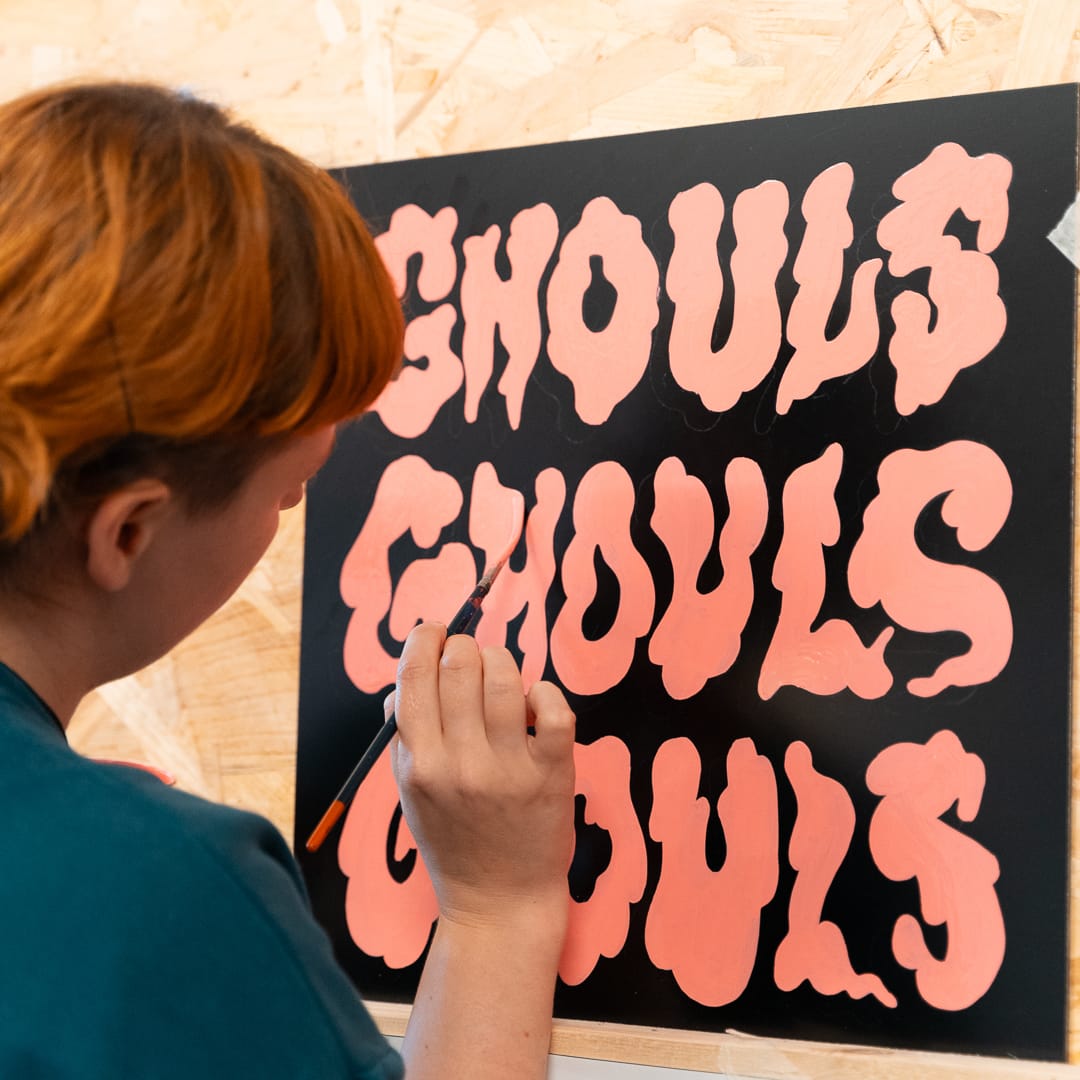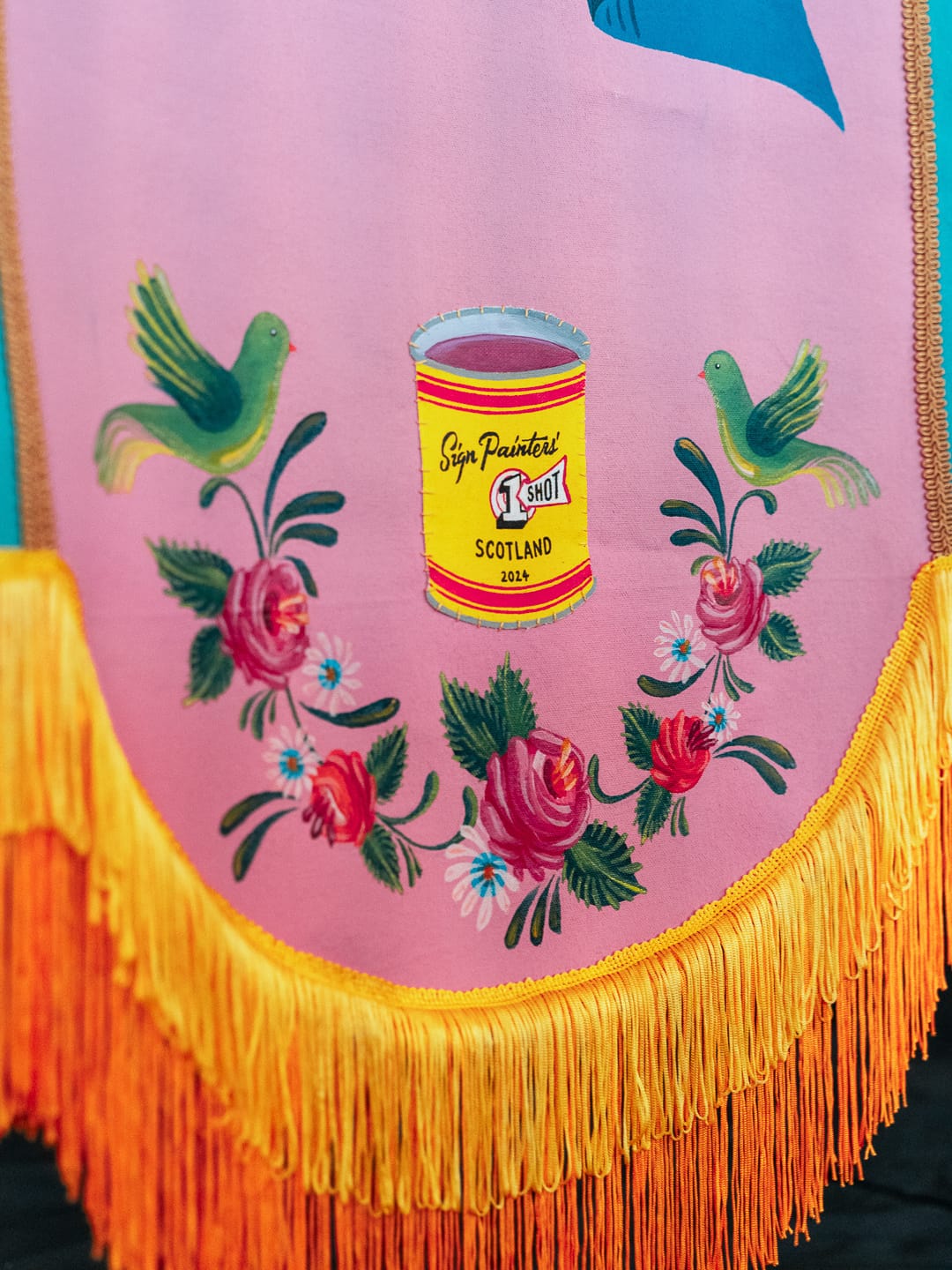 Last month I hosted the third annual Burds of the Brush; a two-day event welcoming female, trans and non-binary signwriters from the world to my little corner of Bristol. With it being mid October, and me being Queen of Halloween, I had to add a little spooky spin, so the local community hall was adorned with bats and ghosts, as well as the usual pile of dibond panels, paints kindly sponsored by A.S. Handover, and easels crafted with the help of my partner Cobra Signs when I realised I had a little too much on my plate!*