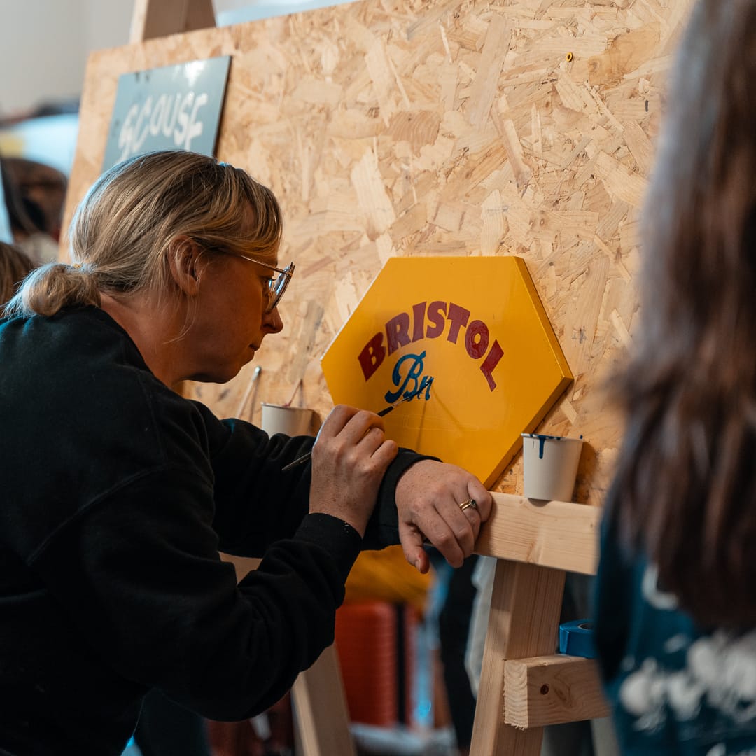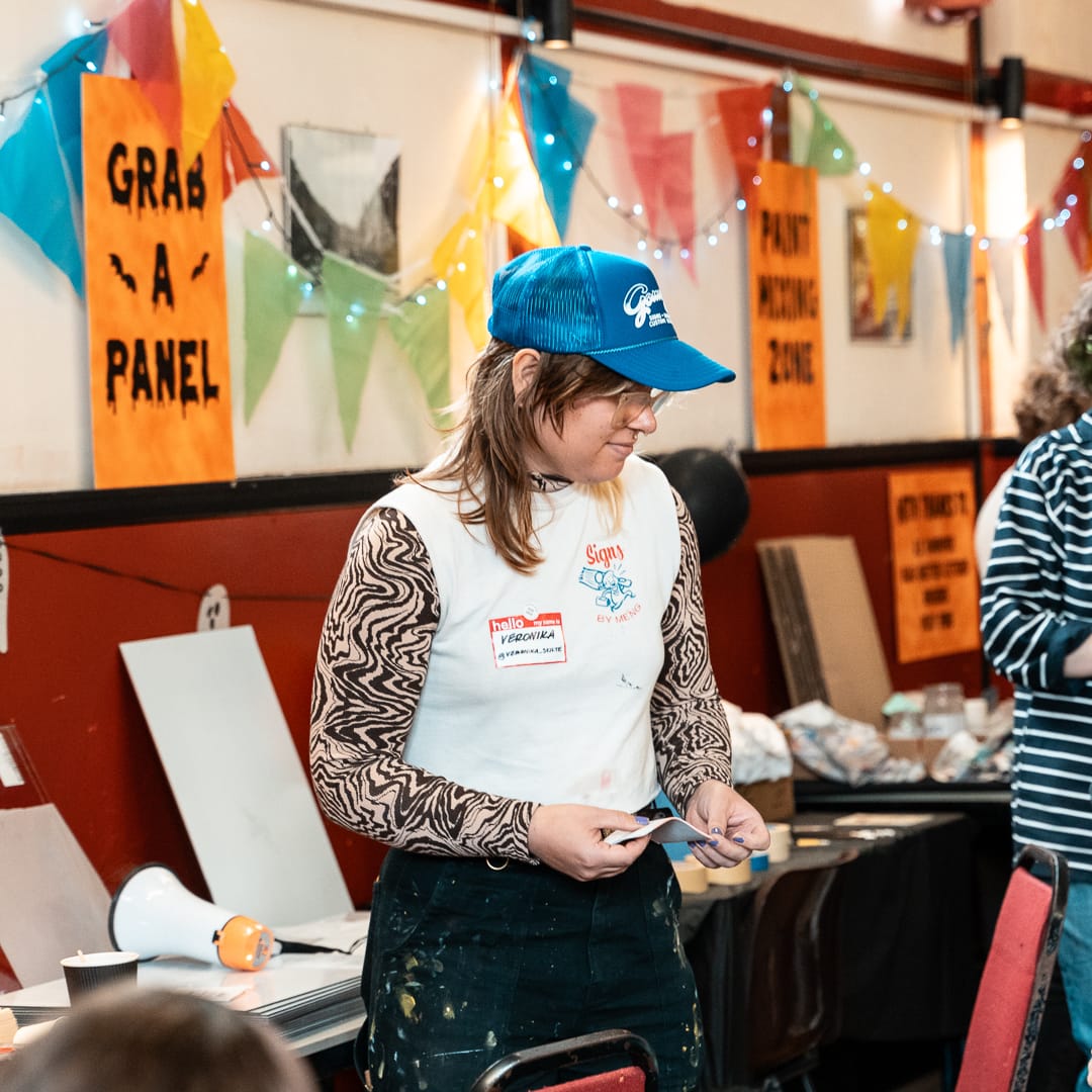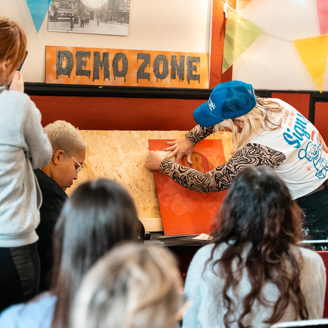 Last month I hosted the third annual Burds of the Brush; a two-day event welcoming female, trans and non-binary signwriters from the world to my little corner of Bristol. With it being mid October, and me being Queen of Halloween, I had to add a little spooky spin, so the local community hall was adorned with bats and ghosts, as well as the usual pile of dibond panels, paints kindly sponsored by A.S. Handover, and easels crafted with the help of my partner Cobra Signs when I realised I had a little too much on my plate!*