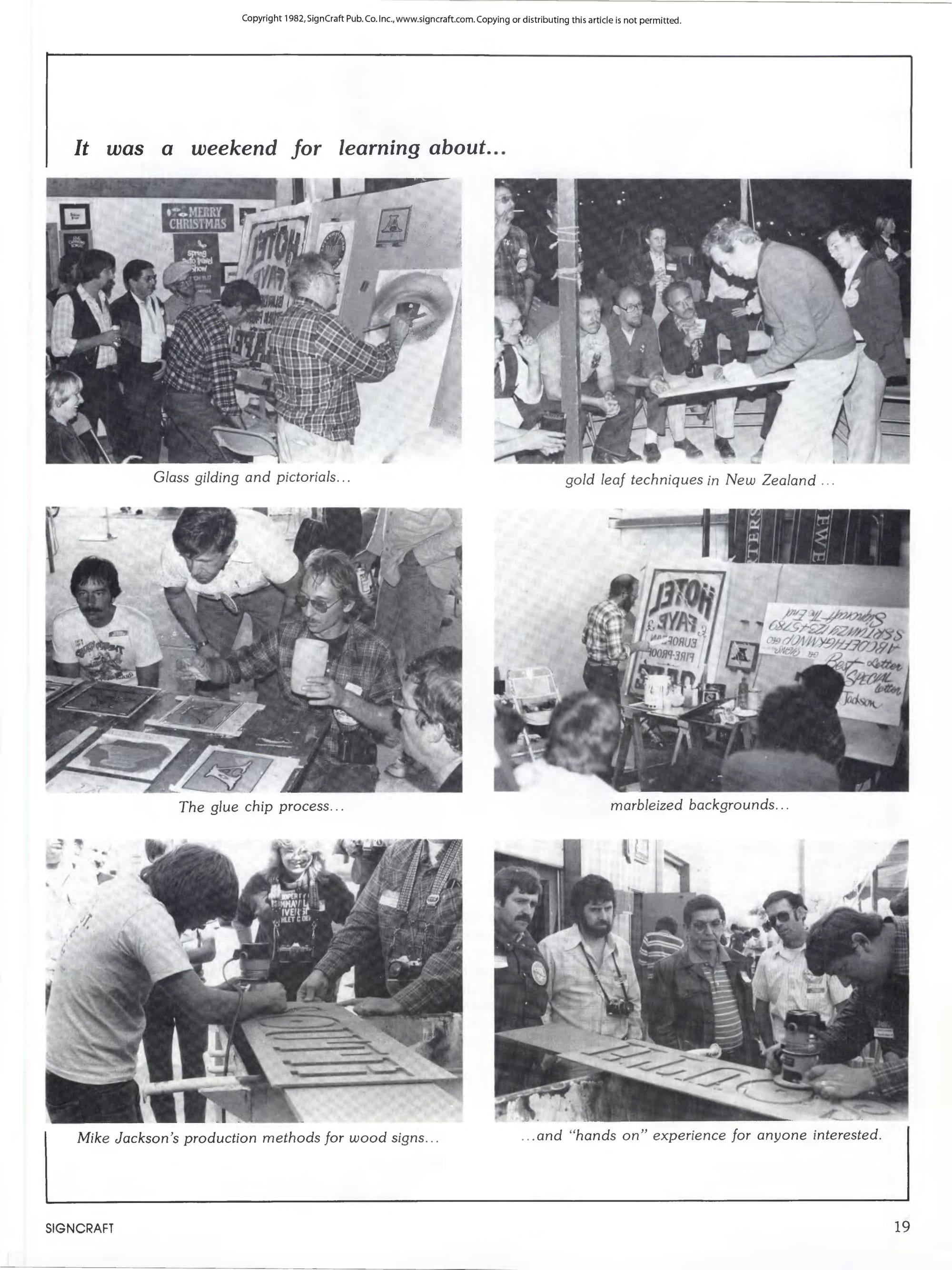 Demonstrations, seminars, and workshops in full swing at the Oklahoma Bash. Across from top left: Showcard lettering with Bob Behounek; Gluechipping with Bob Mitchell; Sandblasting with Butch 'Superfrog' Anton; Scrollwork for trucks with Gary Rhodes; Lettering with Jeff Cahill; Surface gilding with Dusty Yaxley; Carving with Mike Sargeant; Glass gilding with Kent Smith; and Carving with Roberto Lavadie.
