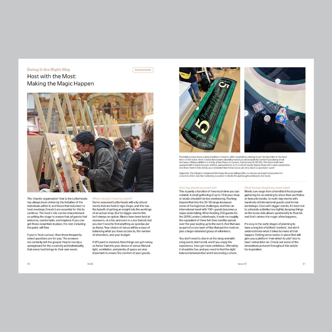 The meeting ran across three days, 29–31 October 1982. During this time, the three bays of my shop, and the big top tent outside, were constantly filled with craftspeople eagerly sharing their skills. The 'vibe' from the event’s unstructured nature was contagious! Impromptu demonstrations included gold leaf application, screenprinting, calligraphy, showcard writing, wood carving, sandblasting, pinstriping, gluechipping glass and, of course, brush lettering.