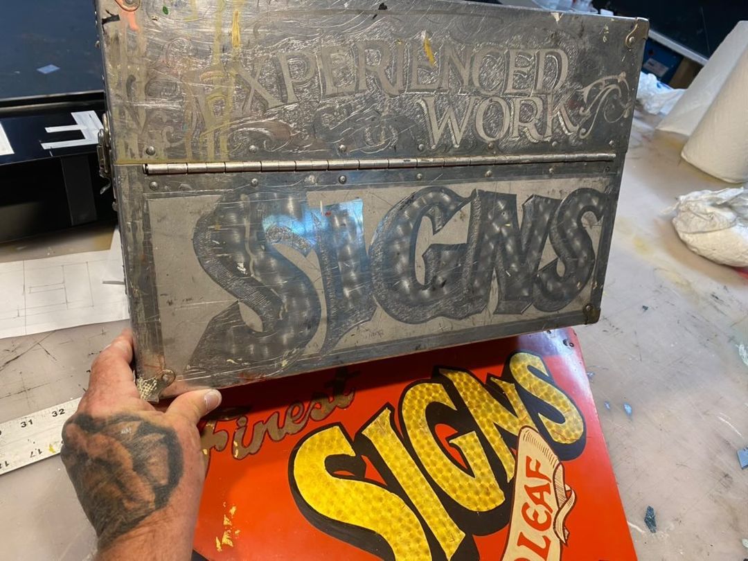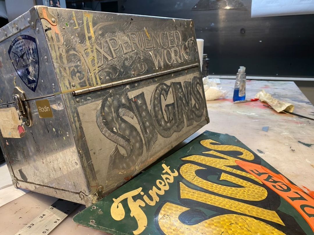 The photo got me thinking about contemporary sign painters and their rides, and soon enough Gibbs Connors (@gibbsconnors) got in touch to share these pictures of his old shop bike. He'd had it since 1984 and it helped him ply his trade in both Philadelphia and New York. It's now been decommissioned, but he's kept the panels, and even used the pattern again on his metal kit box.