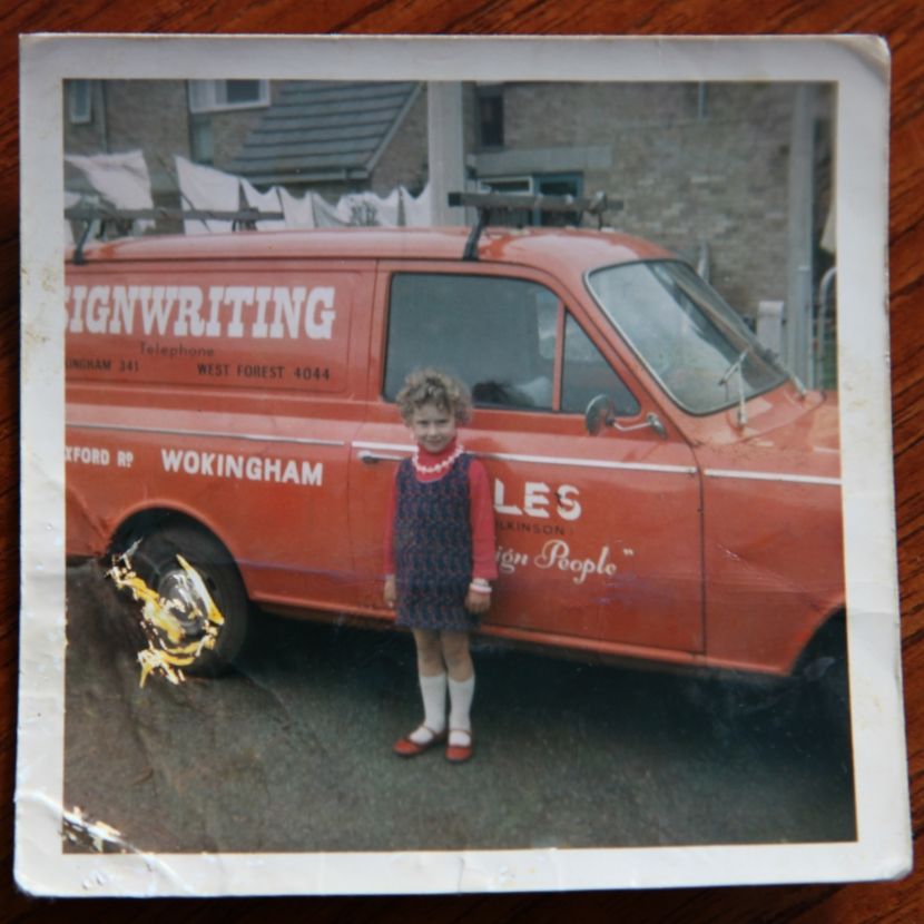 Maurie Barker of Barker Signs decorating his vehicle in Australia in 1964, and Stan Wilkinson's daughter posing in front of his van after he took over Giles the Sign People in Wokingham, UK.