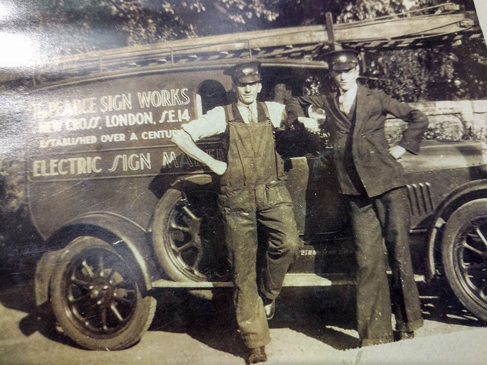 Vehicles for Pearce Signs (still trading), O.B. Fields Signs, and an anonymous duo posting with their ride.