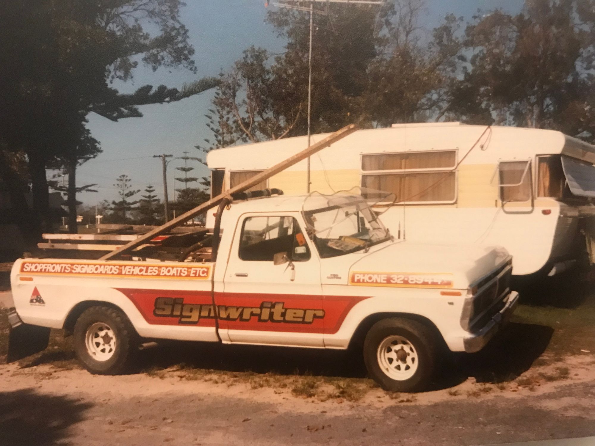 "It was the early 1980s and I’d just finished my signwriting apprenticeship. I was 21 years old and decided to travel around Australia with this F100 and the 22 ft (6.7 m) Viscount caravan.