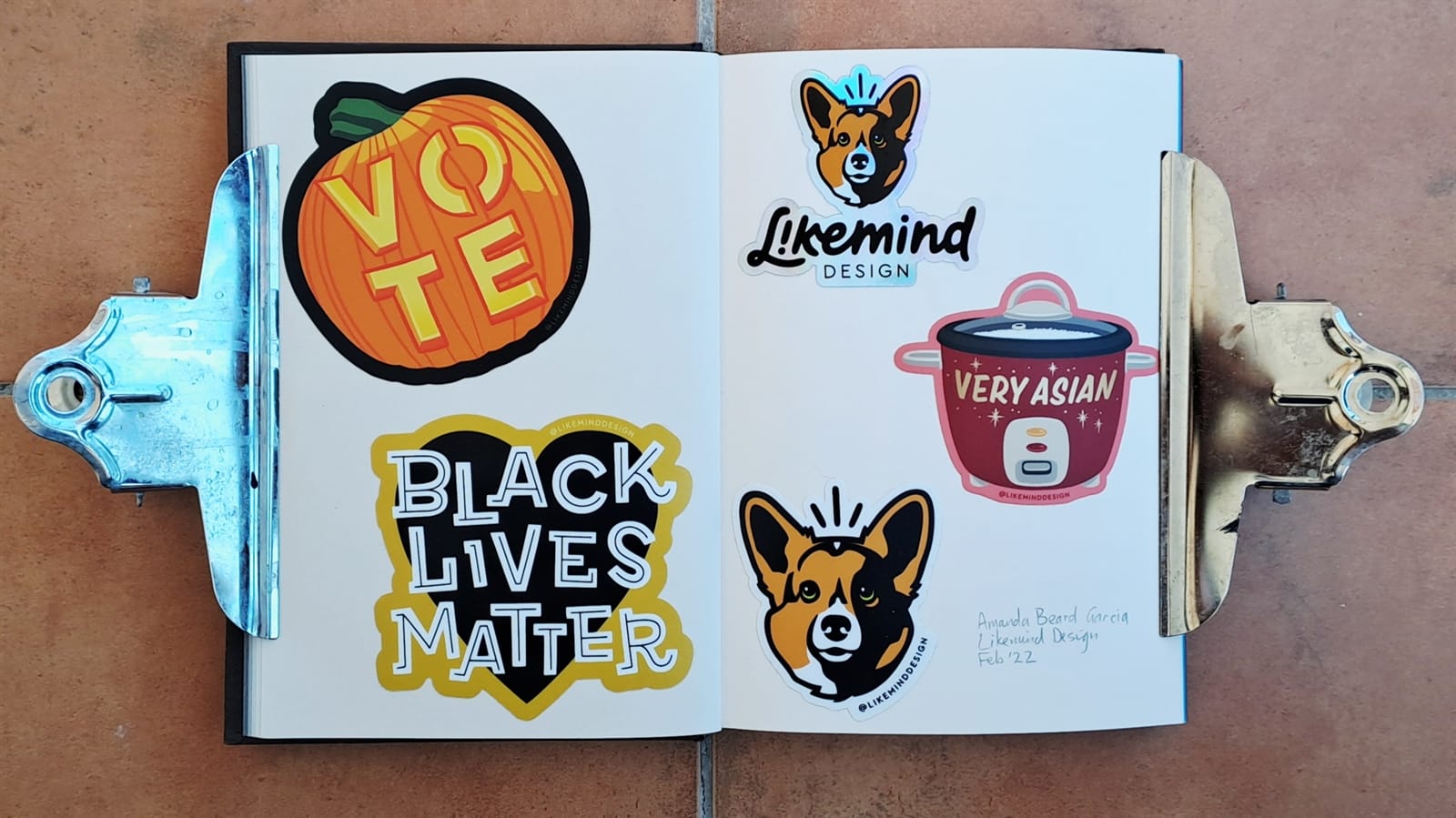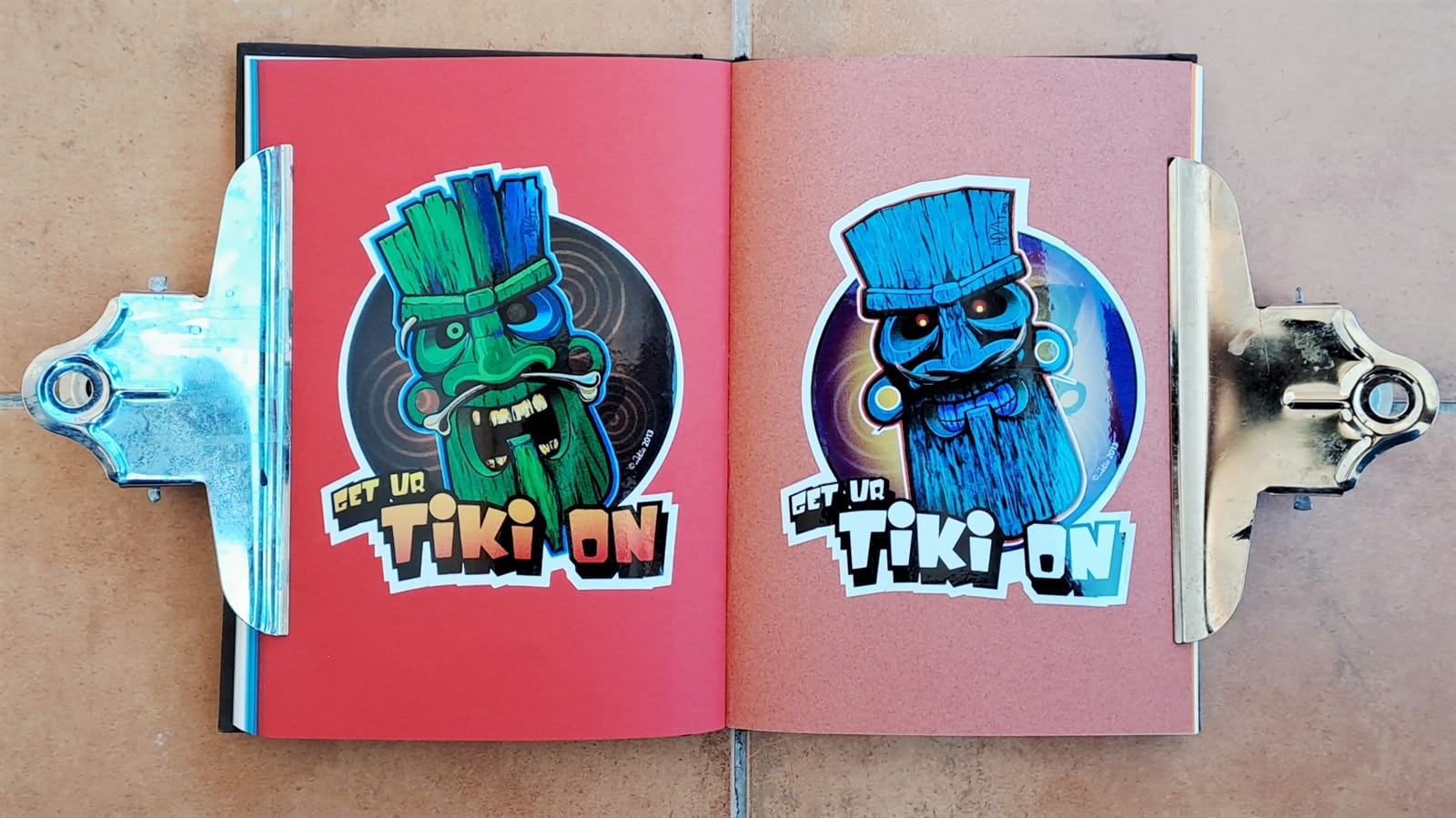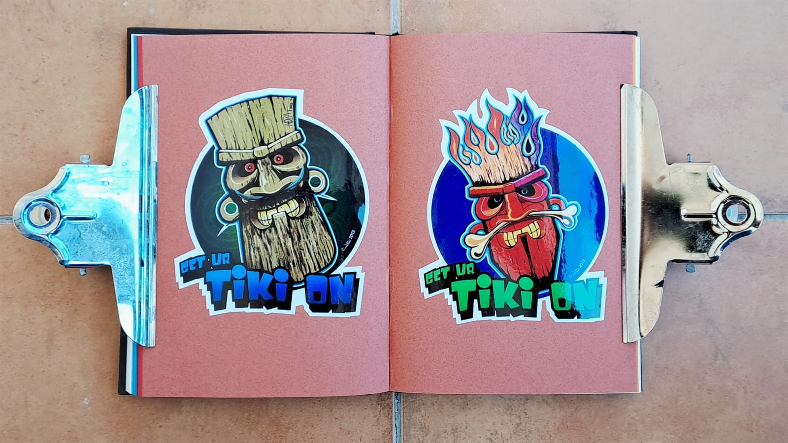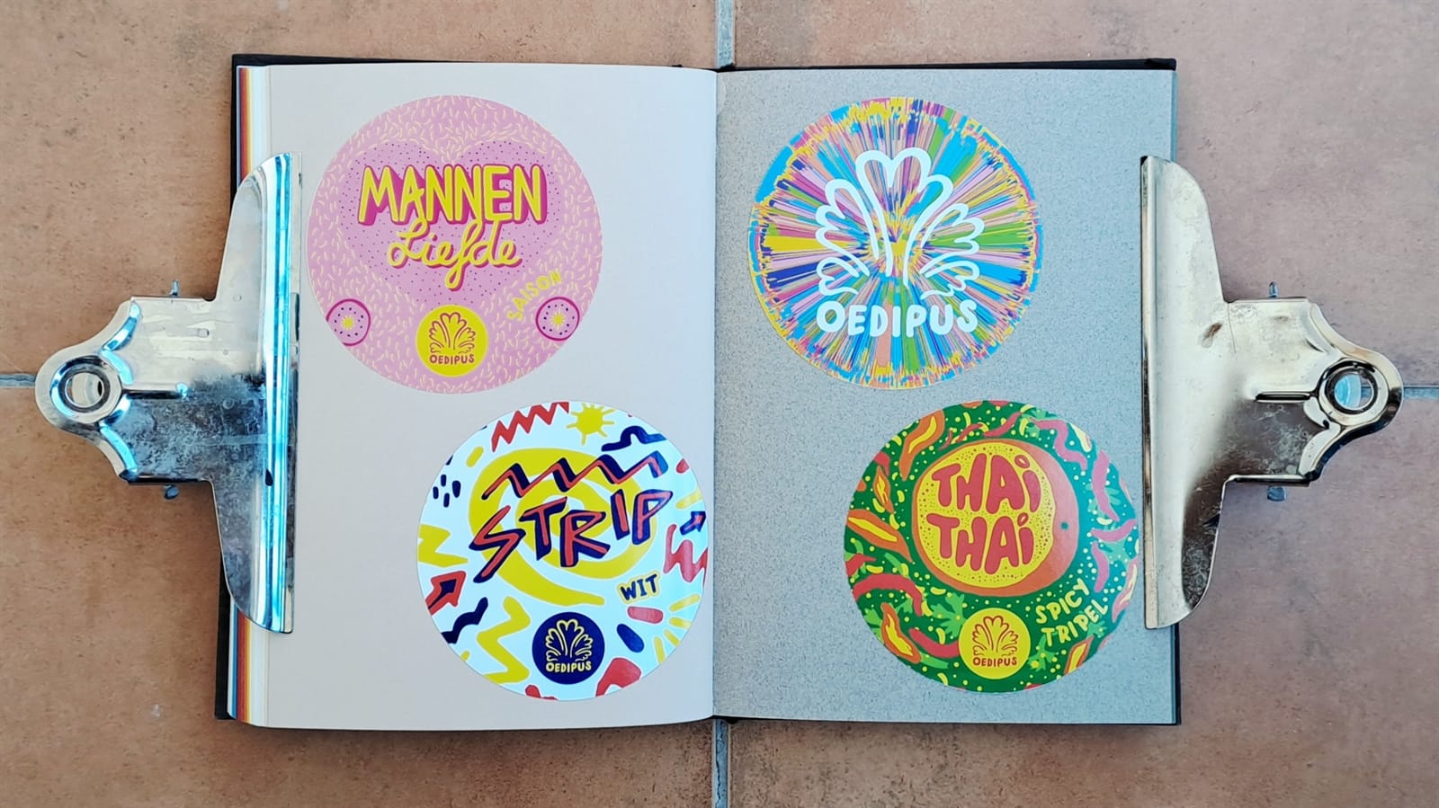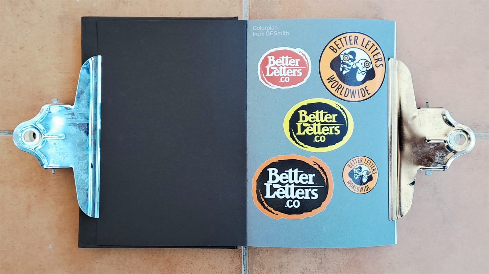 Stickers, stickers, stickers filling the pages of this G . F Smith Colorplan sampler.