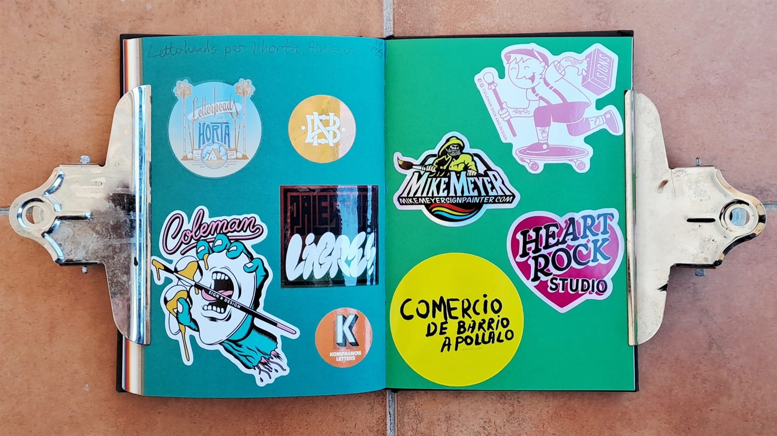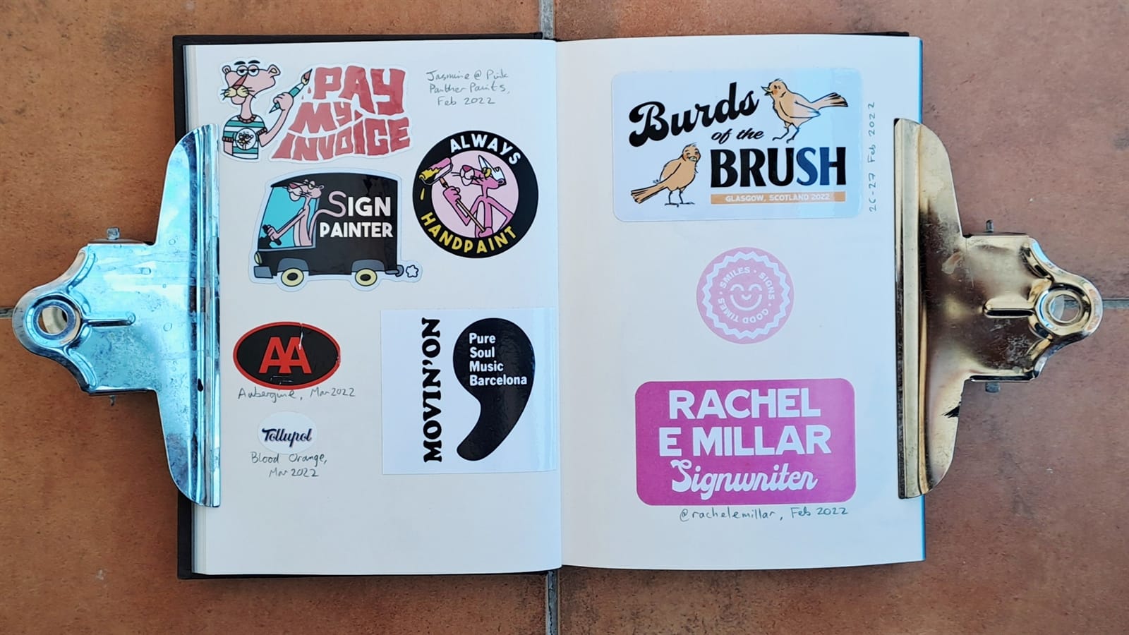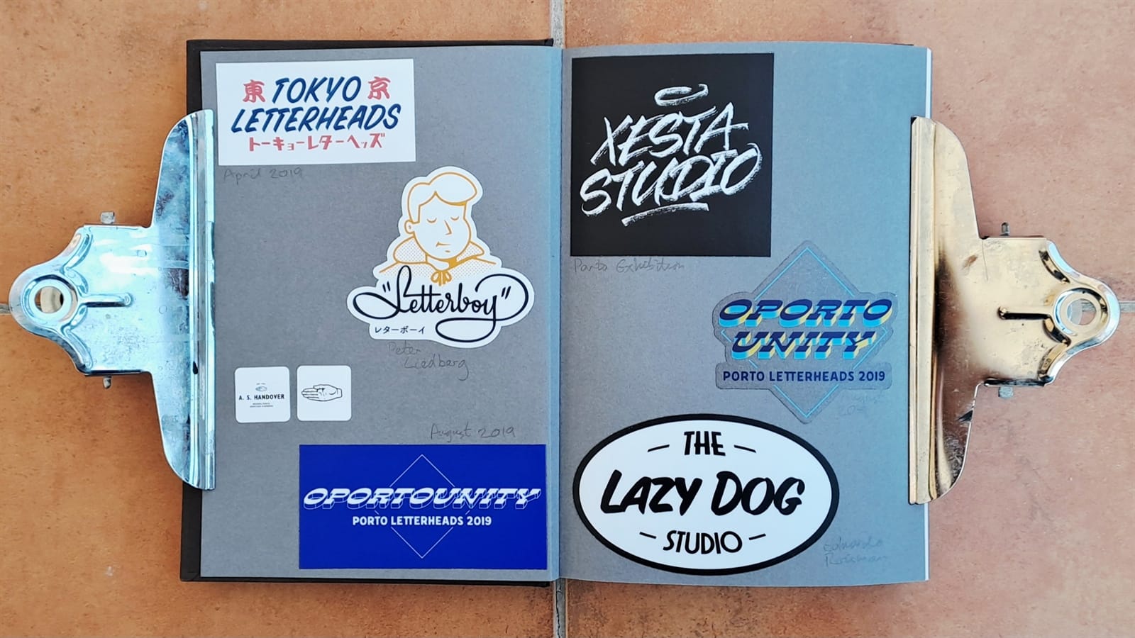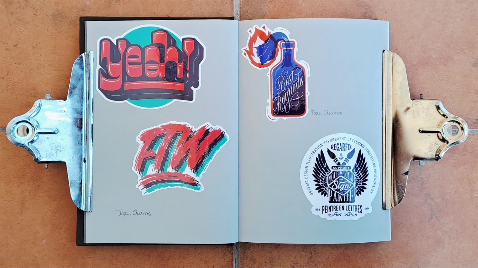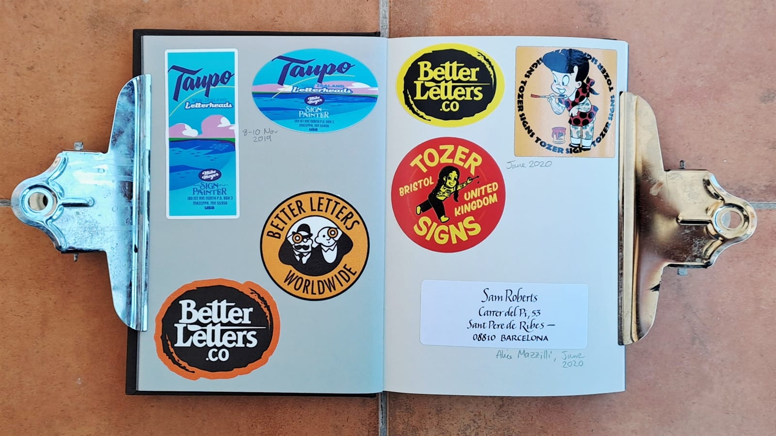 Some vintage Better Letters stickers, including Mike Meyer casting us as famed bagel makers, the Einstein Bros.I must have had some spare stickers from Tokyo Letterheads as these appear on both the photo album above and in the opening pages of my sticker album. There’s then the collection of stickers collected at the 2019 Porto Letterheads. Also on this spread are Letterboy (Tokyo Letterheads host), A.S. Handover, and Xesta Studio.‘Fearless’ by Halfstudio (check out their BLAG Meet talk) and three from Joan Quiros (continued below).More from Joan Quiros and ‘Support Your Local Sign Painter’ from Regarfix.More vintage Better Letters, Mike Meyer pieces for the 2019 New Zealand Letterheads, and the first of a few appearances from Tozer Signs. The address label is one that I made after receiving a beautifully written letter from Alice Mazzilli, but please don’t send any stickers there as I’ve moved twice since!