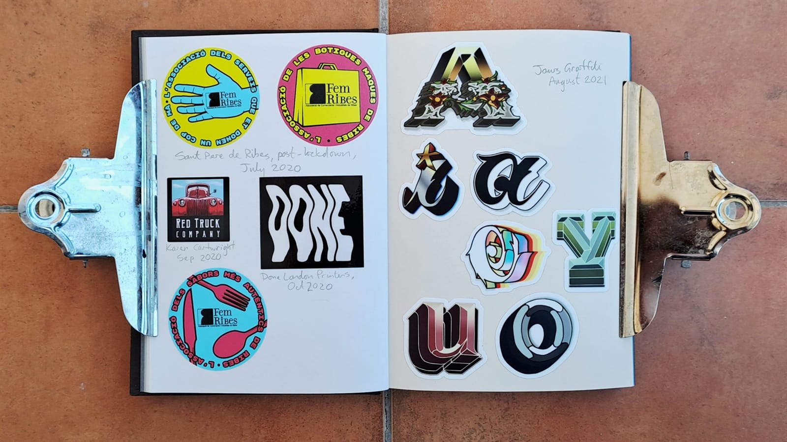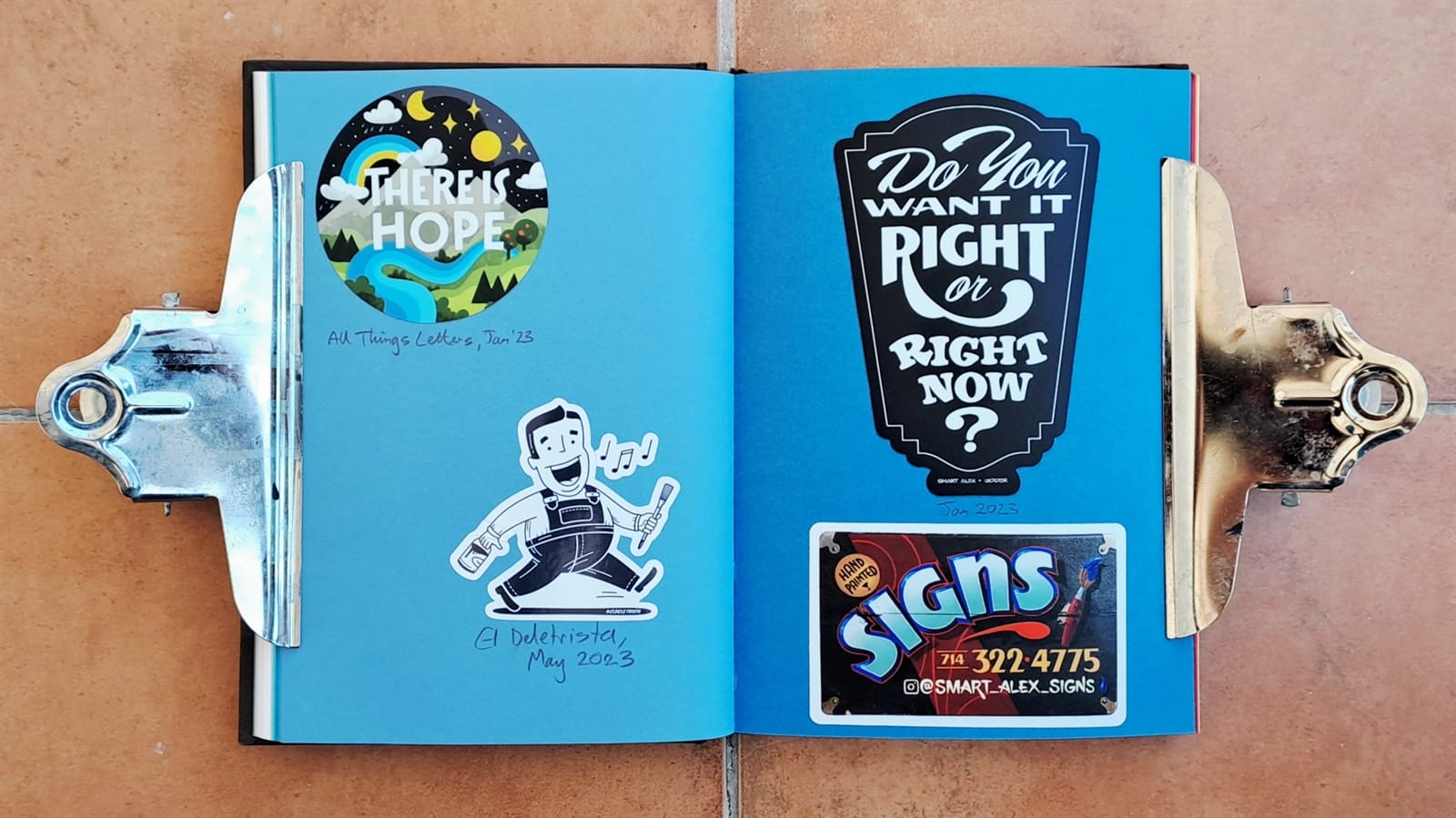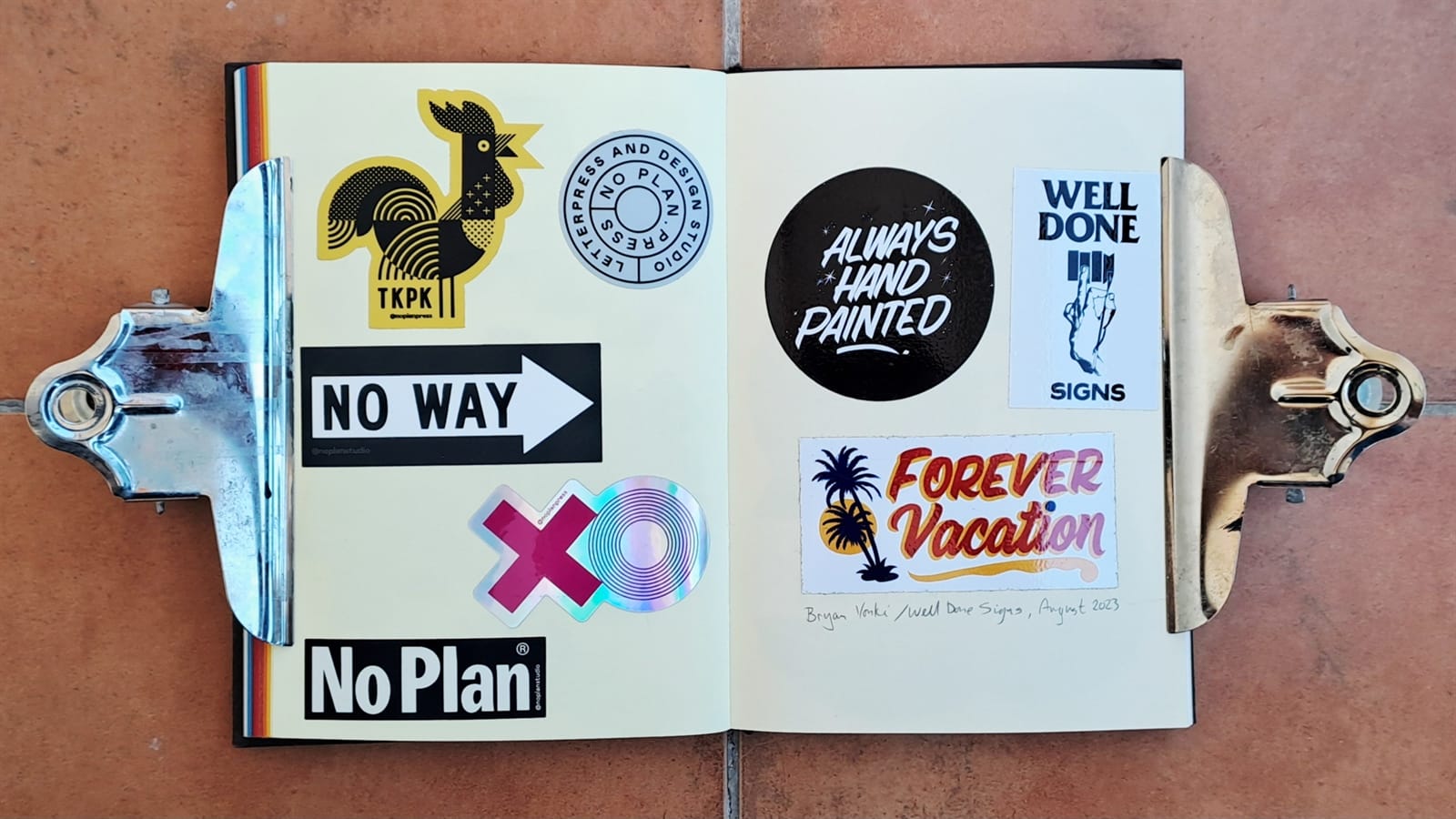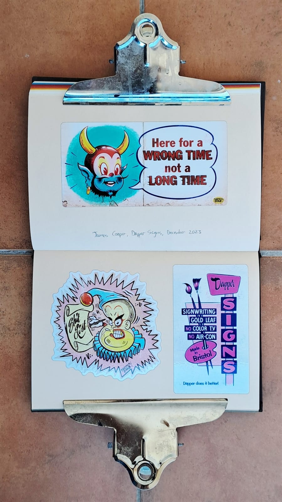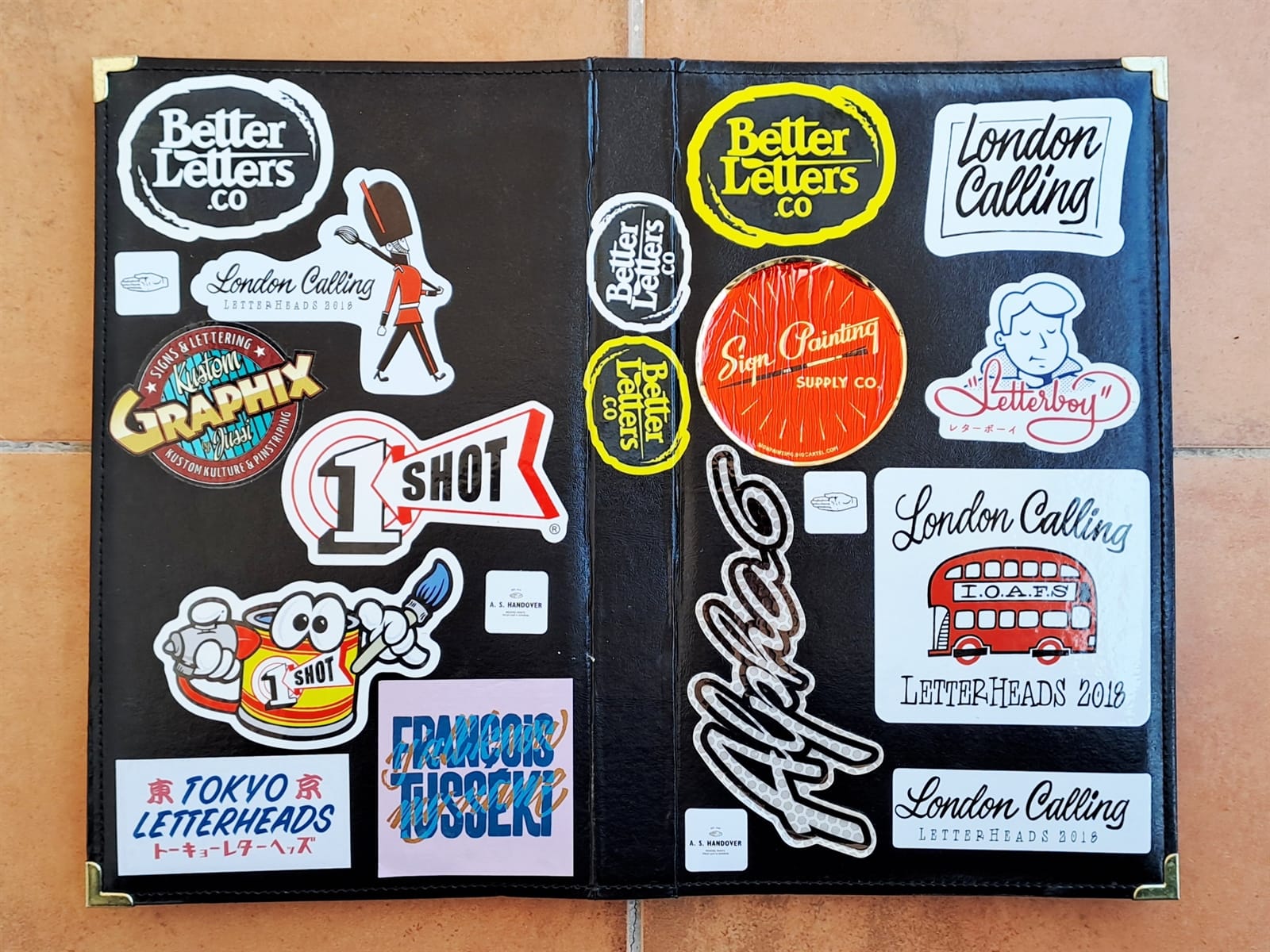 Surprisingly, I’m still getting some limited use from my 2008 laptop (left) as it still has a DVD drive. On the right is the cover of a photo album that’s full of sign and sign painting-themed postcards. The stickers are all from around 2018–19 and those are all I have left from London Calling.