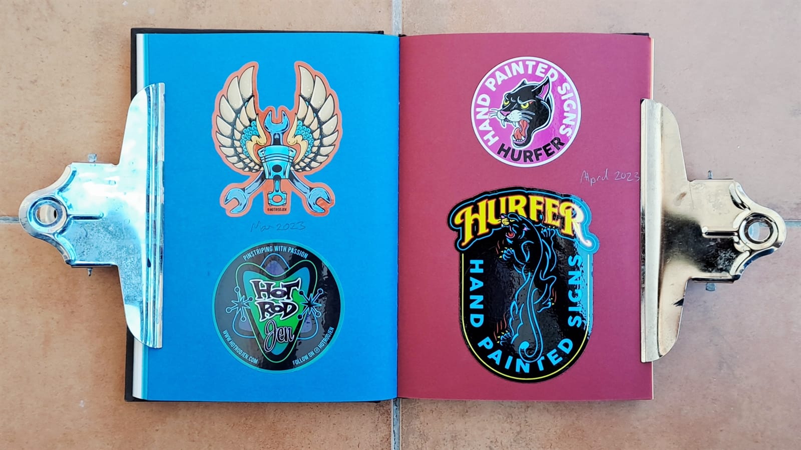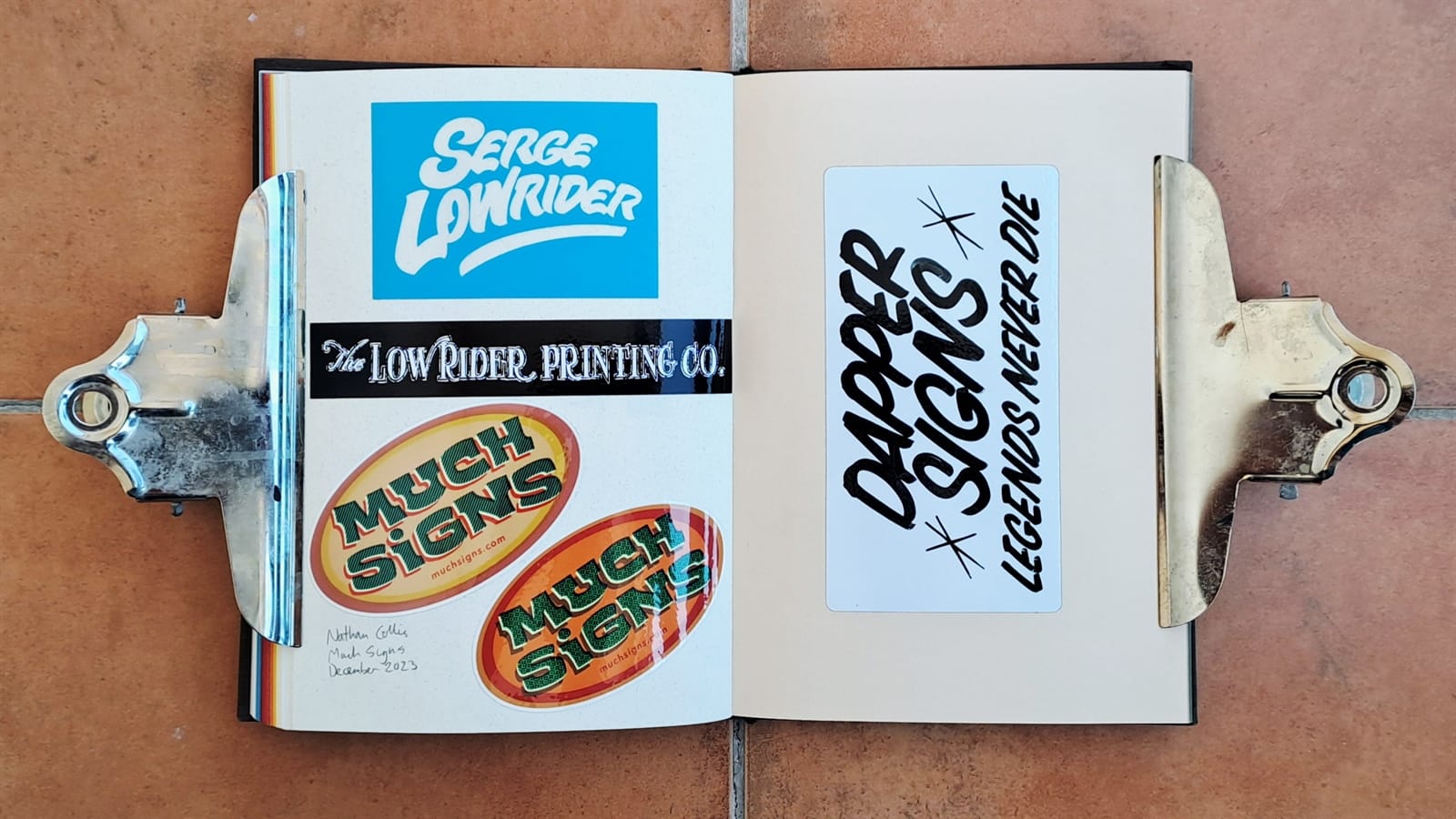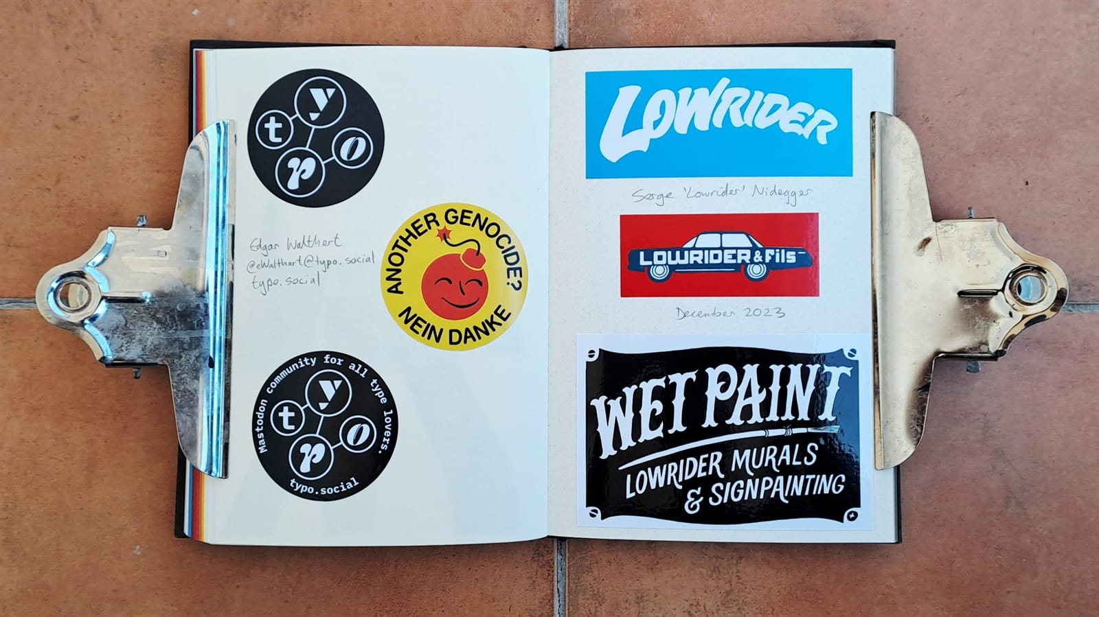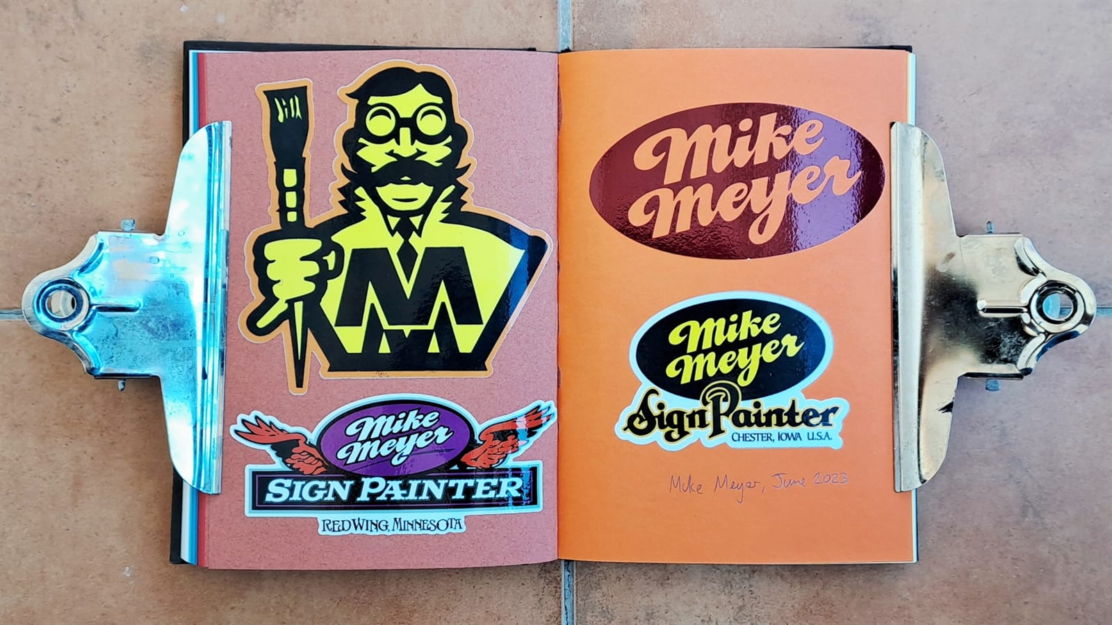 Surprisingly, I’m still getting some limited use from my 2008 laptop (left) as it still has a DVD drive. On the right is the cover of a photo album that’s full of sign and sign painting-themed postcards. The stickers are all from around 2018–19 and those are all I have left from London Calling.