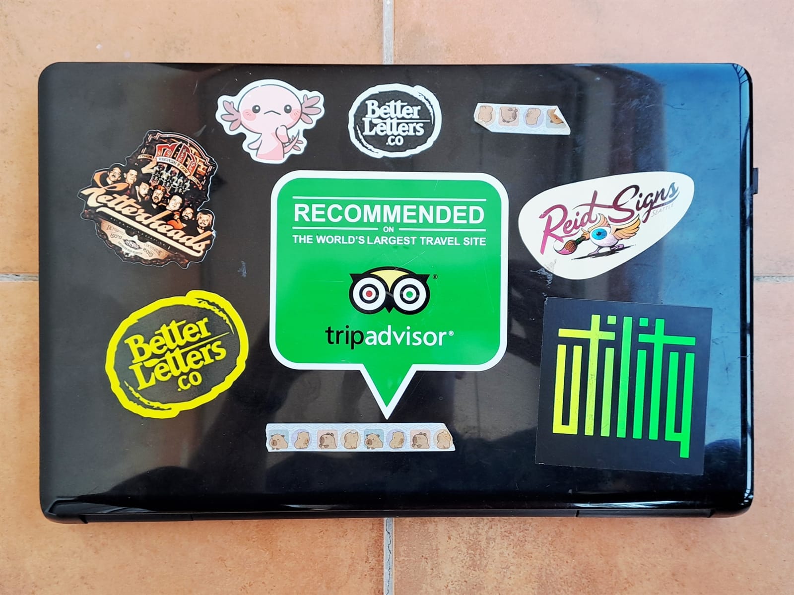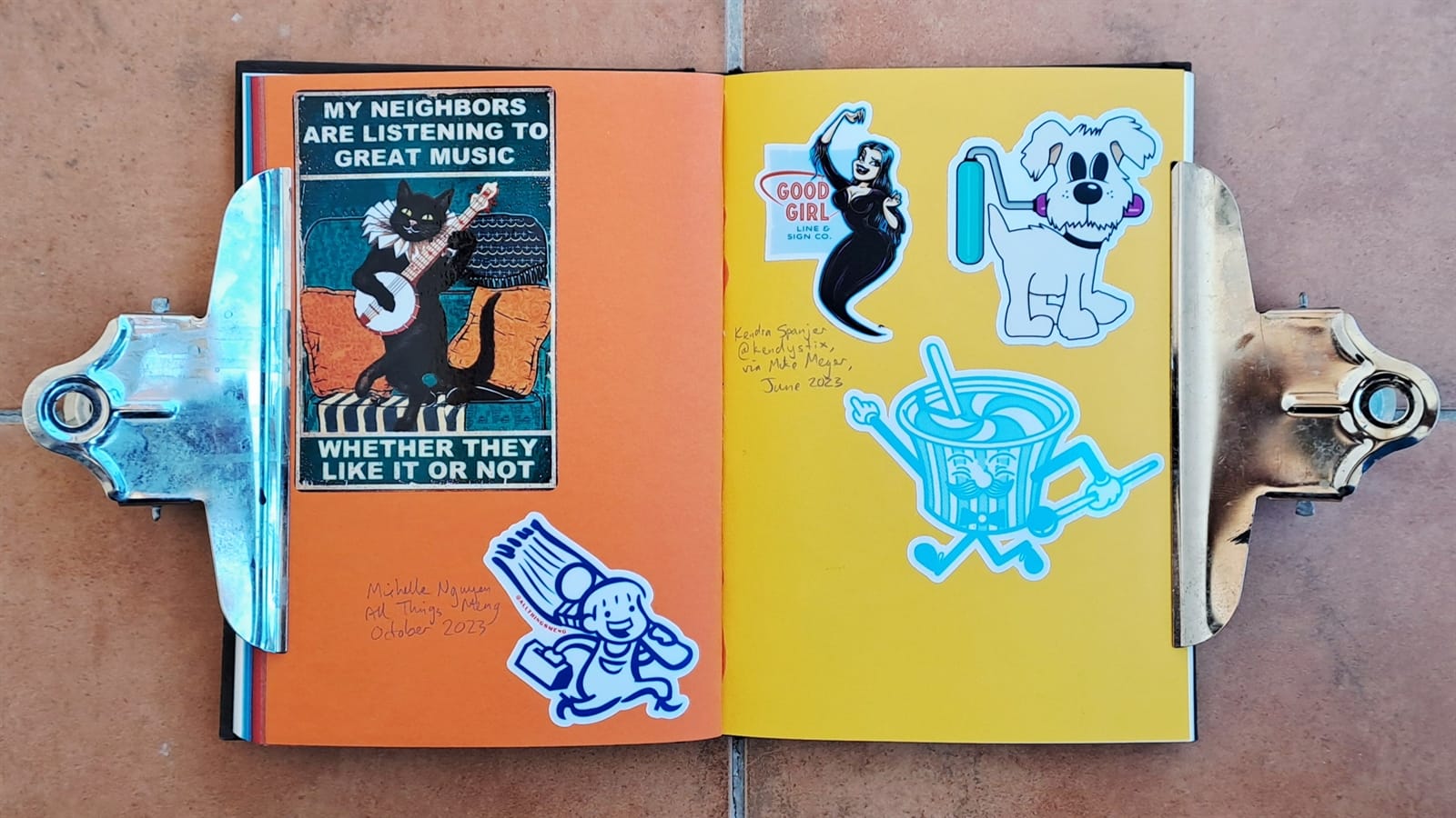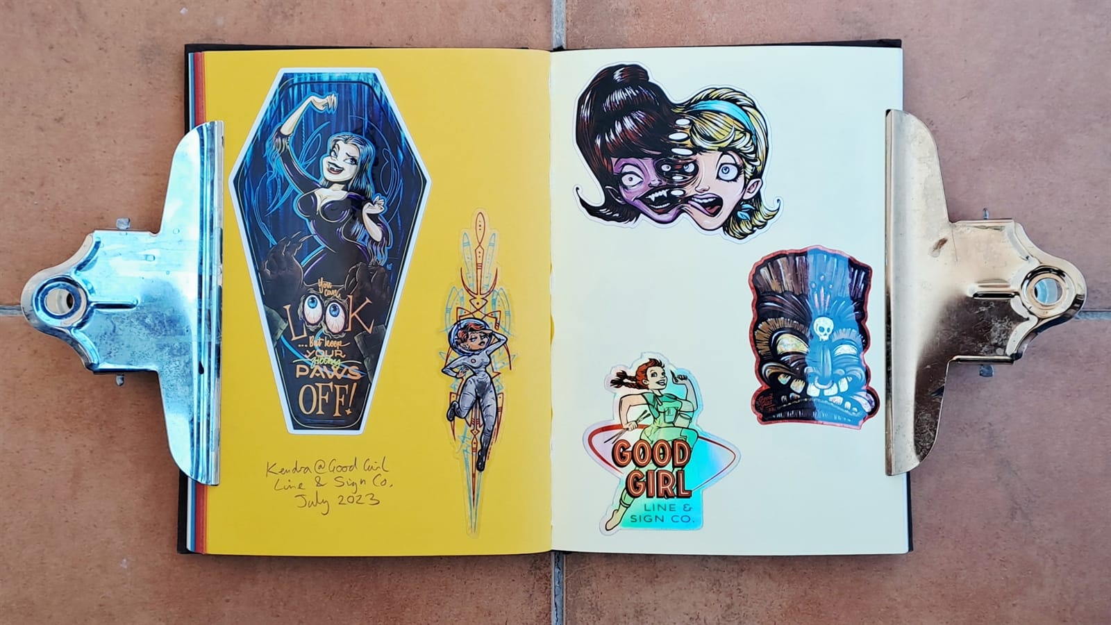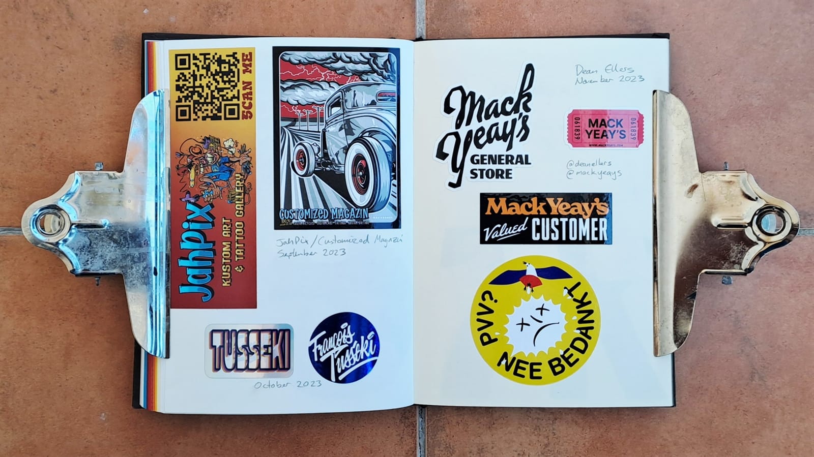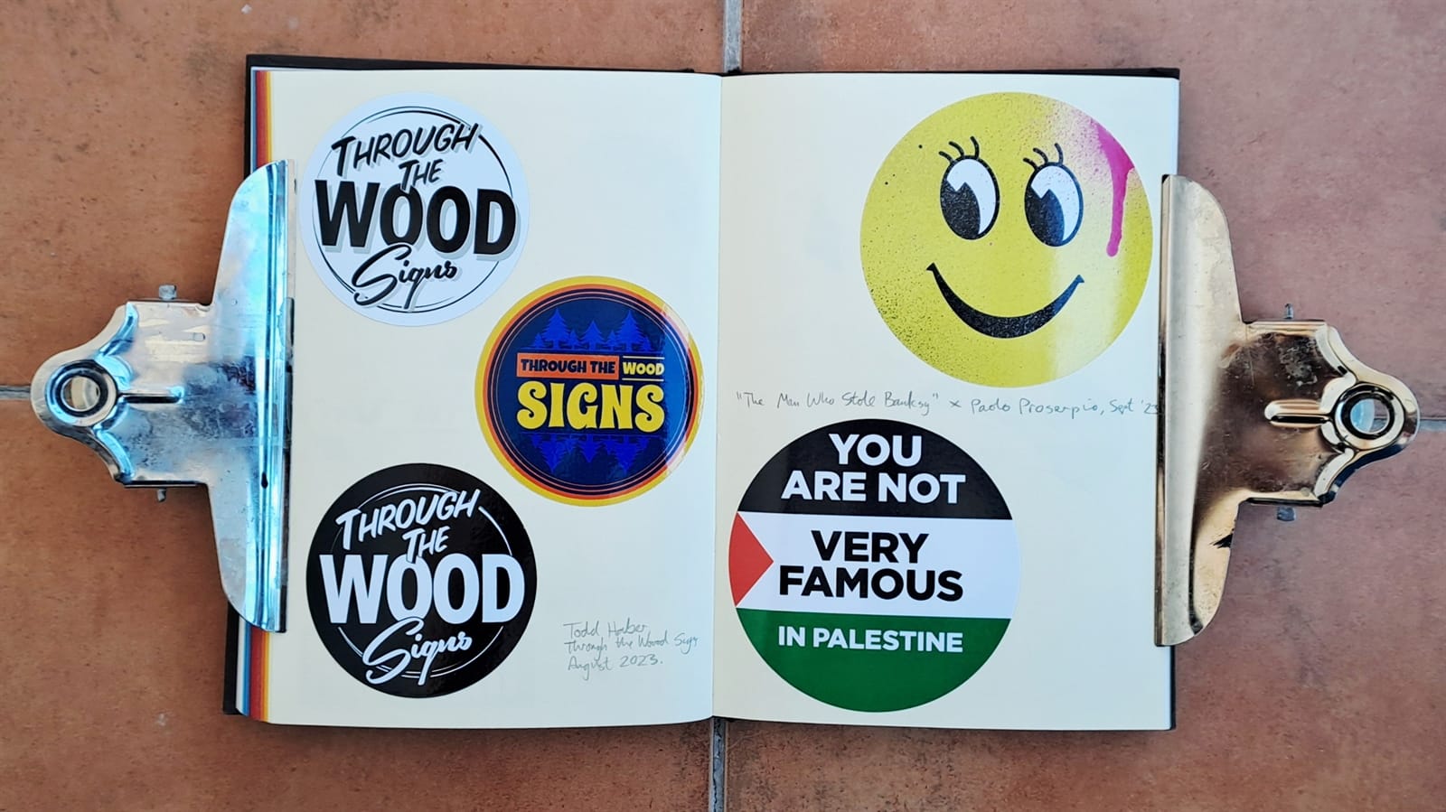 Surprisingly, I’m still getting some limited use from my 2008 laptop (left) as it still has a DVD drive. On the right is the cover of a photo album that’s full of sign and sign painting-themed postcards. The stickers are all from around 2018–19 and those are all I have left from London Calling.