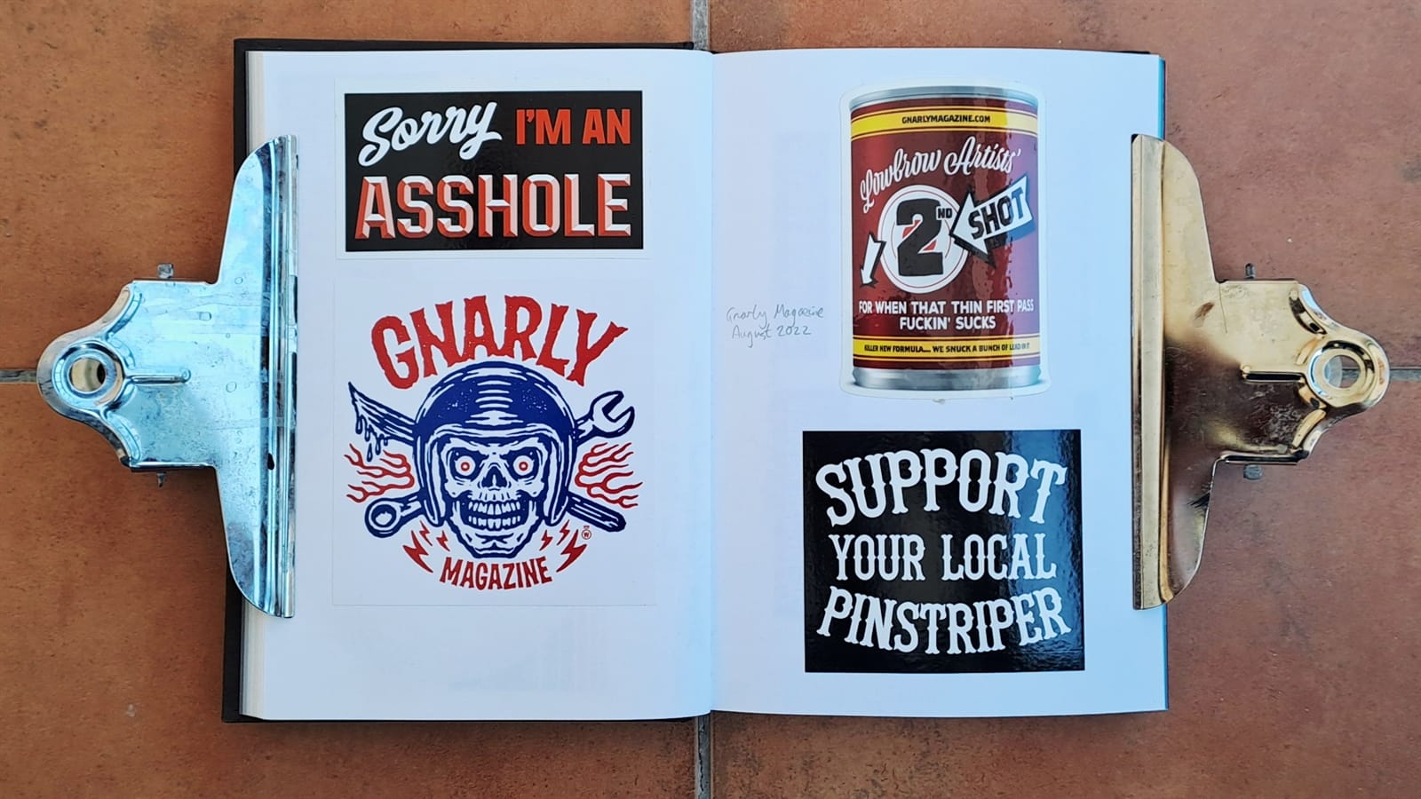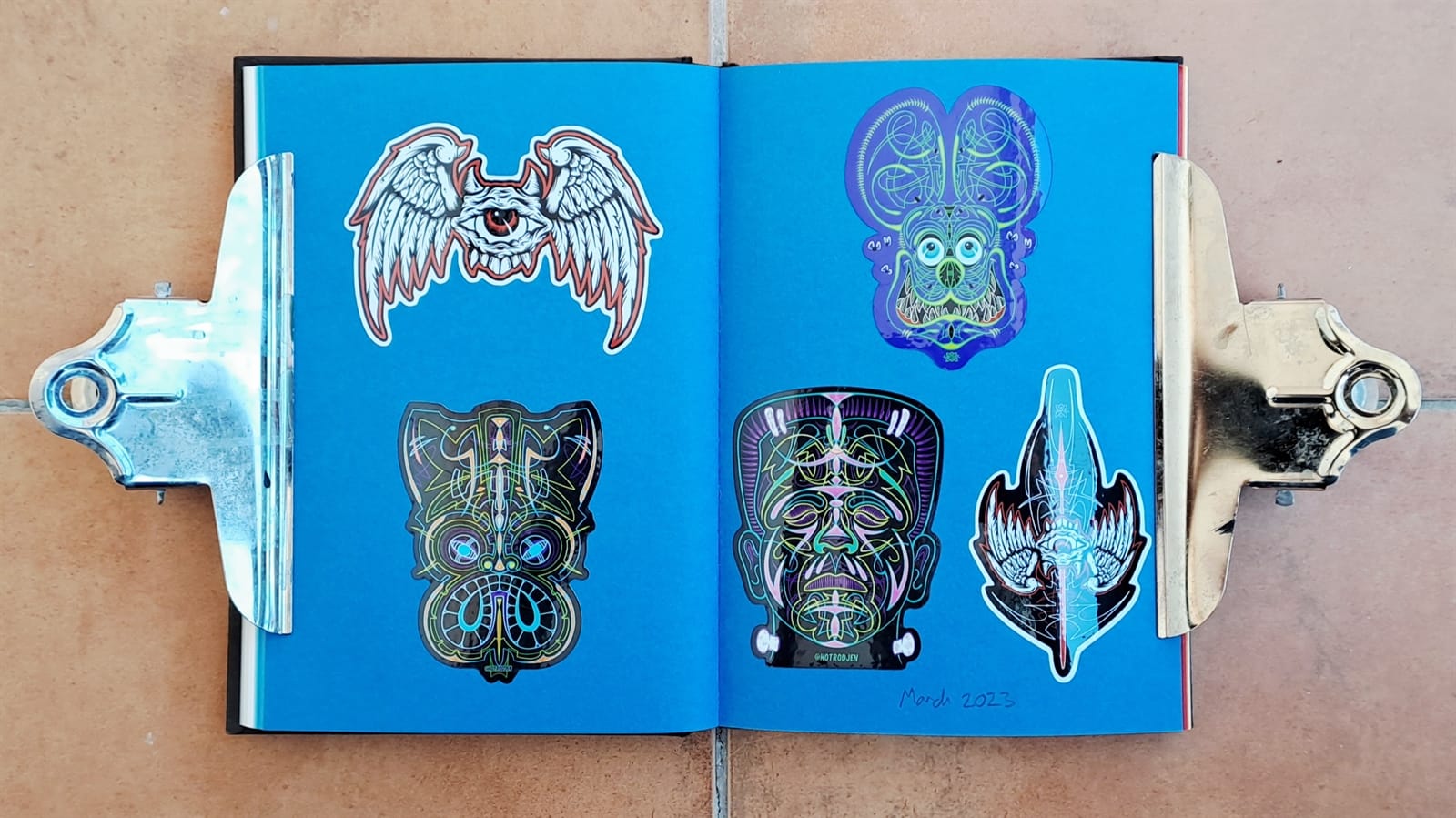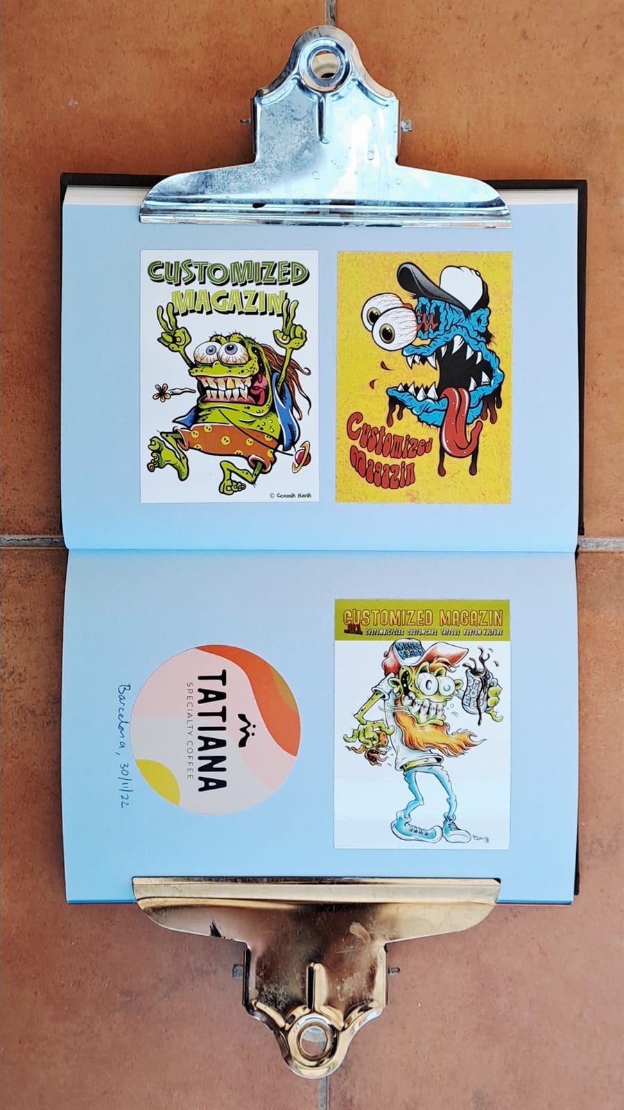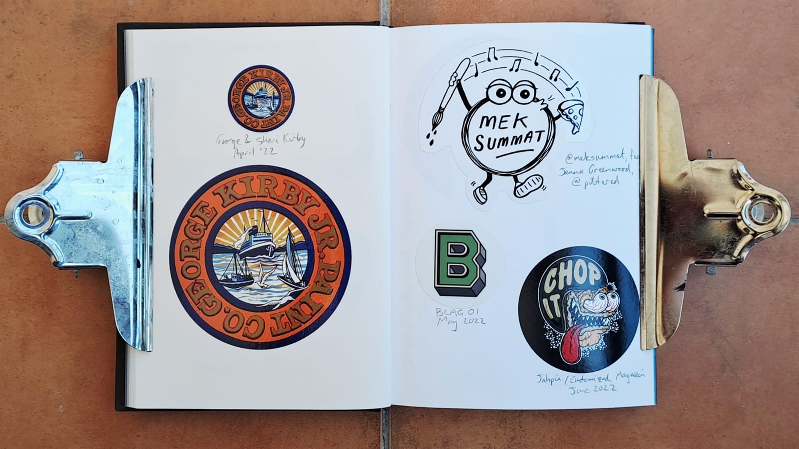 Another from Metro Gustavo and a set of five from Brush & Leaf.Fem Ribes (we make Ribes) is the local business association in my adopted town of Sant Pere de Ribes. These were part of their ‘shop local’ campaign during the pandemic. Sandwiched between them on the left page are stickers for Red Truck Company and printers Done London. On the right are the first of some from Jaws Graffiti, which continue overleaf.More Jaws Graffiti (left) and then two each from Francois Tusseki and Studio Miras from the 2021 Barcelona Letterheads.Moving into 2022, this sticker pack was received from Likemind Design.The Pink Panther makes a few appearances in the album, including these three from Pink Painter. Below those are one for a music shop in Barcelona and a couple of fruit stickers, but it looks like I decided against continuing to collect those. Then, on the right, are the first of a few entries from Rachel E Millar, including the first Burds of the Brush artwork from the meet in 2022.Two from the George Kirby Jr. Paint Co., Mek Summat featuring Jenna Greenwood, my first ever BLAG sticker experiment, and ‘Chop It’ from Jahpix / Customized Magazine.From Gnarly Magazine.