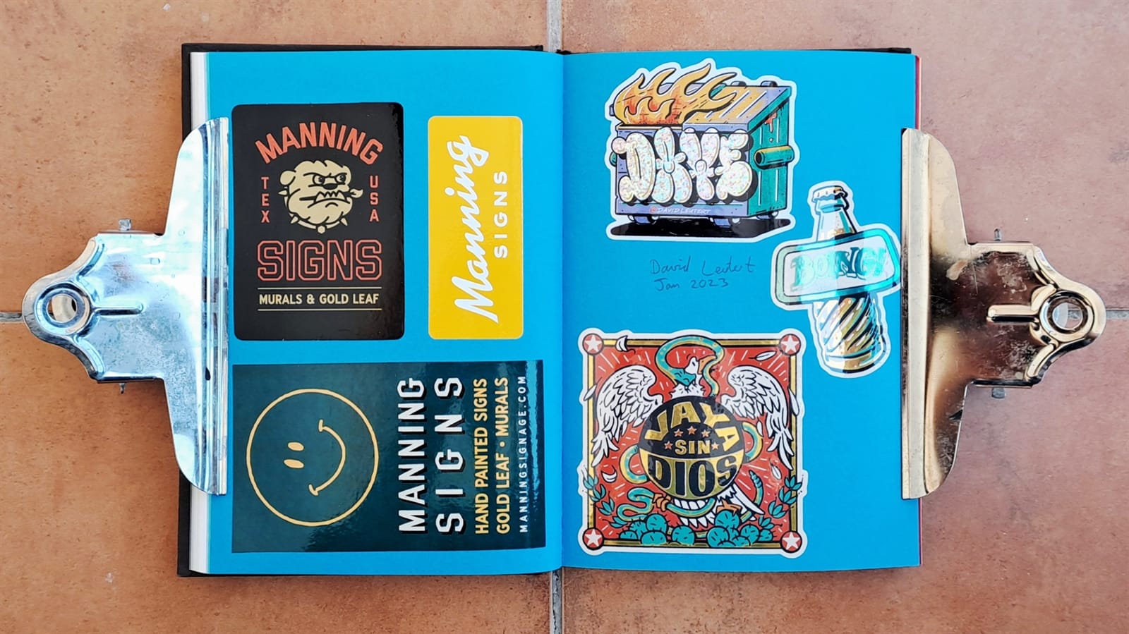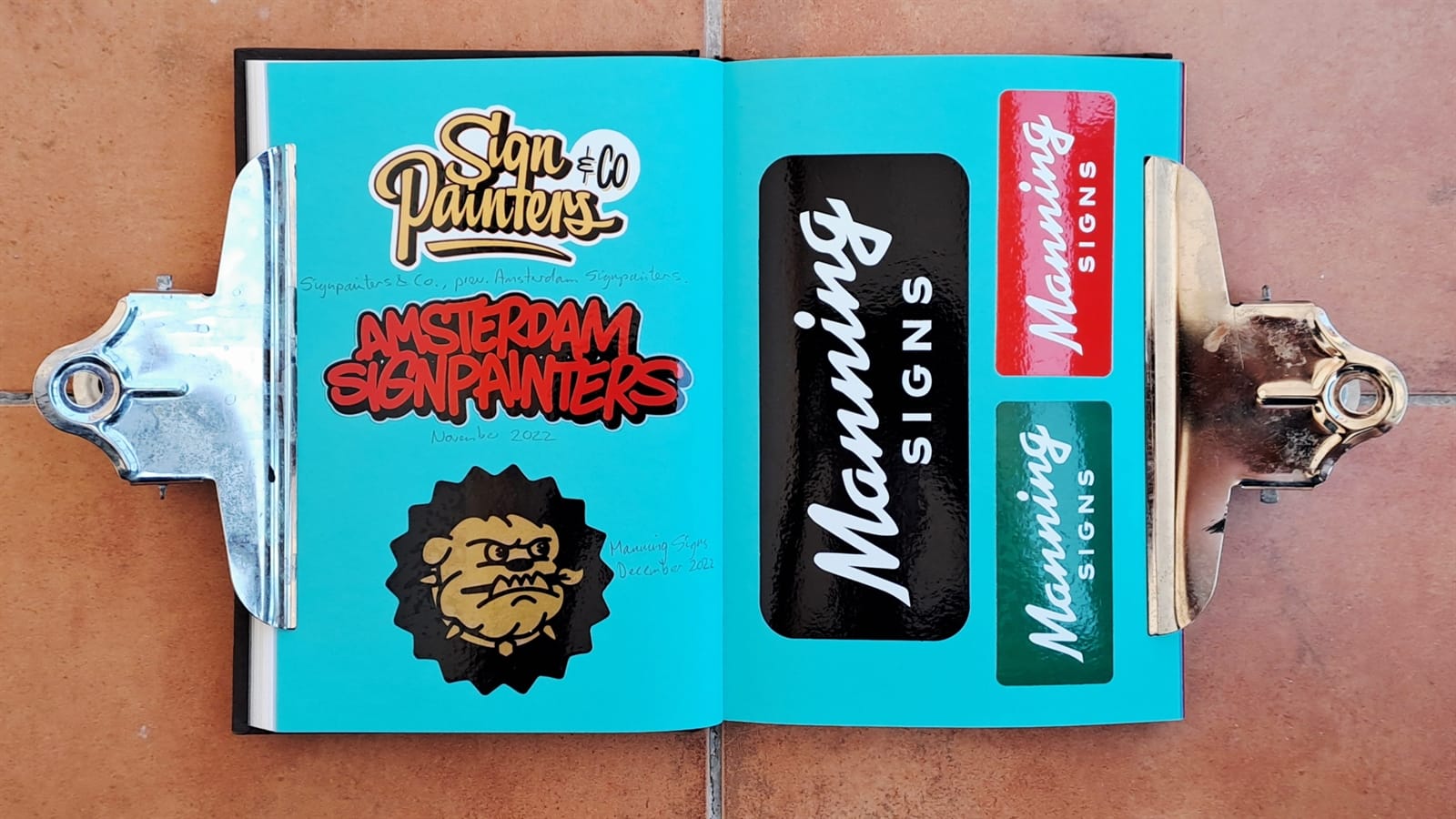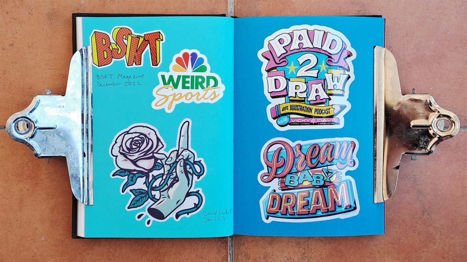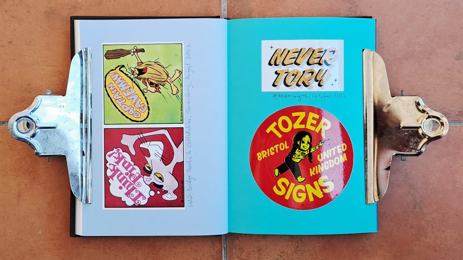 This Pink Panther and Captain Caveman double was an impulse purchase from Welsh Bridge Books & Collectibles in Shrewsbury, Shropshire, while visiting in August 2022. And Tozer’s back! Amsterdam Signpainters (also once known as Sign Painters & Co.) alongside the bullish Manning Signs.I honestly can’t remember how/why I got stickers for basketball magazine BSKT and Weird Sports, but the other pieces on this spread came from David Leutert not long after illustrating the ‘Playful Pangrams for Sign Painters’ article.More Manning Signs (left) and David Leutert.