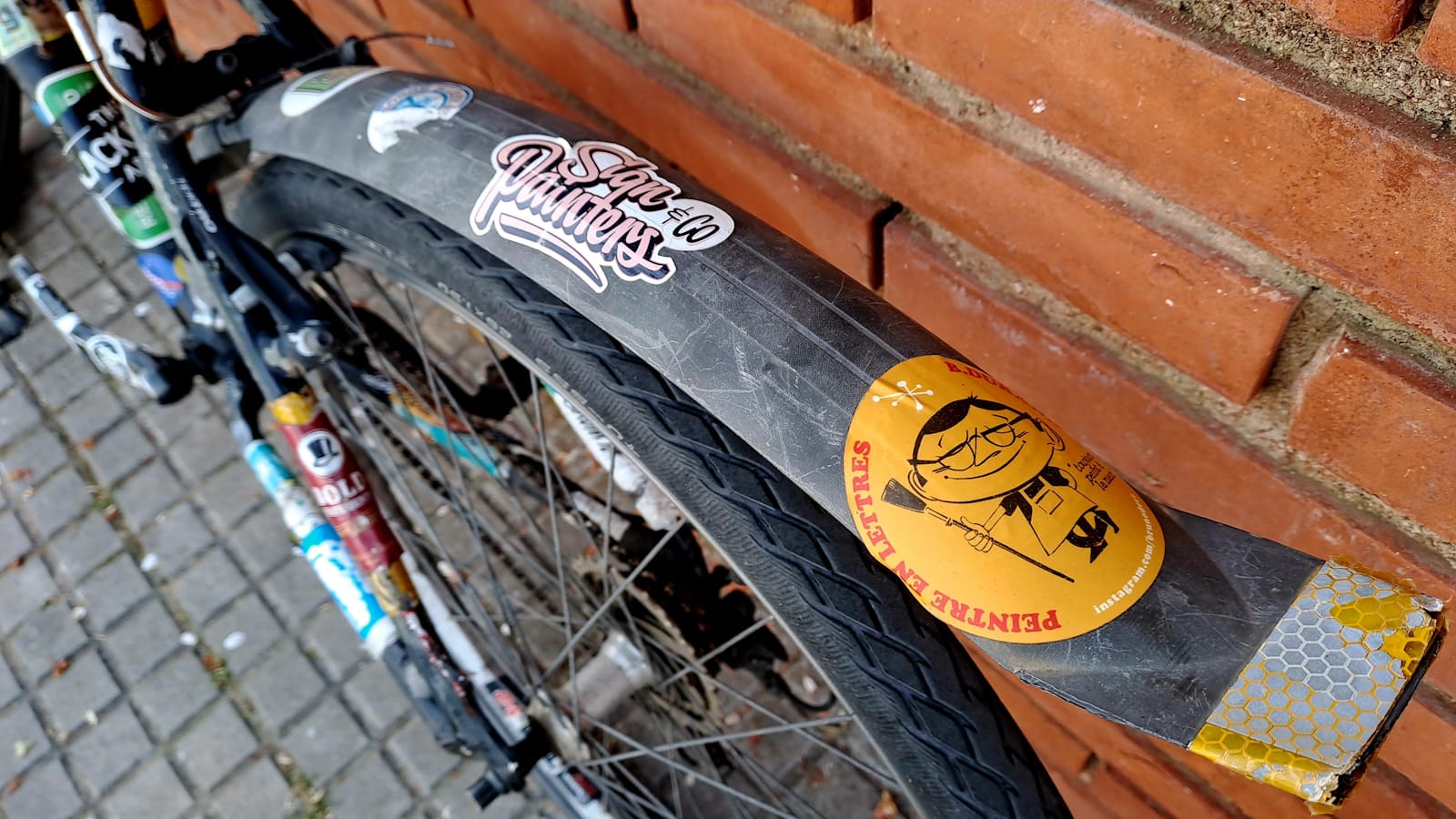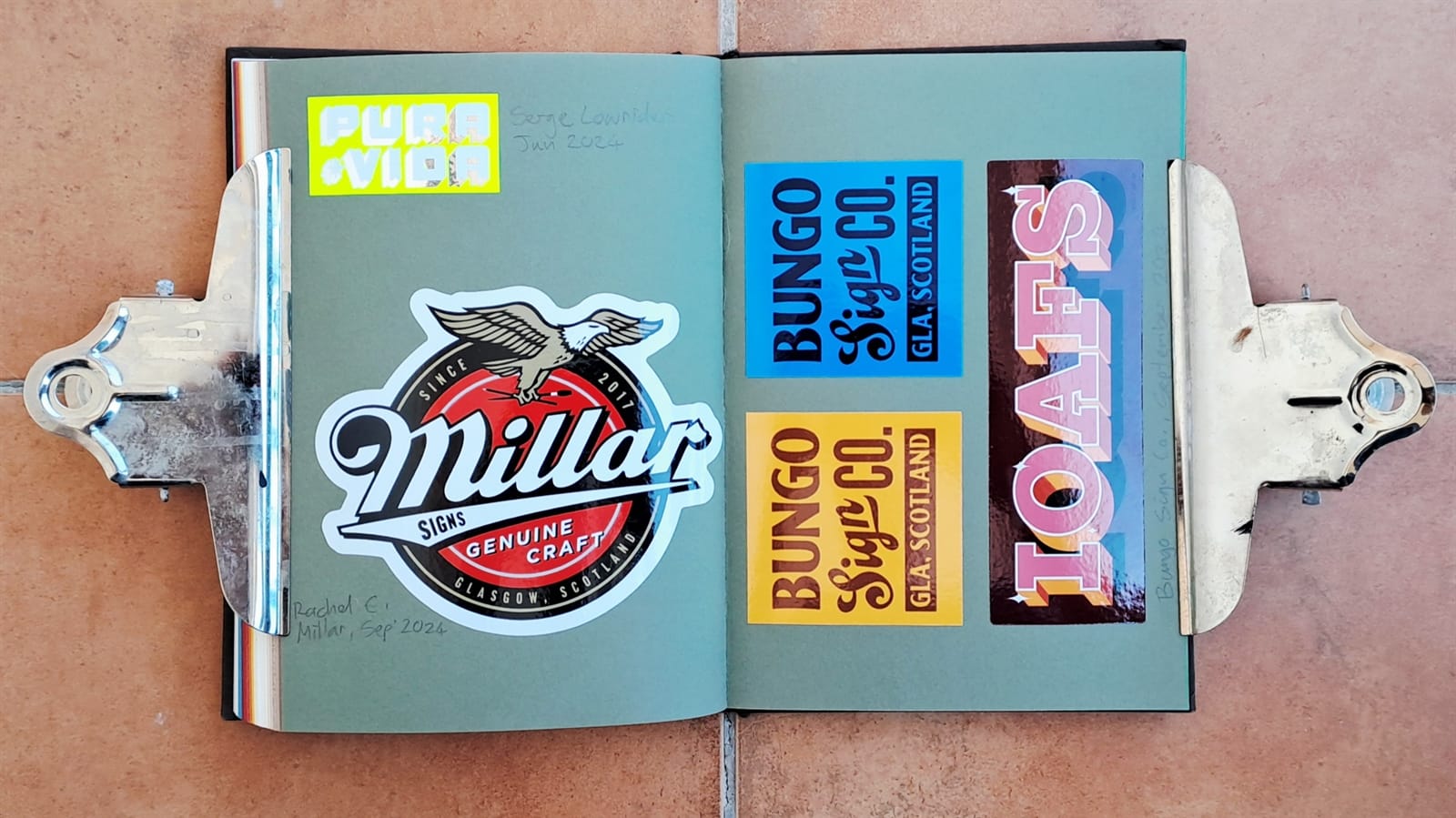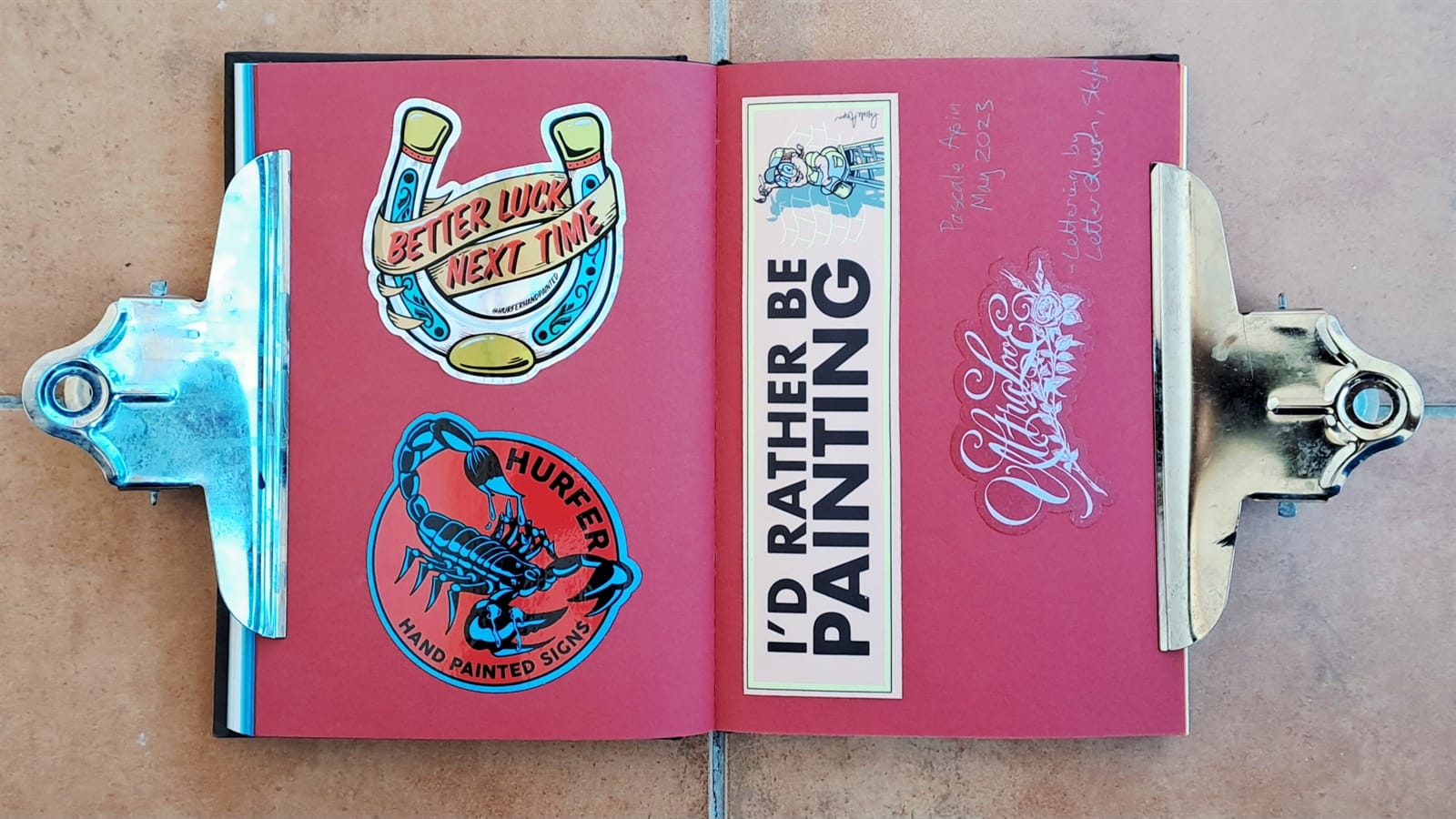 For the last seven years I’ve been filling the pages of the book with what is now a collection of over 400 stickers, mostly for sign painters. (Yes, I’m just a fan boy really!) When I have doubles, the extras go onto my bike, which was another place I used to put stickers before the album.